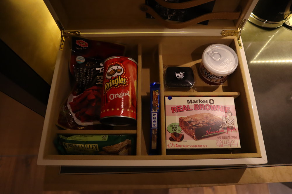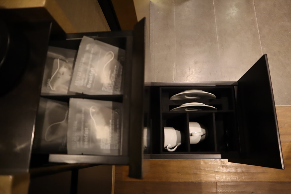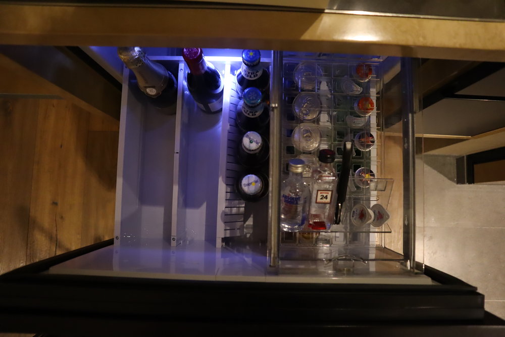 The minibar is quite ergonomic, with a full set of snacks, drinks, coffee and tea, and glassware hidden away in a series of drawers and cupboards.