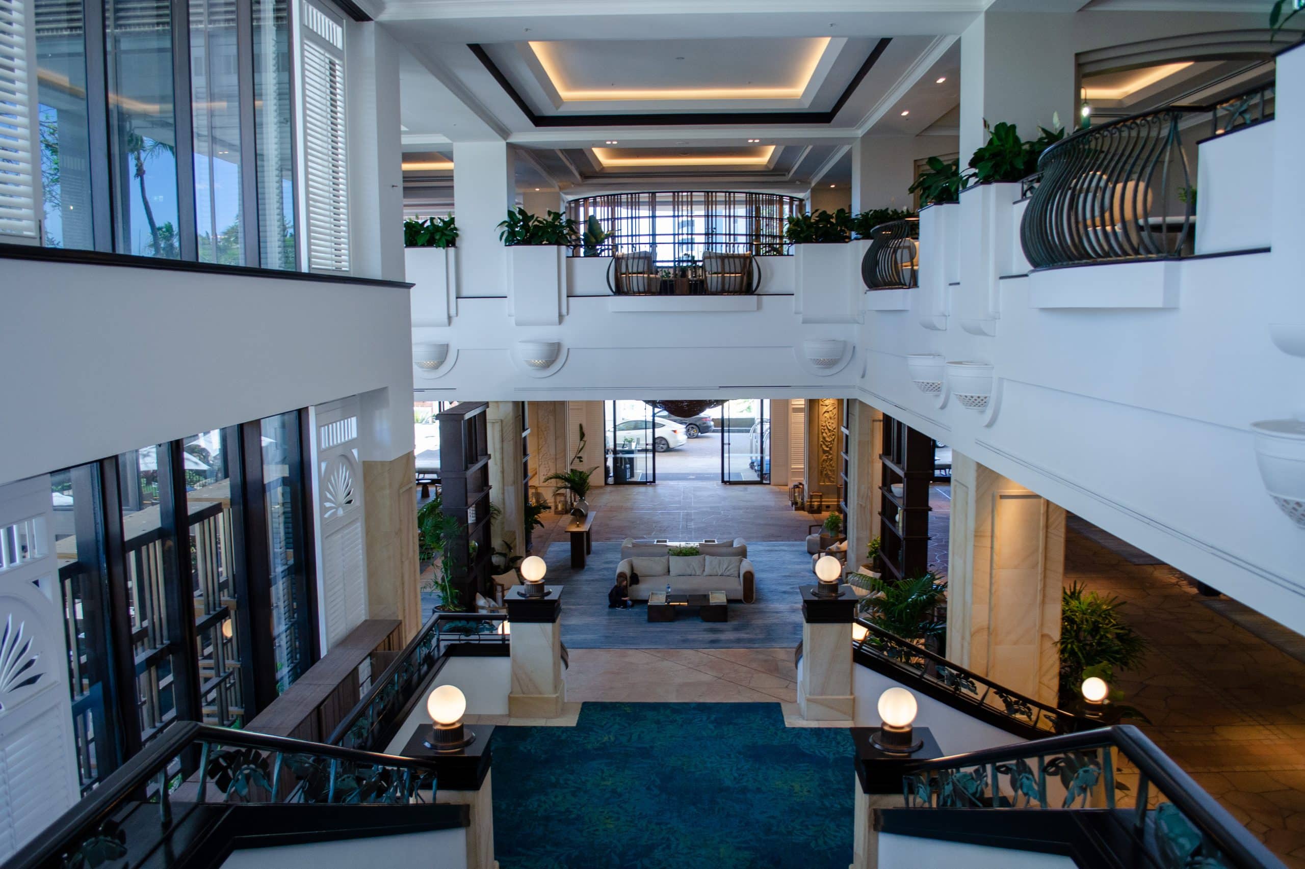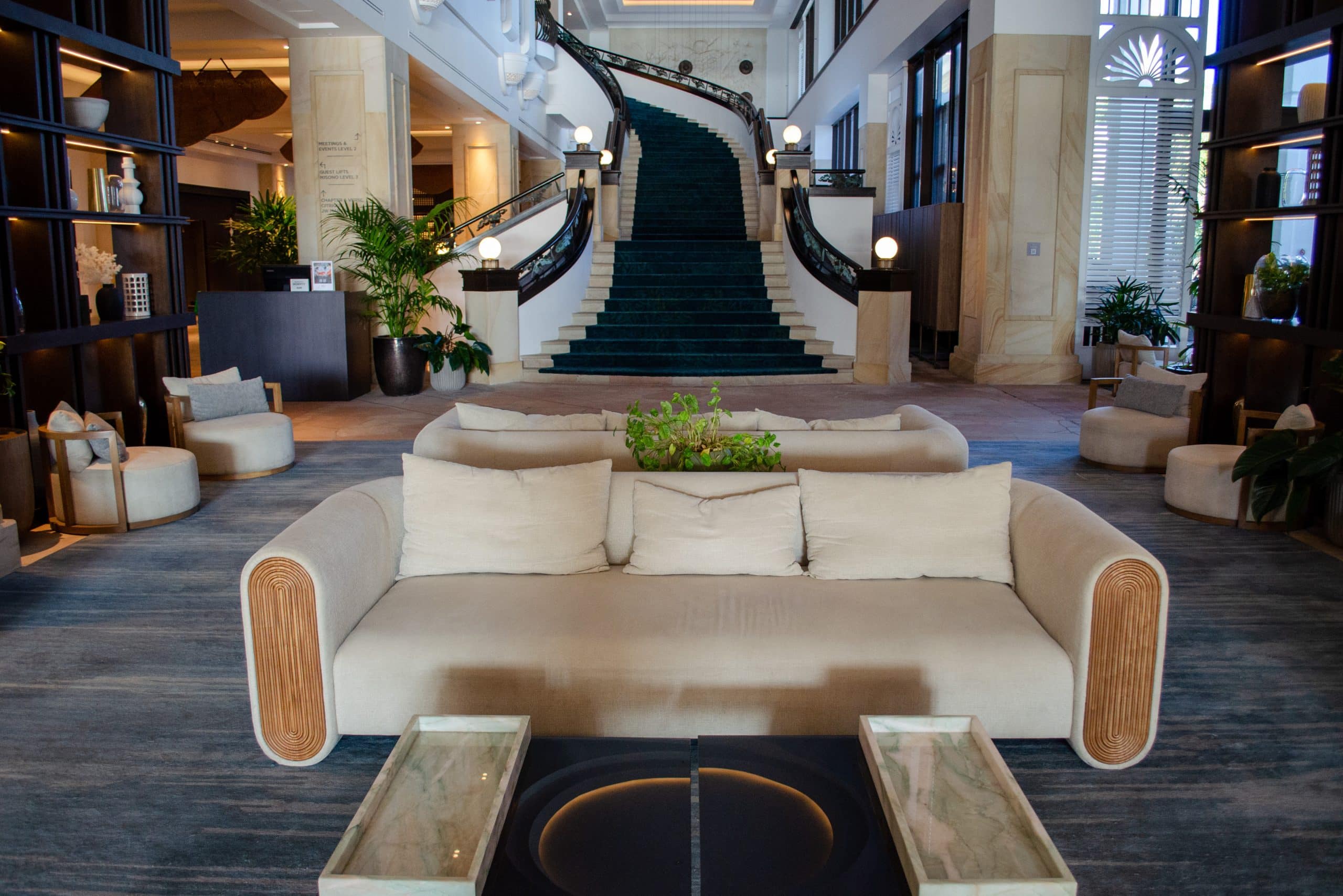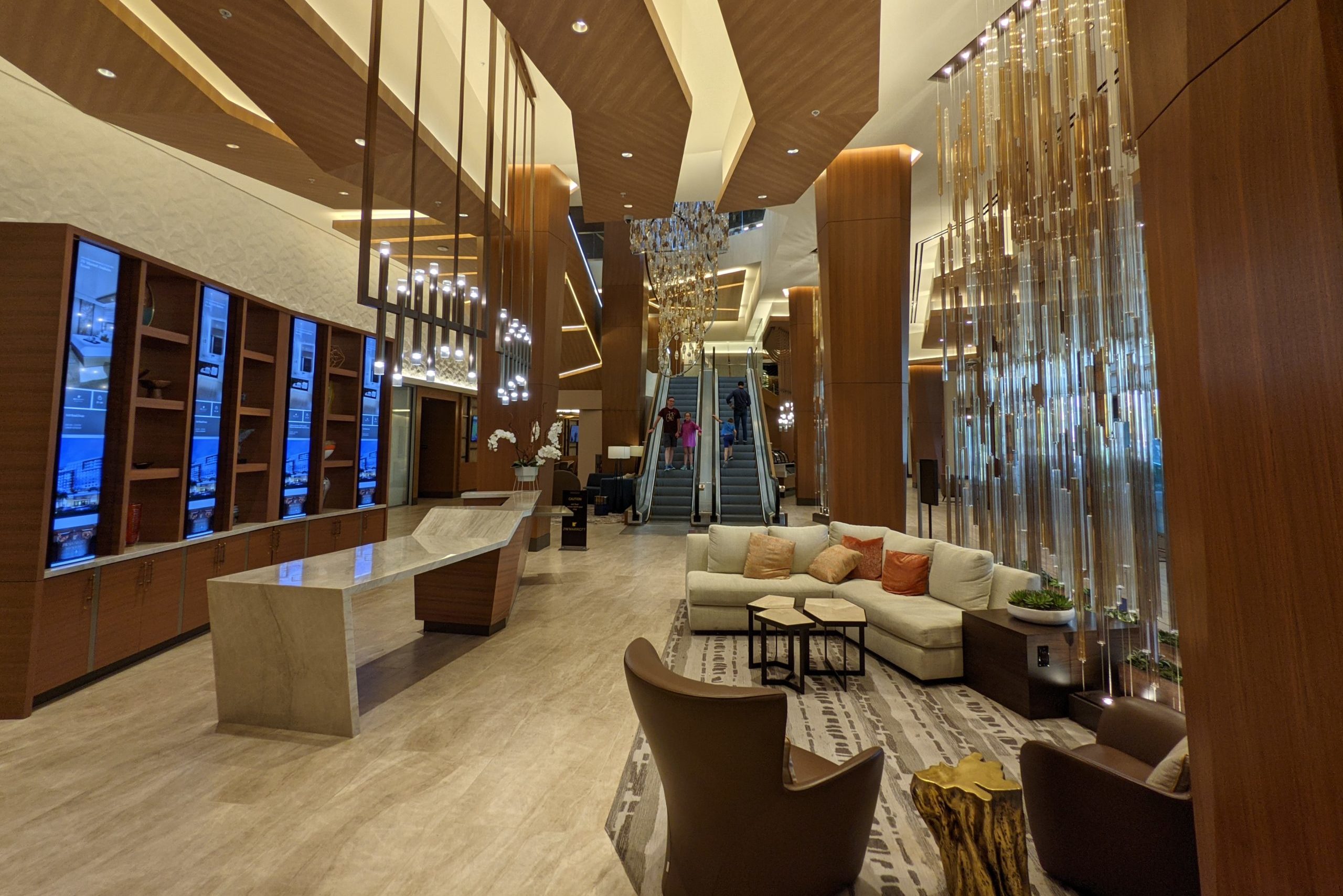 The automatic doors open up to a beautiful lobby lounge, with a grand staircase that mimics a cascading waterfall as the main focal point.