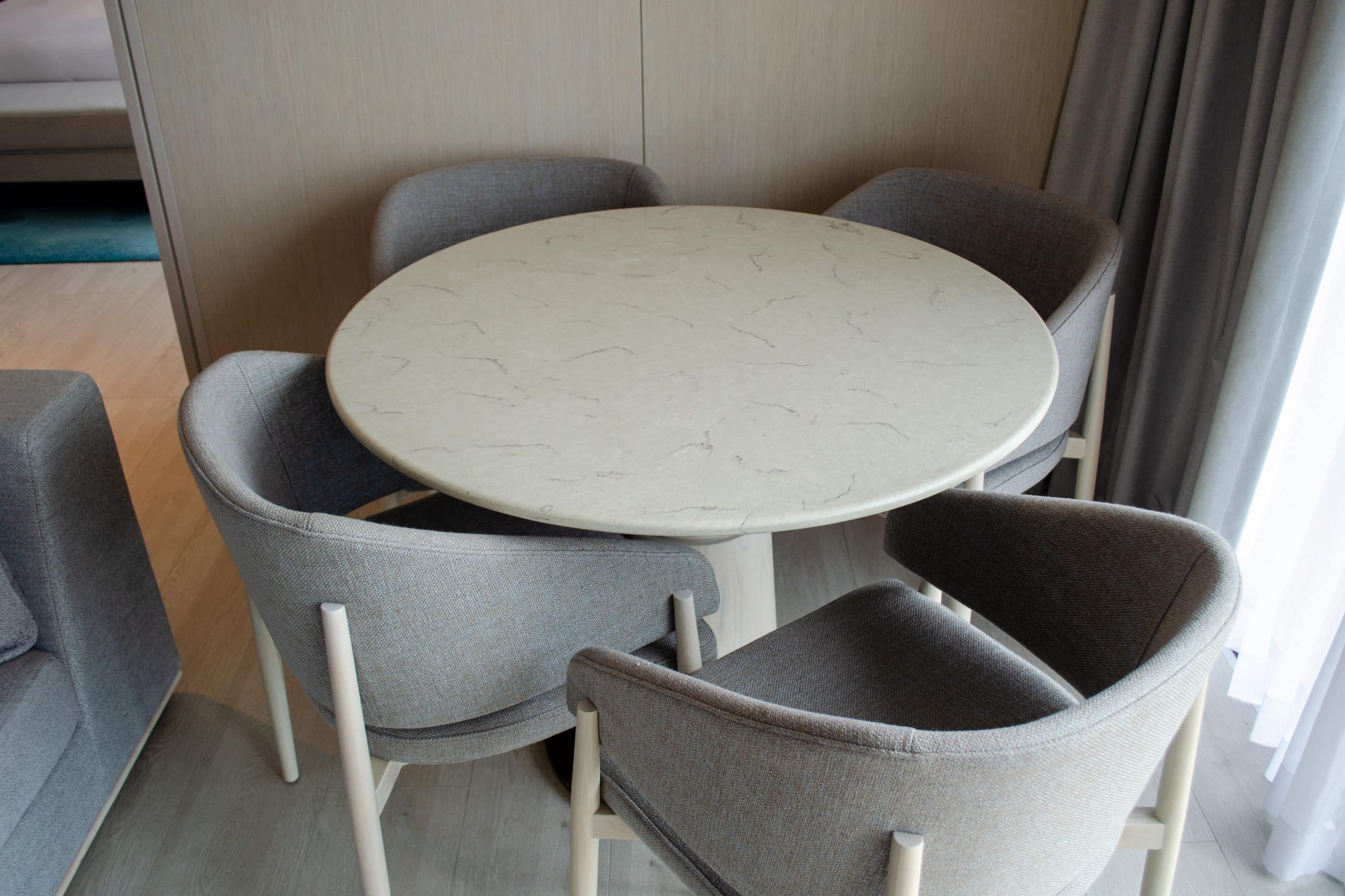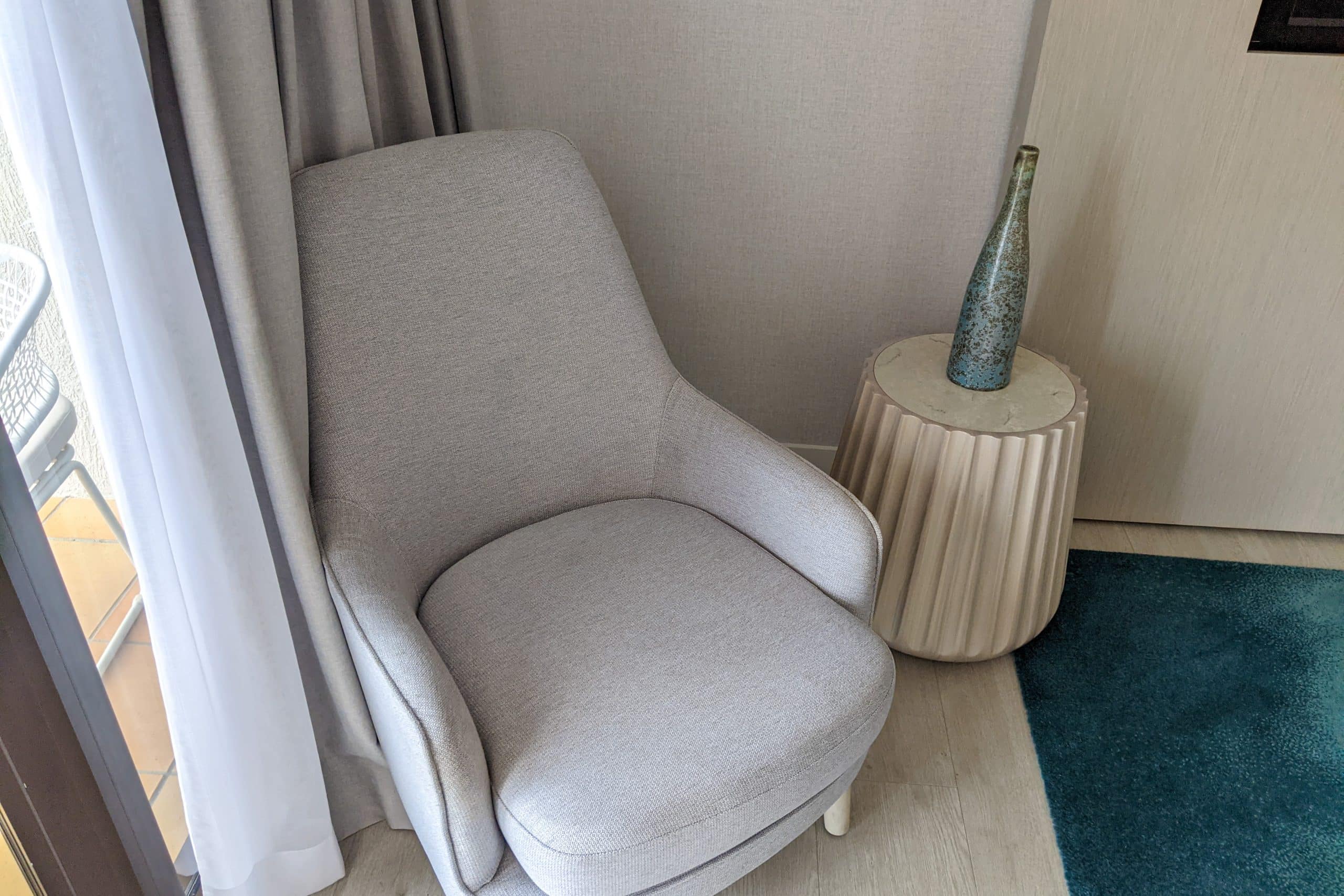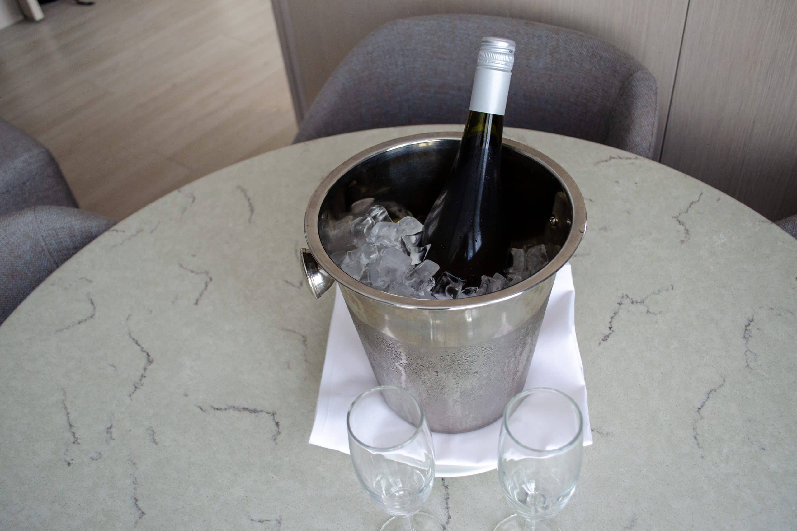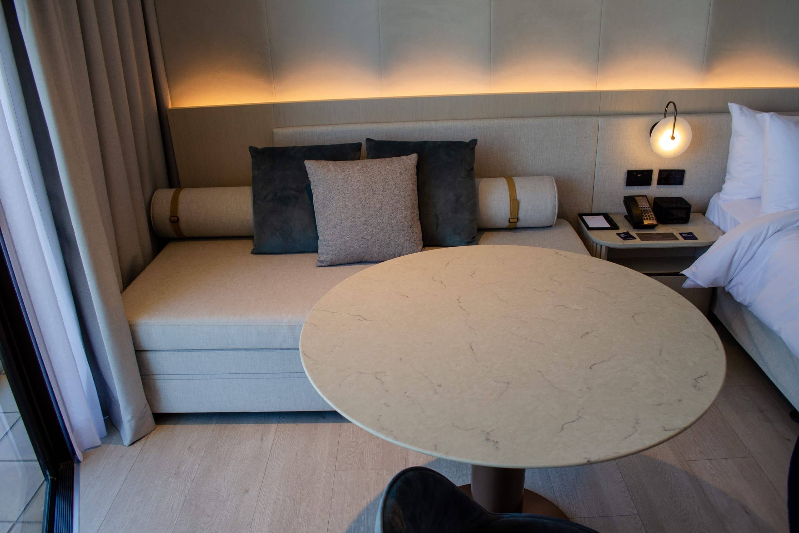 A four-person table is tucked between the divider to the bedroom and the first of the room’s two balconies, which offers great sunrise views. To my surprise, there was another bottle of sparkling wine delivered to us and placed on the table while we were out for a stroll, which we enjoyed during a sunset that evening.
