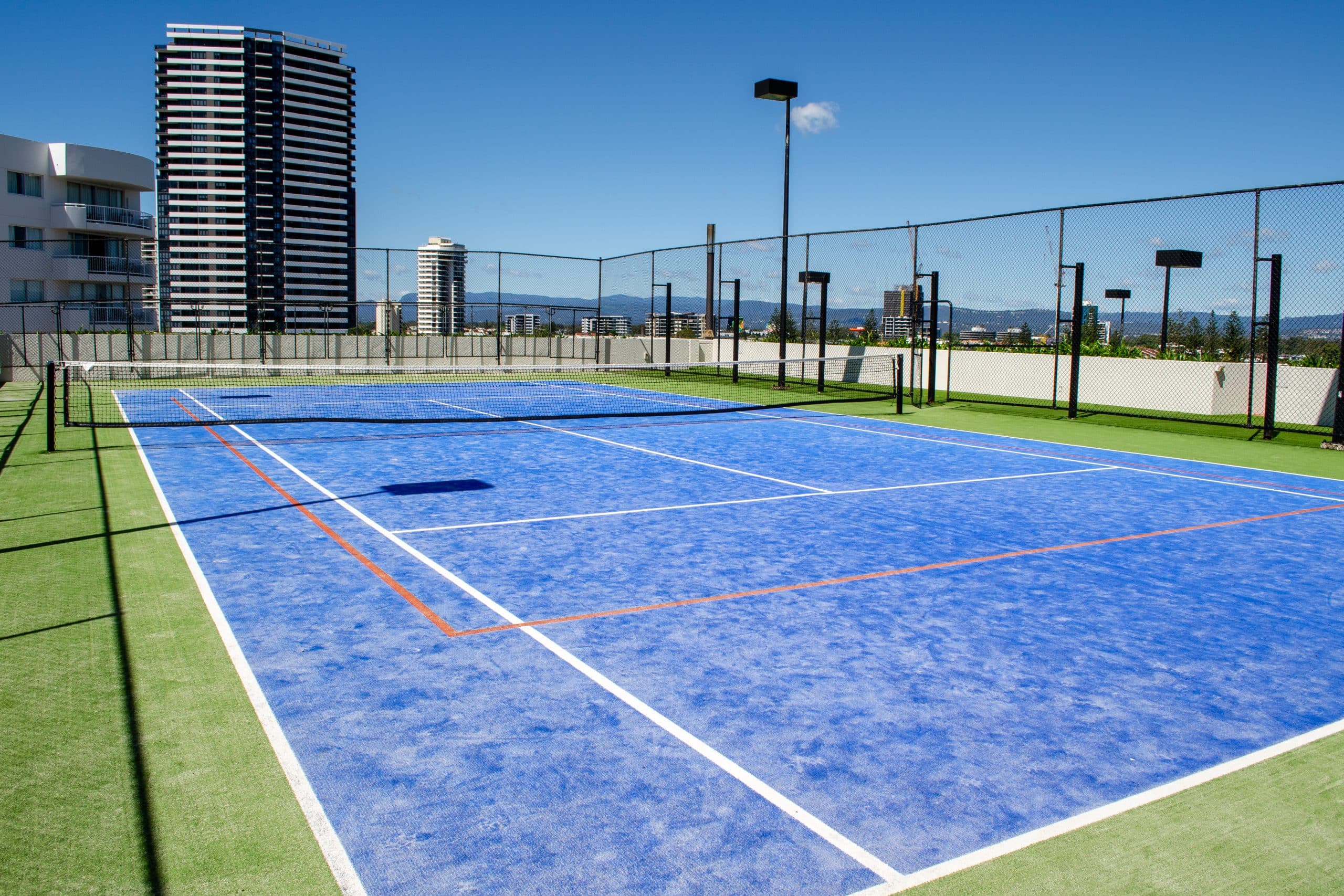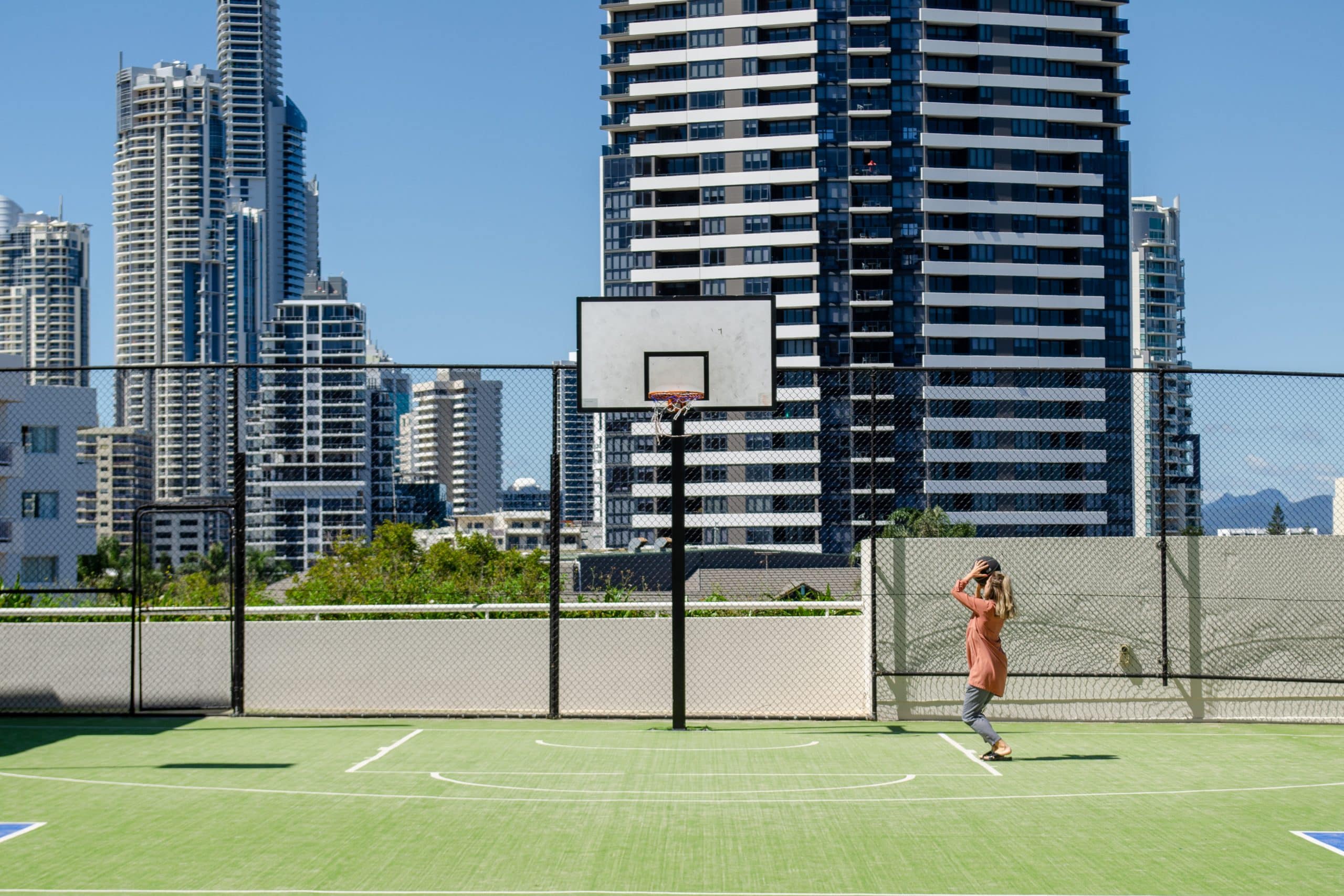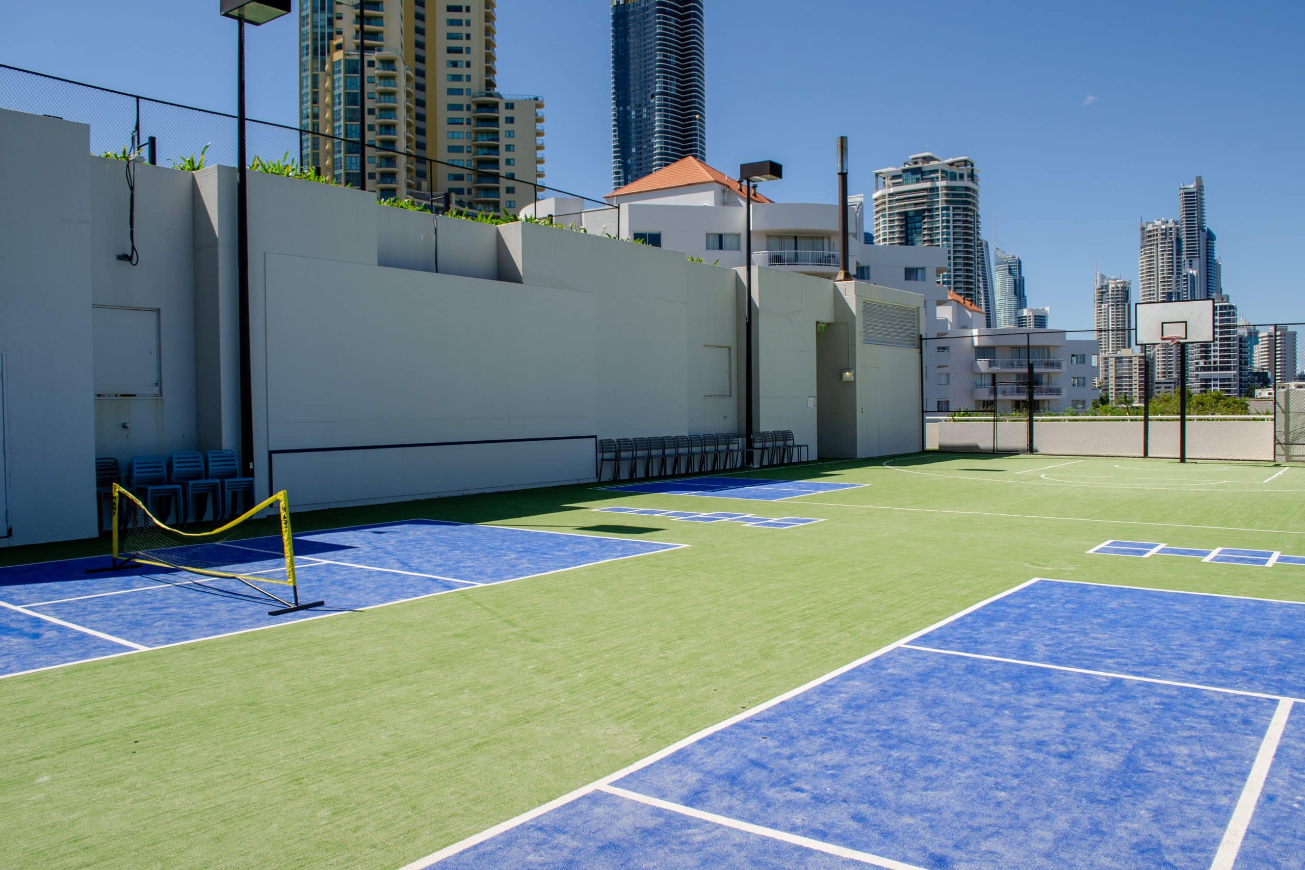 Just outside from the fitness centre is a two-story multi-purpose court area. On the upper level is a full-sized tennis court, while on the lower level is a basketball net and some smaller courts.