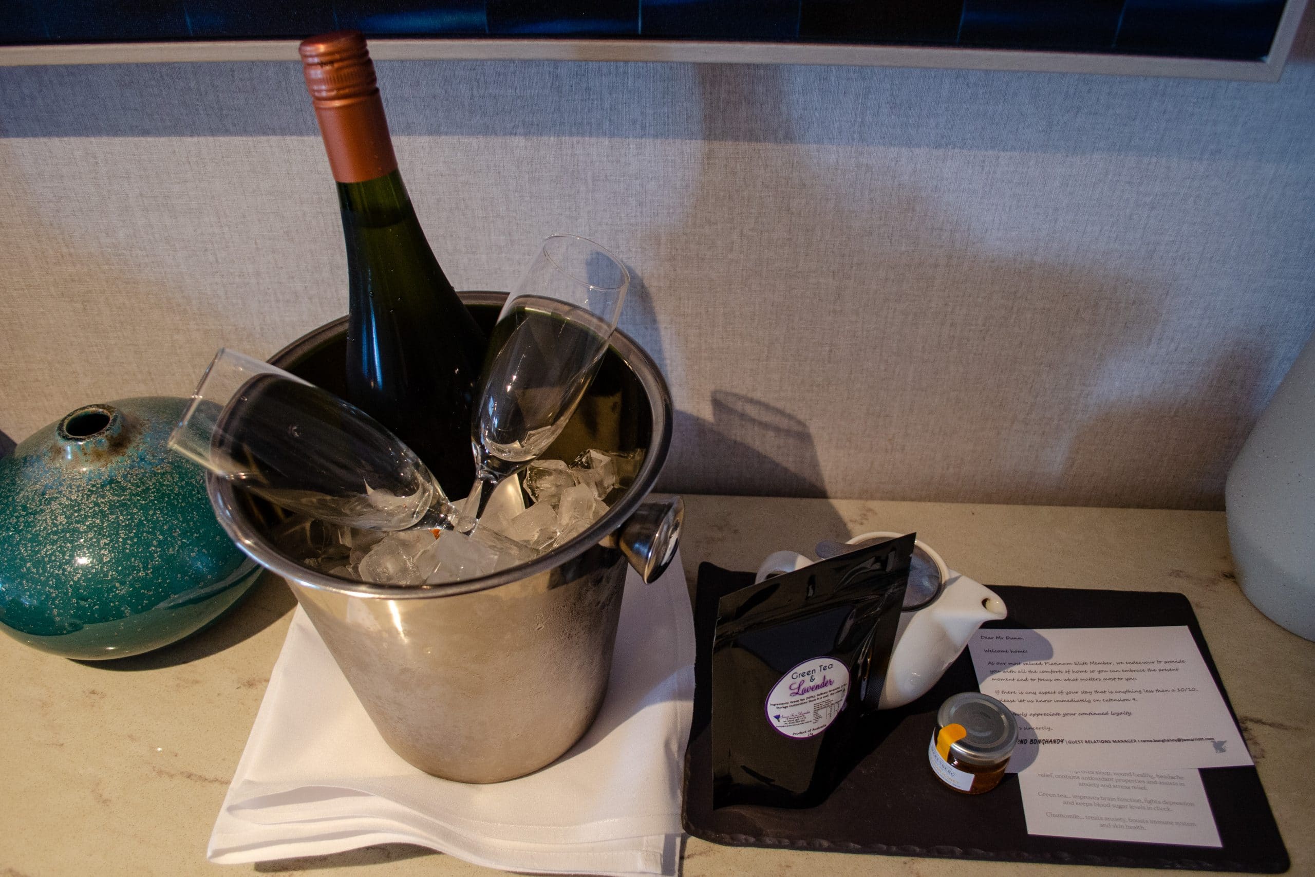 In the room’s foyer, there is an entryway table with a few vases underneath some artwork. After we had explored the grounds, we came back to the room to find a welcome gift of lavender tea and a bottle of sparkling wine in this area.