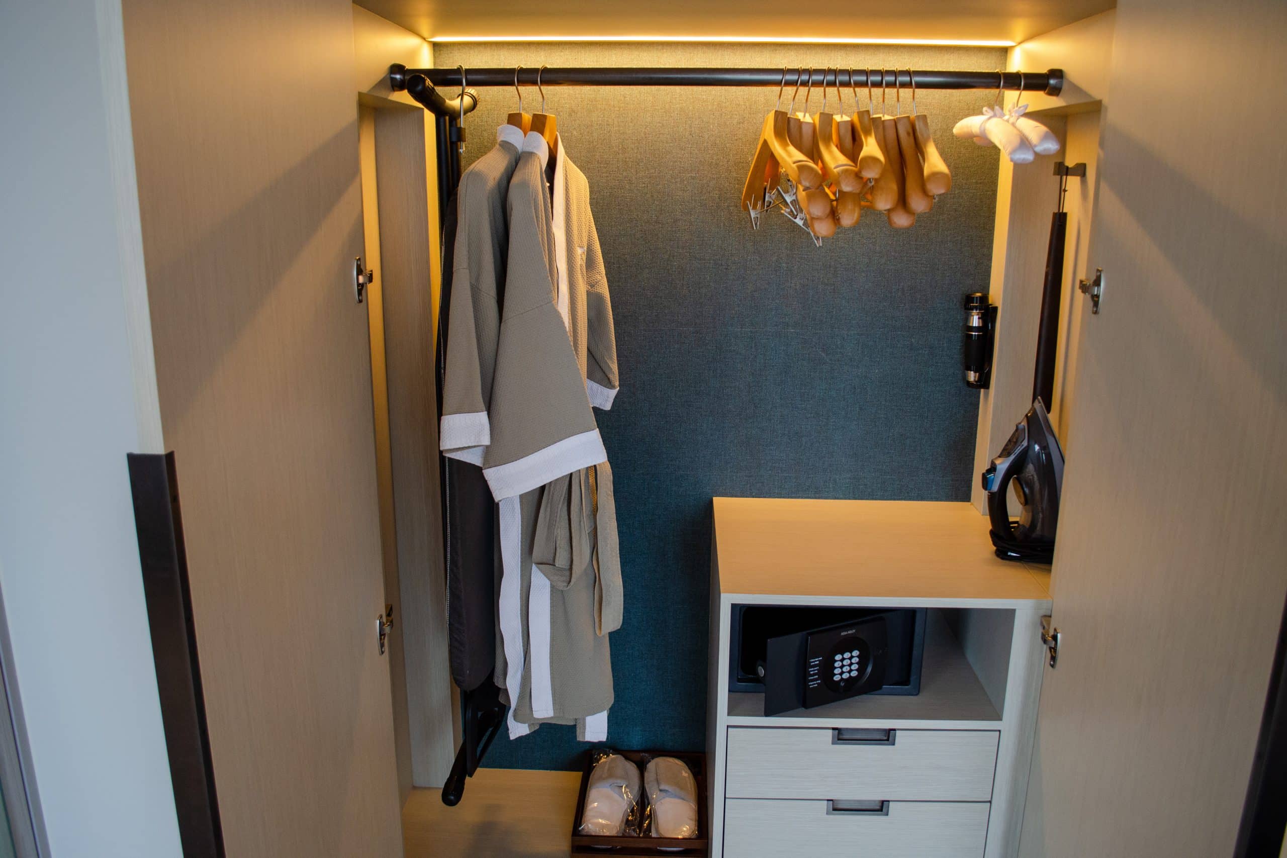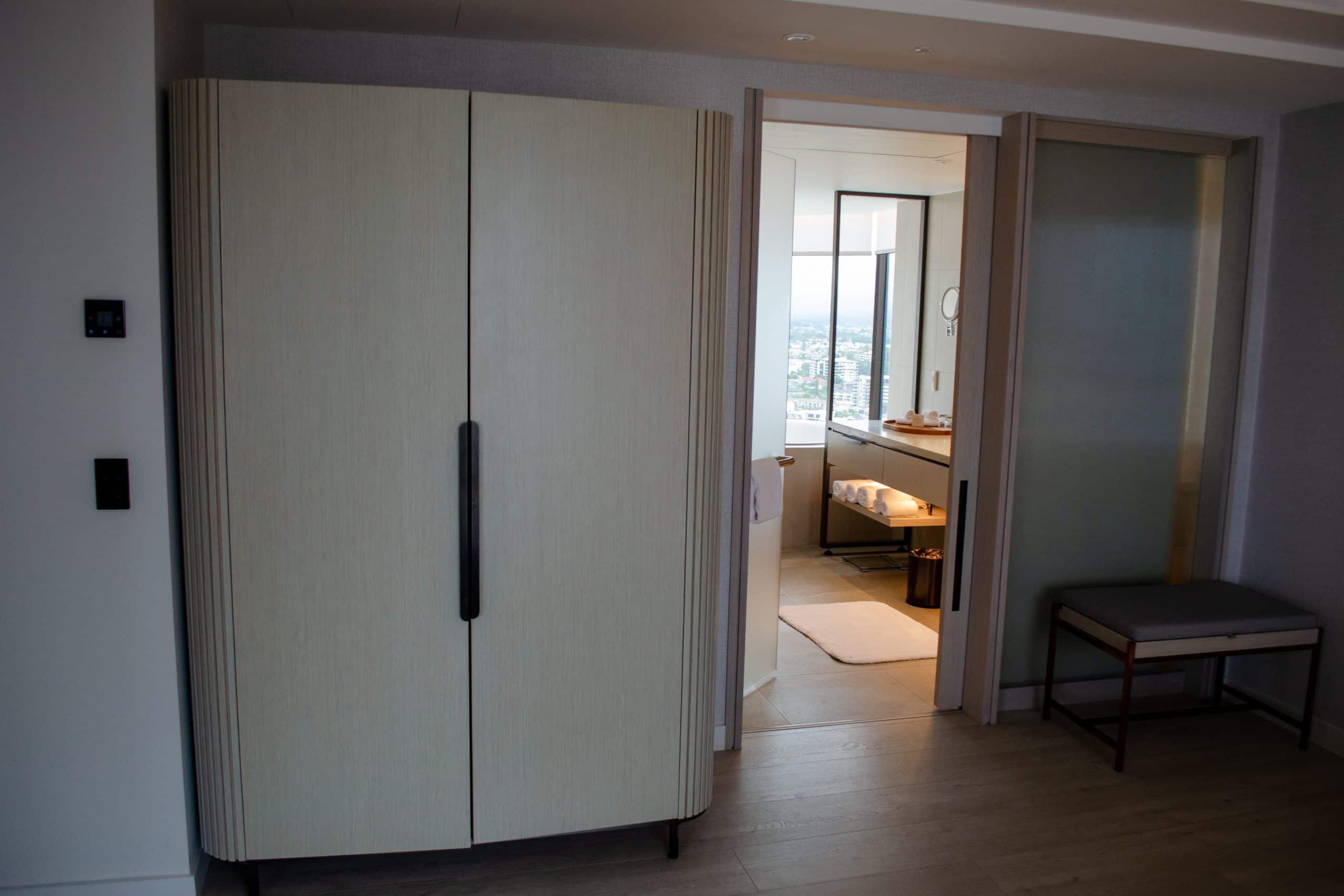 On the other side of the bedroom is an armoire, which had plenty of space to hang clothes alongside the bathrobes. On the other side of the doorway, which leads to the main bathroom, is a bench that can also be used as a luggage rack.