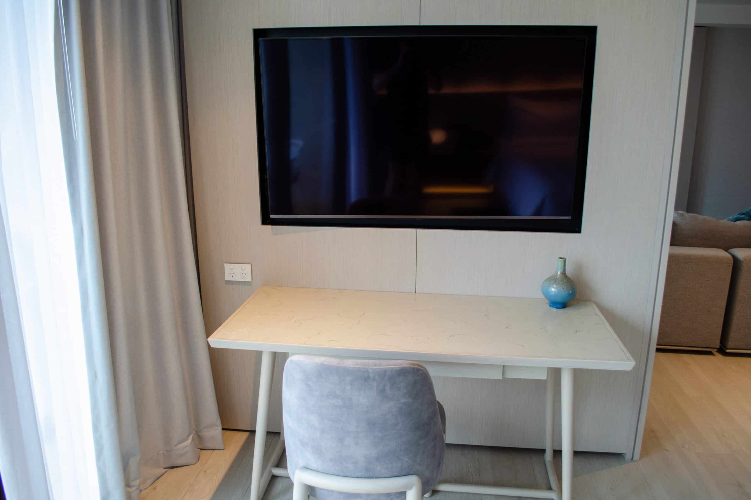 On the opposite side of the wall from the dining table is a desk and a comfortable chair, with the room’s other flat-screen TV above. Next to here is the room’s other balcony, which also had a table with two chairs.