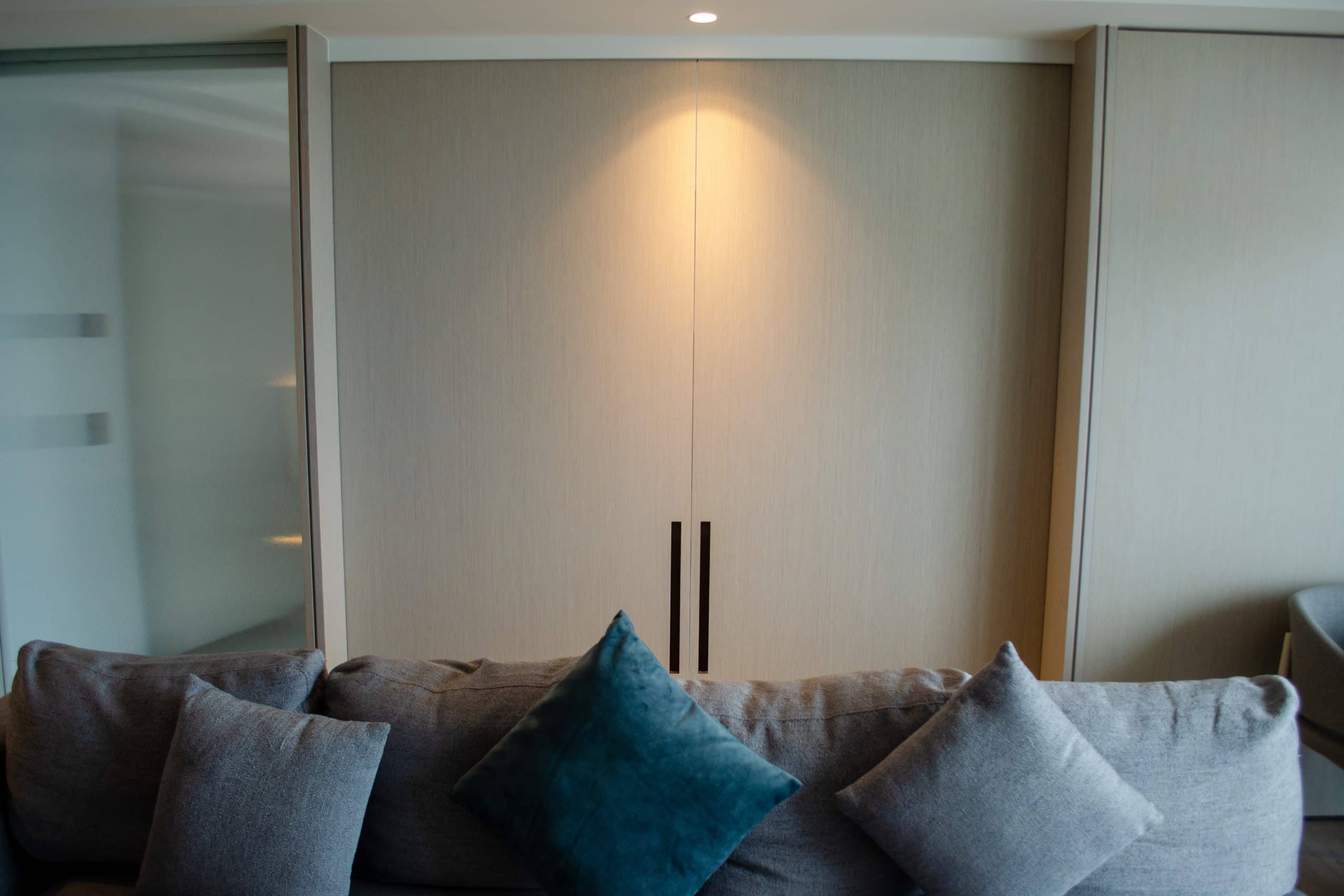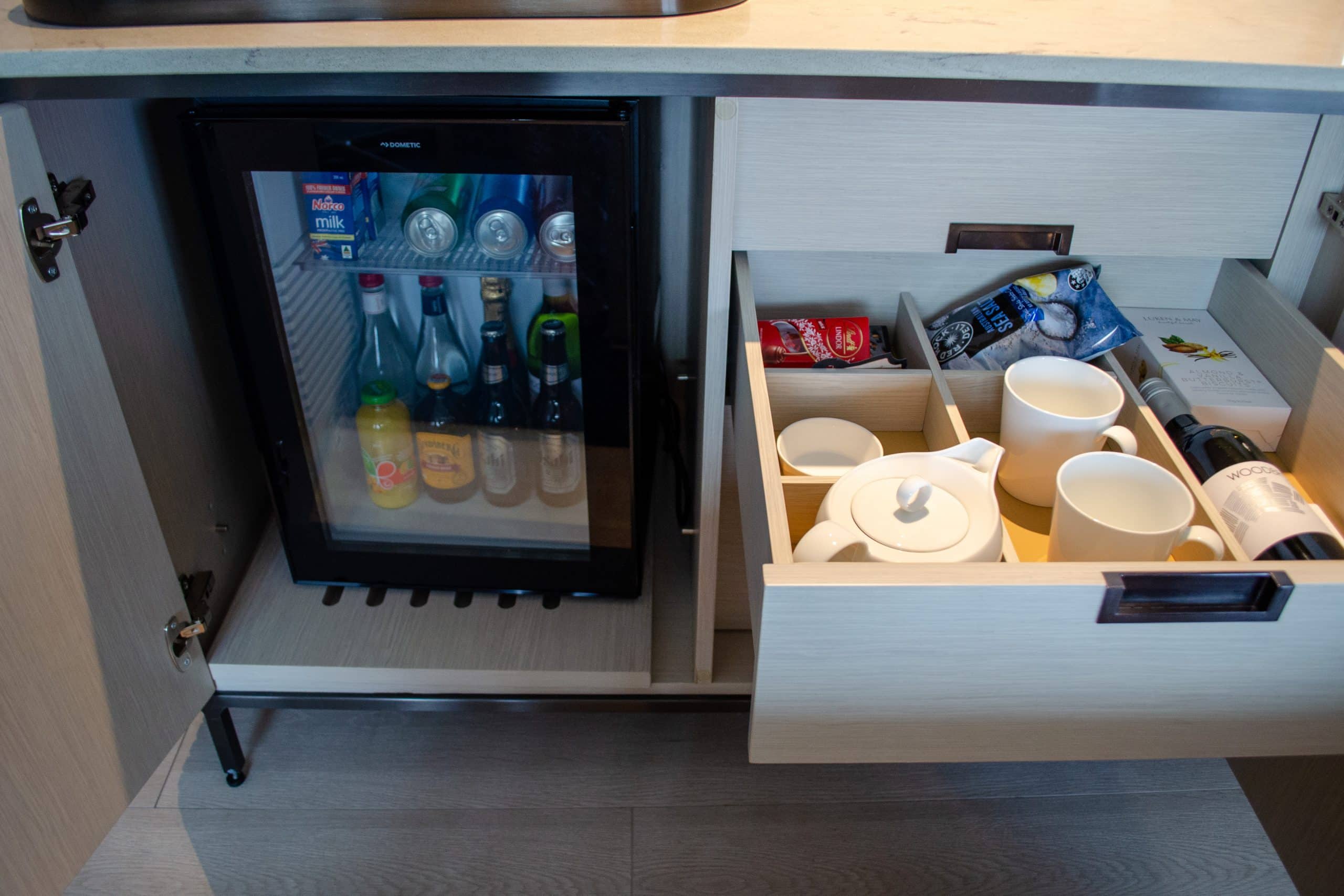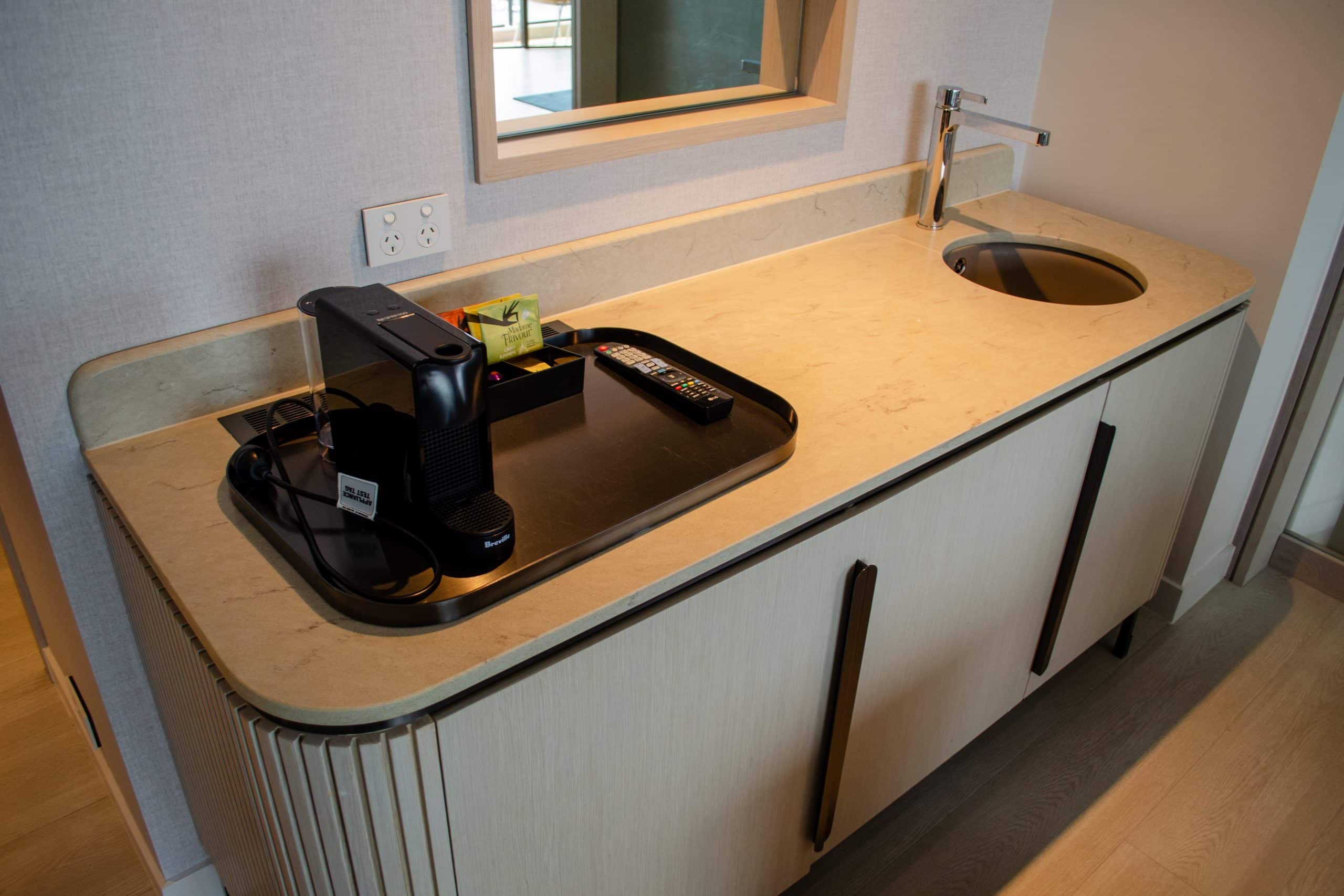 The living room is also where you’ll find a large buffet that is home to the room’s mini-bar, a sink, and the Breville Nespresso coffee maker.