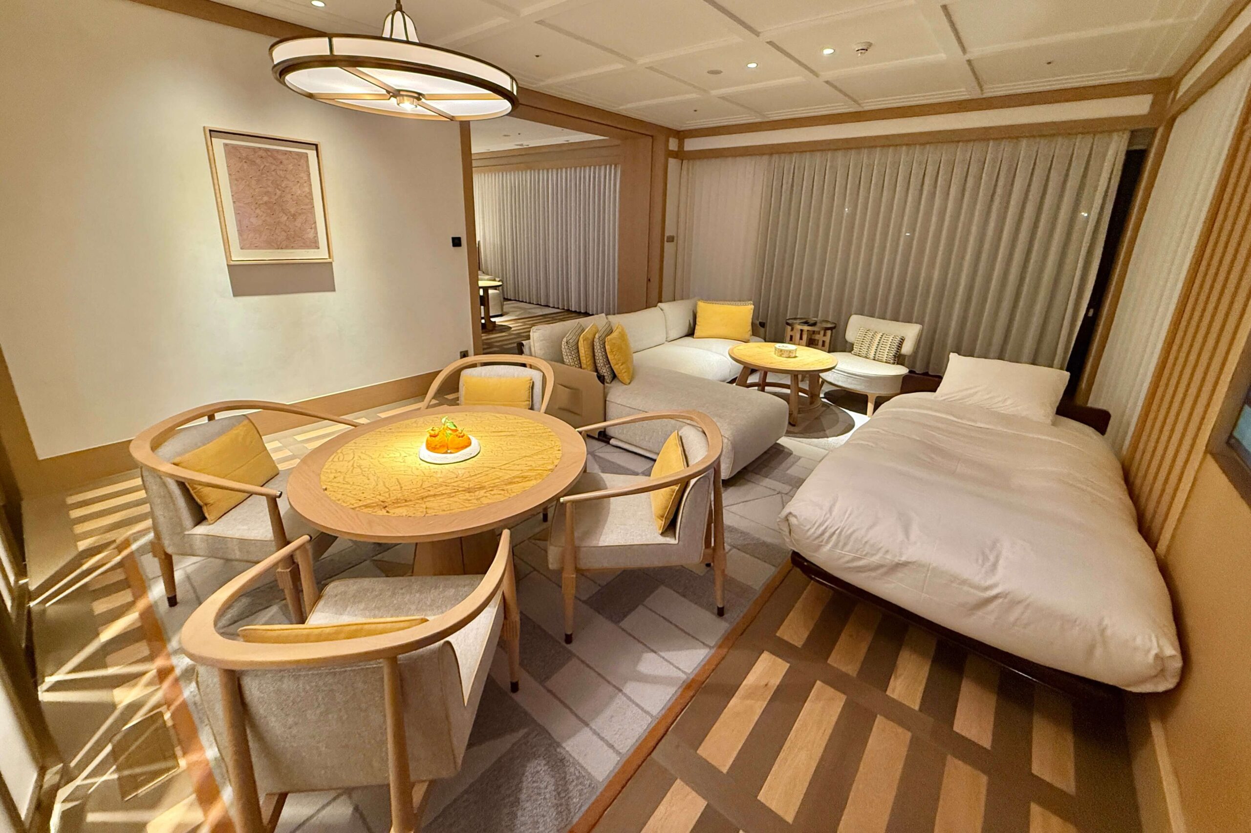 Inside, the suite boasted an elegant open-concept layout with distinct living and sleeping areas separated by a sliding wall, styled in a refined palette of warm neutrals. Subtle Jeju-inspired design elements lent a sophisticated sense of place, blending luxury with cultural homage.
