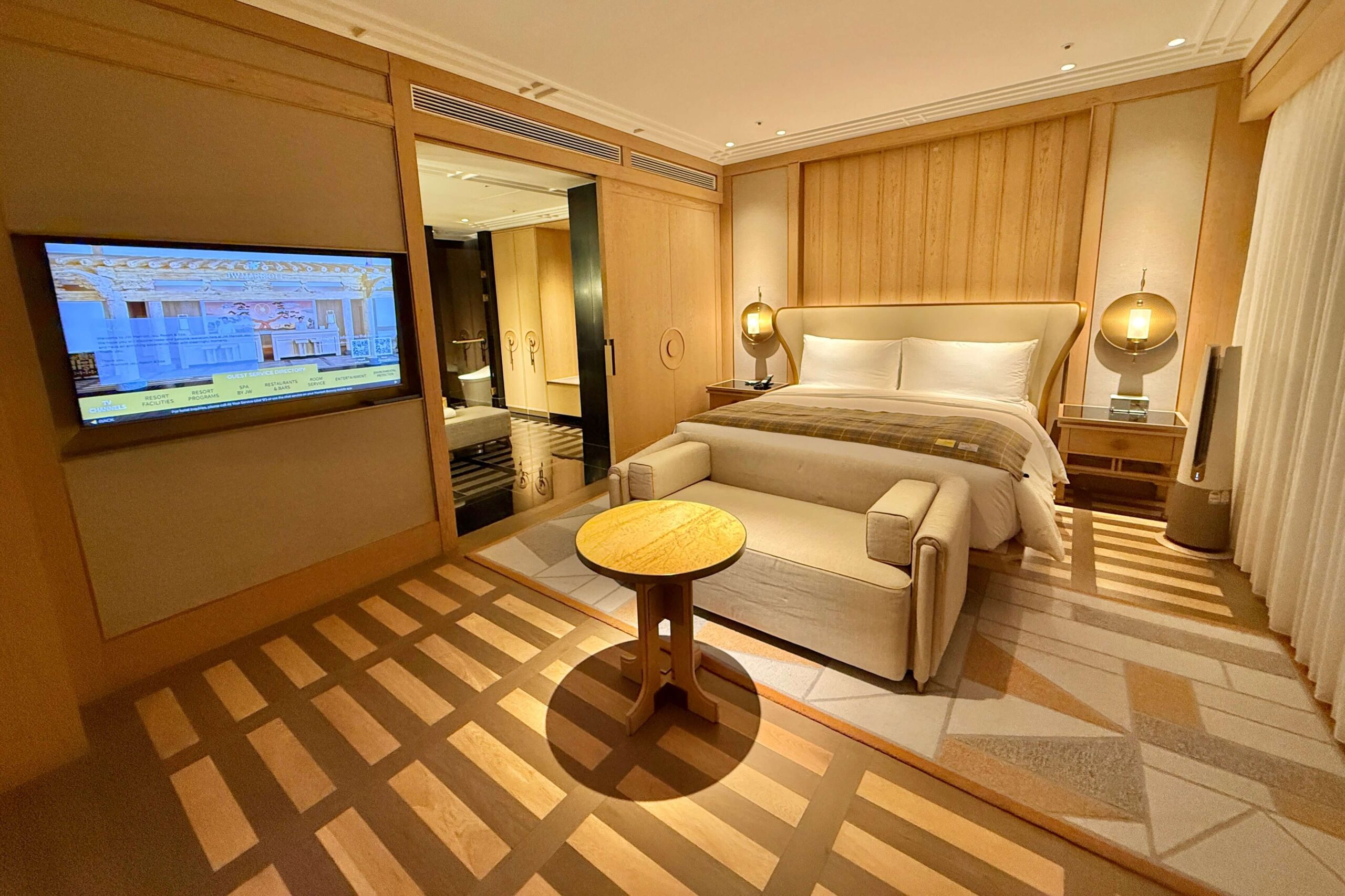 During my stay, I also had the chance to tour a Premium King Guest Room. The space is well-suited for a couple, though some may find the bathroom layout unconventional with the shower and bathtub positioned at one end of the room, and the sinks along with a vanity desk located at the other.