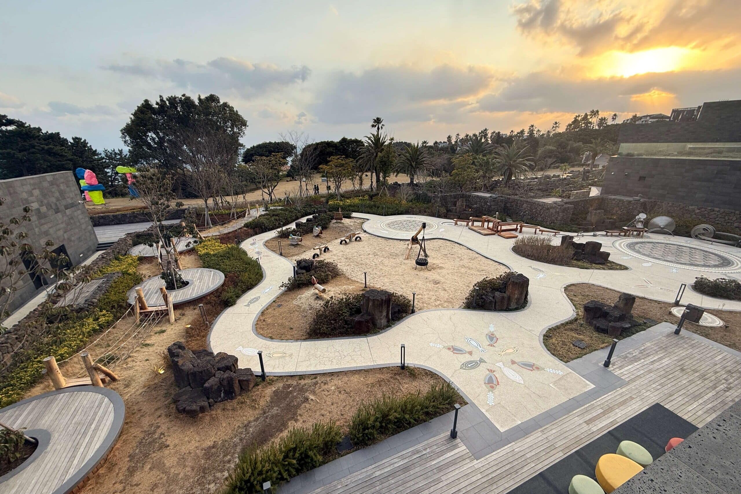 Younger guests are well catered for with a dedicated outdoor playground and the spacious indoor Kids’ Club. The club offers paid, supervised educational programs twice daily, each lasting 1 to 1.5 hours and starting at 50,000 KRW per child. The sessions focus on Jeju’s natural environment and cultural heritage.
