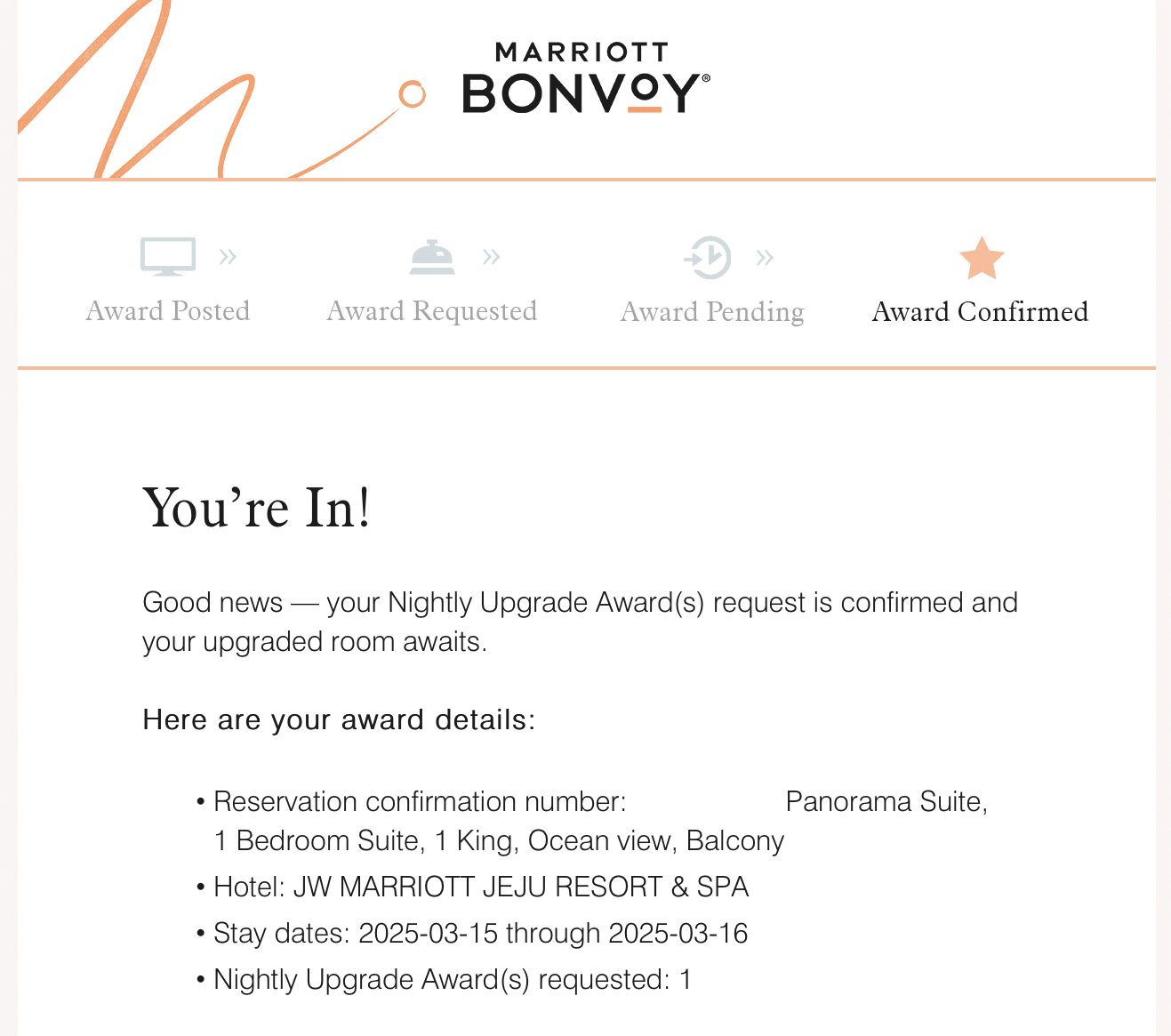 As this room could only accommodate a maximum of two adults and two children under the age of 12, I applied three Nightly Upgrade Awards to our booking in hopes of a suite upgrade. Thankfully, five days out my awards cleared for a Panorama Suite.