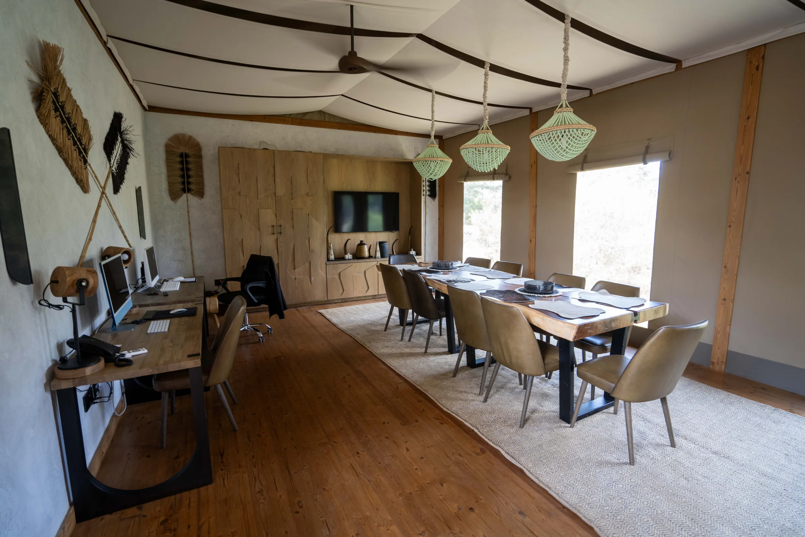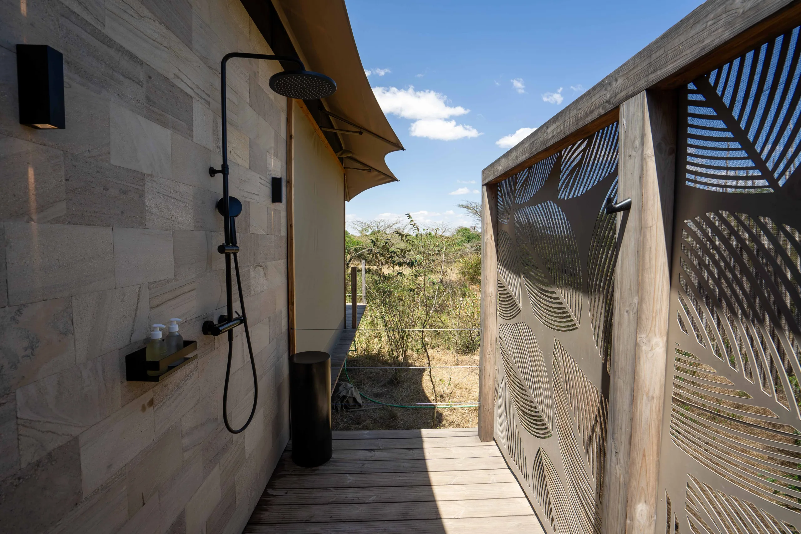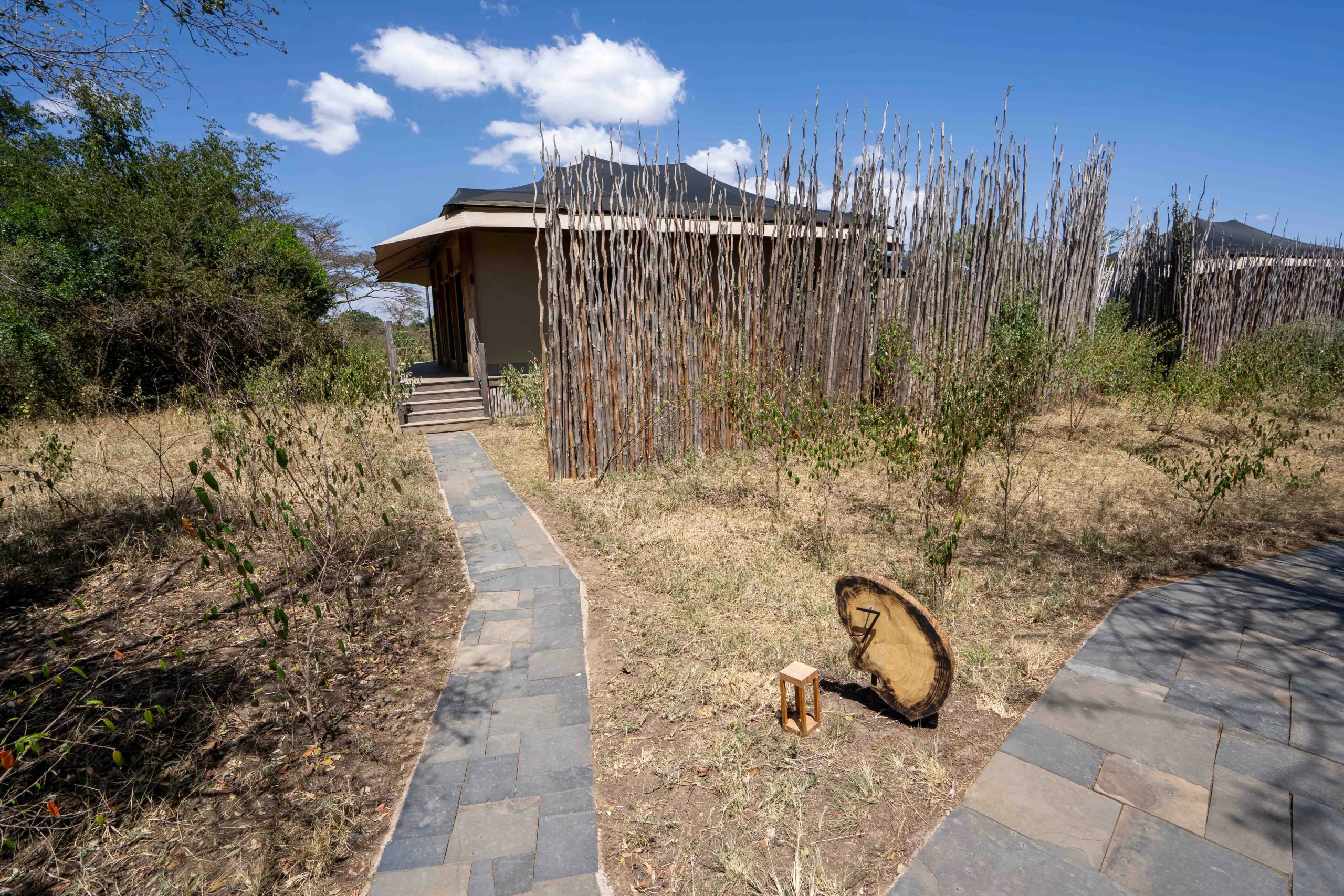 A Masai spear is positioned at the entrance of each villa, which guests can place in a central slot to signal “Do Not Disturb”.