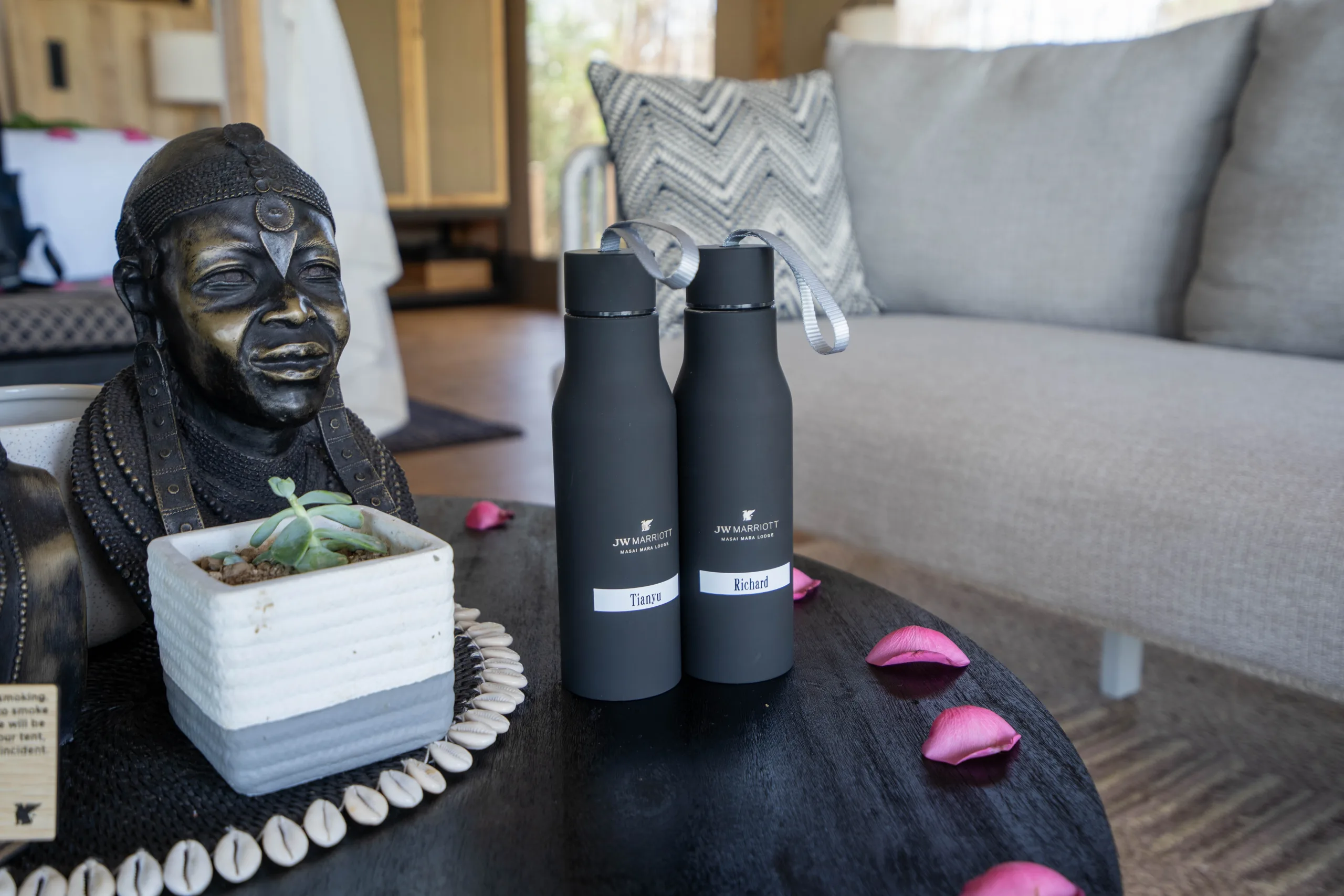 Upon our arrival, we noticed two black water bottles proactively set on the table, each personalized with our names.