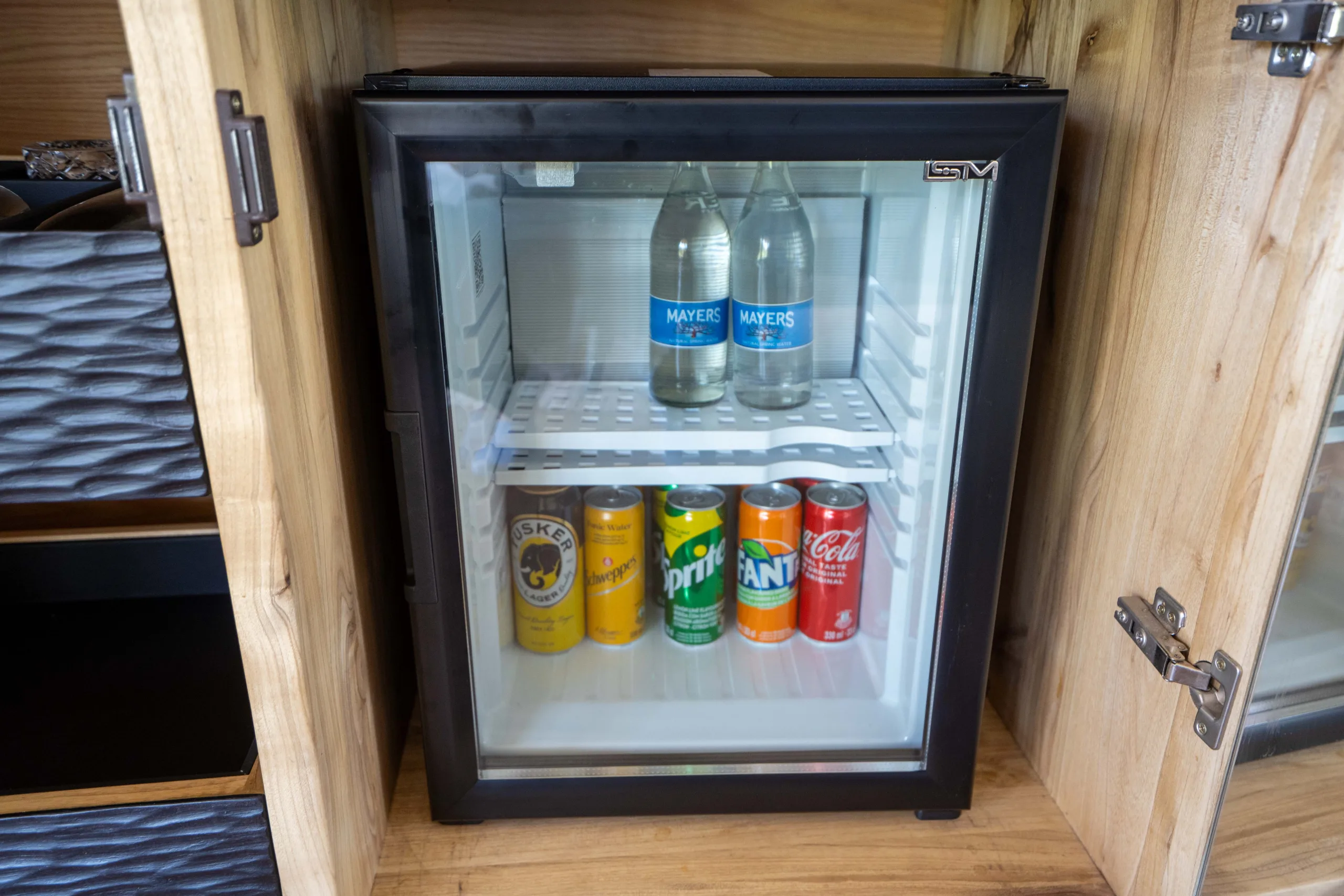 In the corner of the room is an expansive and well-stocked minibar, all of which is complimentary. It’s stocked with a bottle of wine, assorted spirits, and beer, as well as non-alcoholic beverages such as coffee, soft drinks, and water.