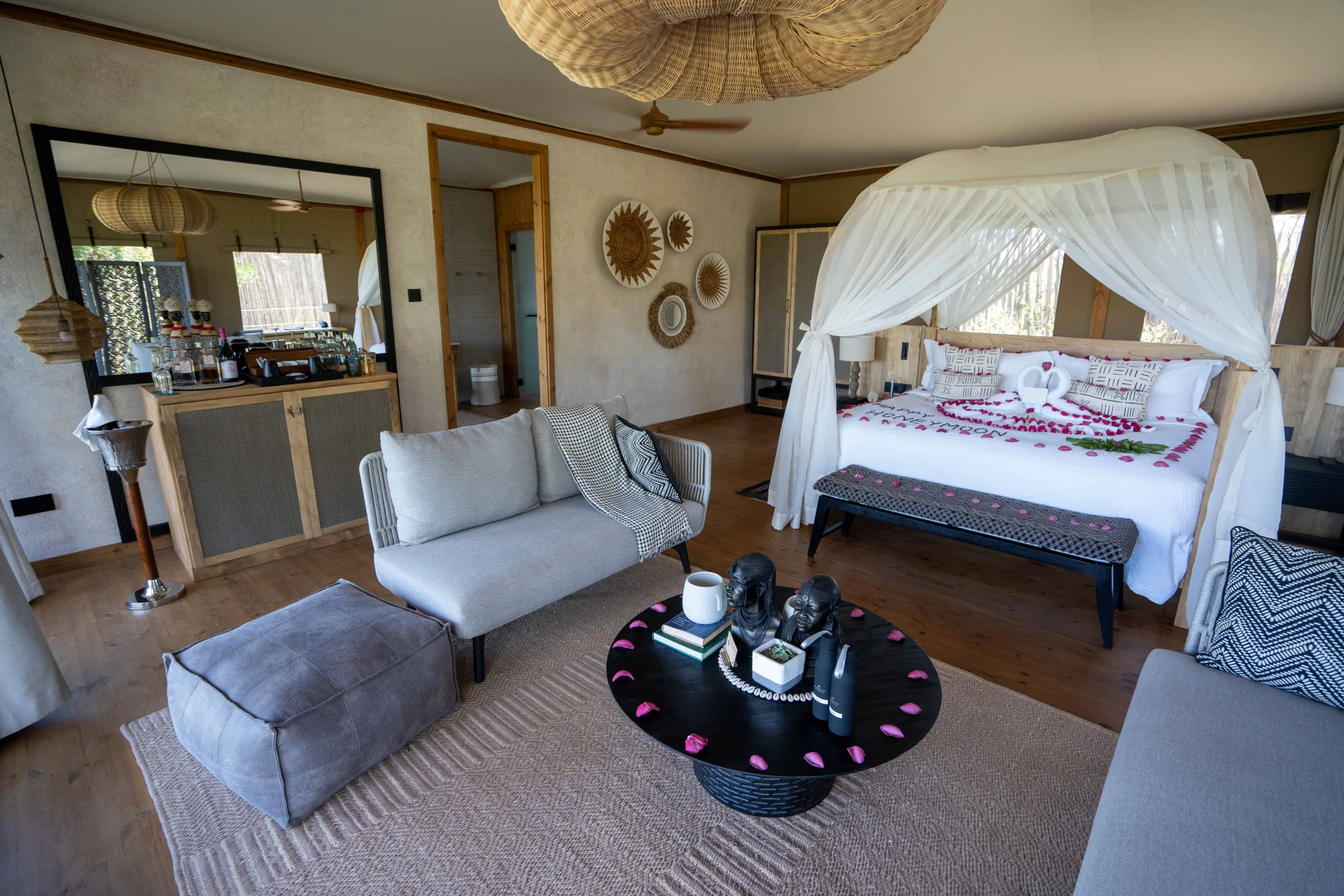 All villas are designed as tented lodges, which blend indoor and outdoor elements, and feature walls constructed of both tent fabric and glass doors and windows.
