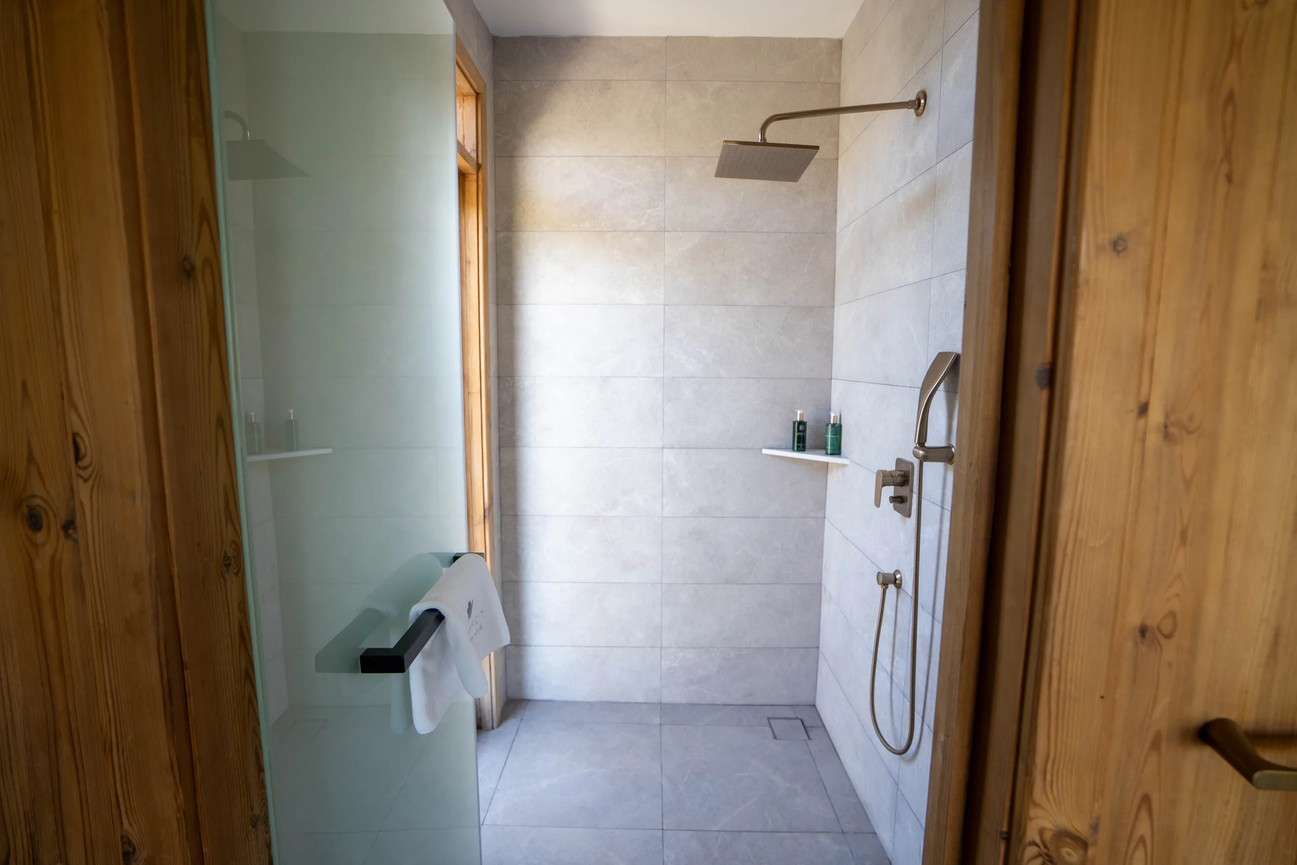 The shower includes a rainfall showerhead and handheld feature. A second door opens to the exterior of the tent for a novel outdoor shower experience.