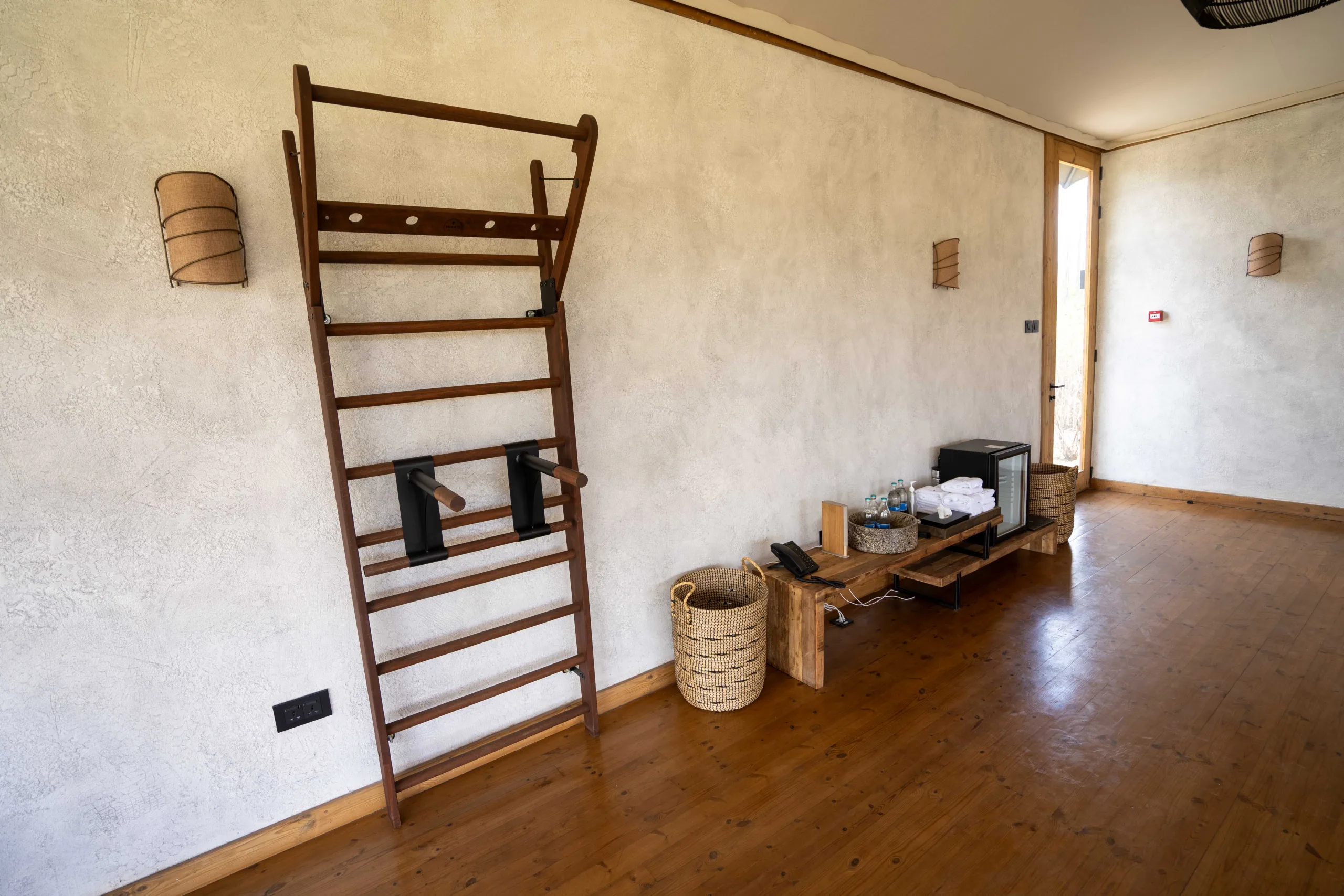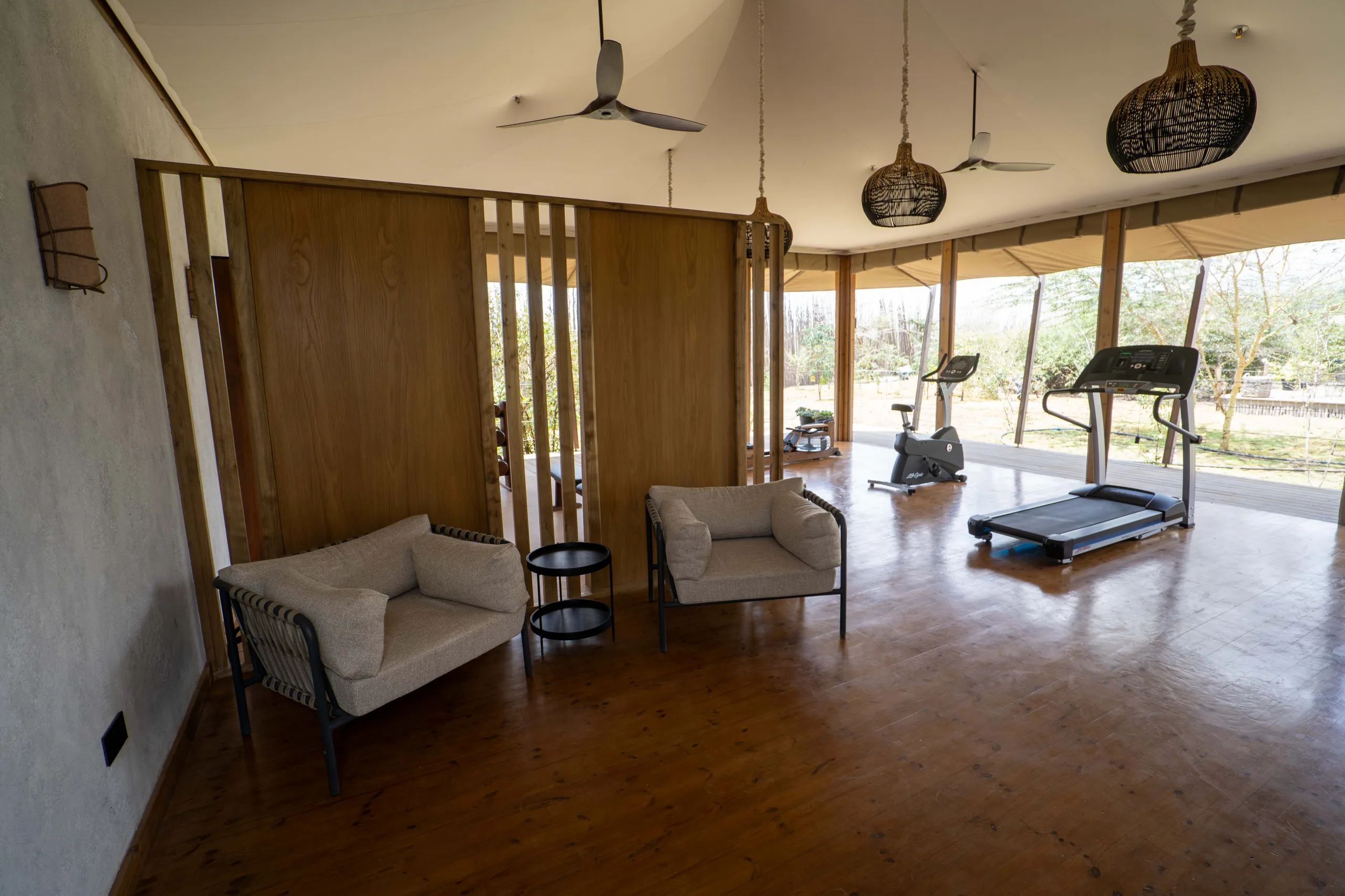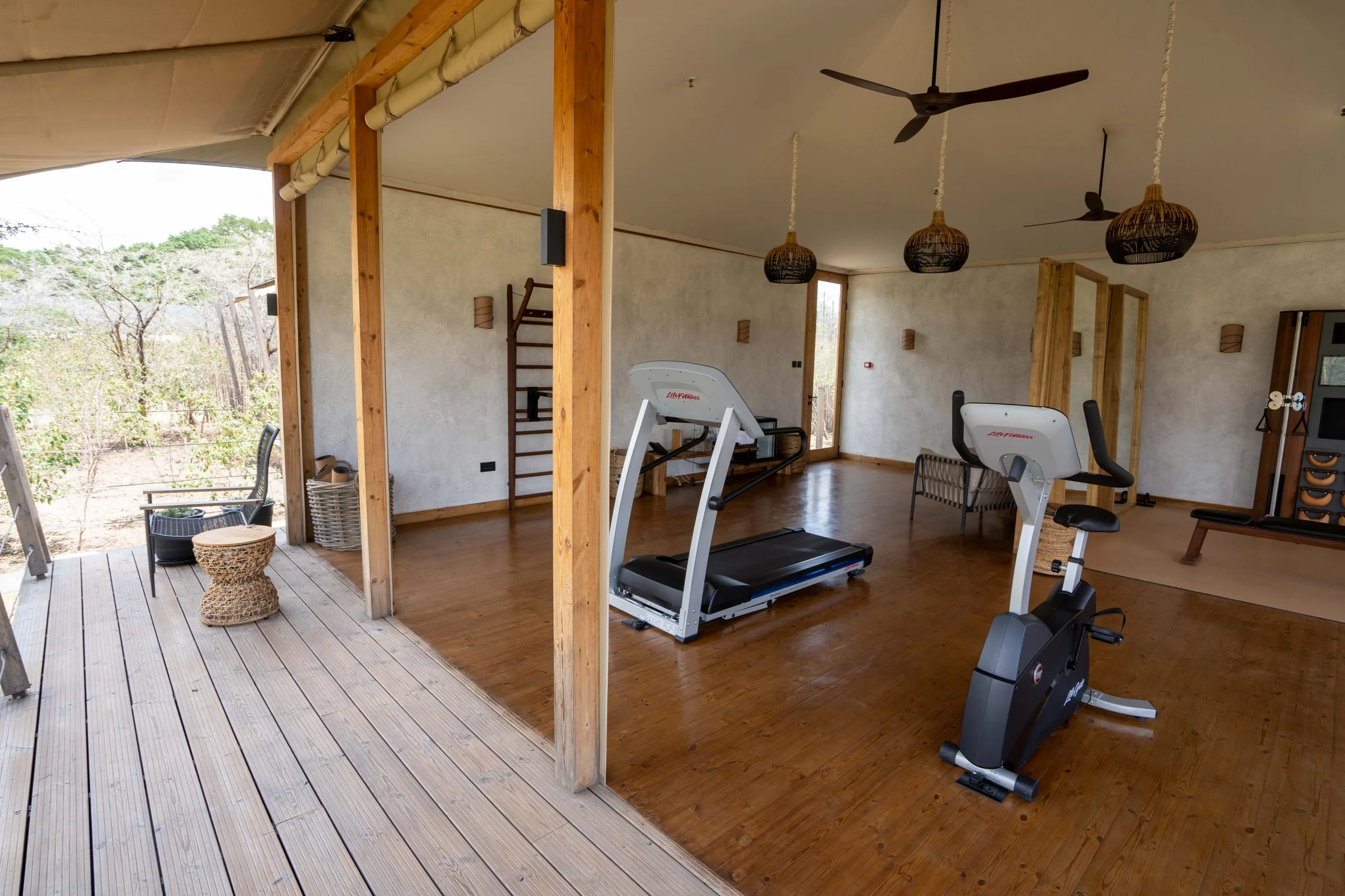 The fitness centre boasts modern equipment, featuring an electronic workout interface and custom-made weights crafted from leather and sand.
