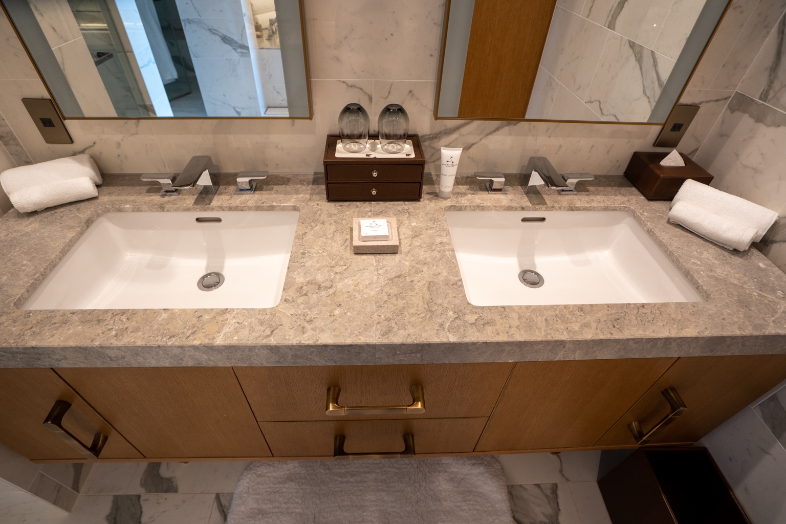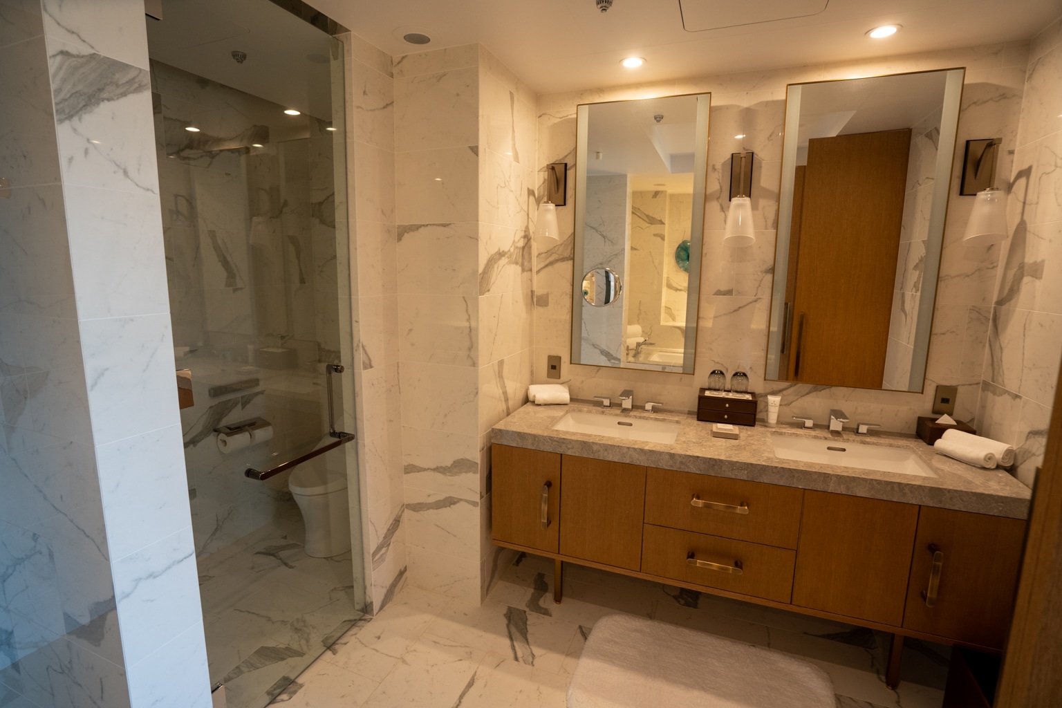 The bathroom of the suite is opulent, adorned in marble. The space features a double vanity and separate chambers for the shower and toilet.