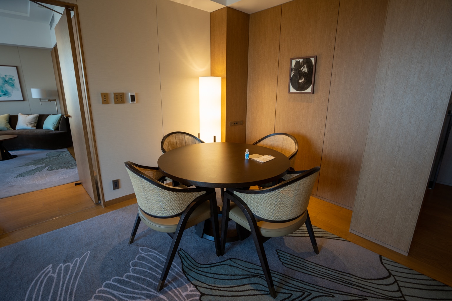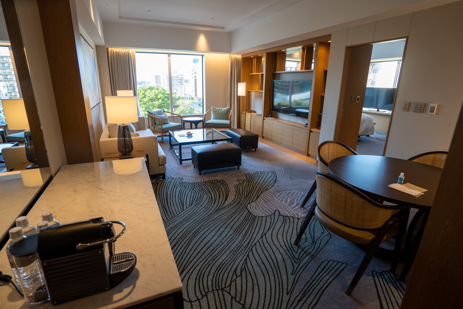 The suite opens up to a spacious living area. Upon entry, a dining area is to the right, and a Nespresso coffee maker sits in the pantry on the left.