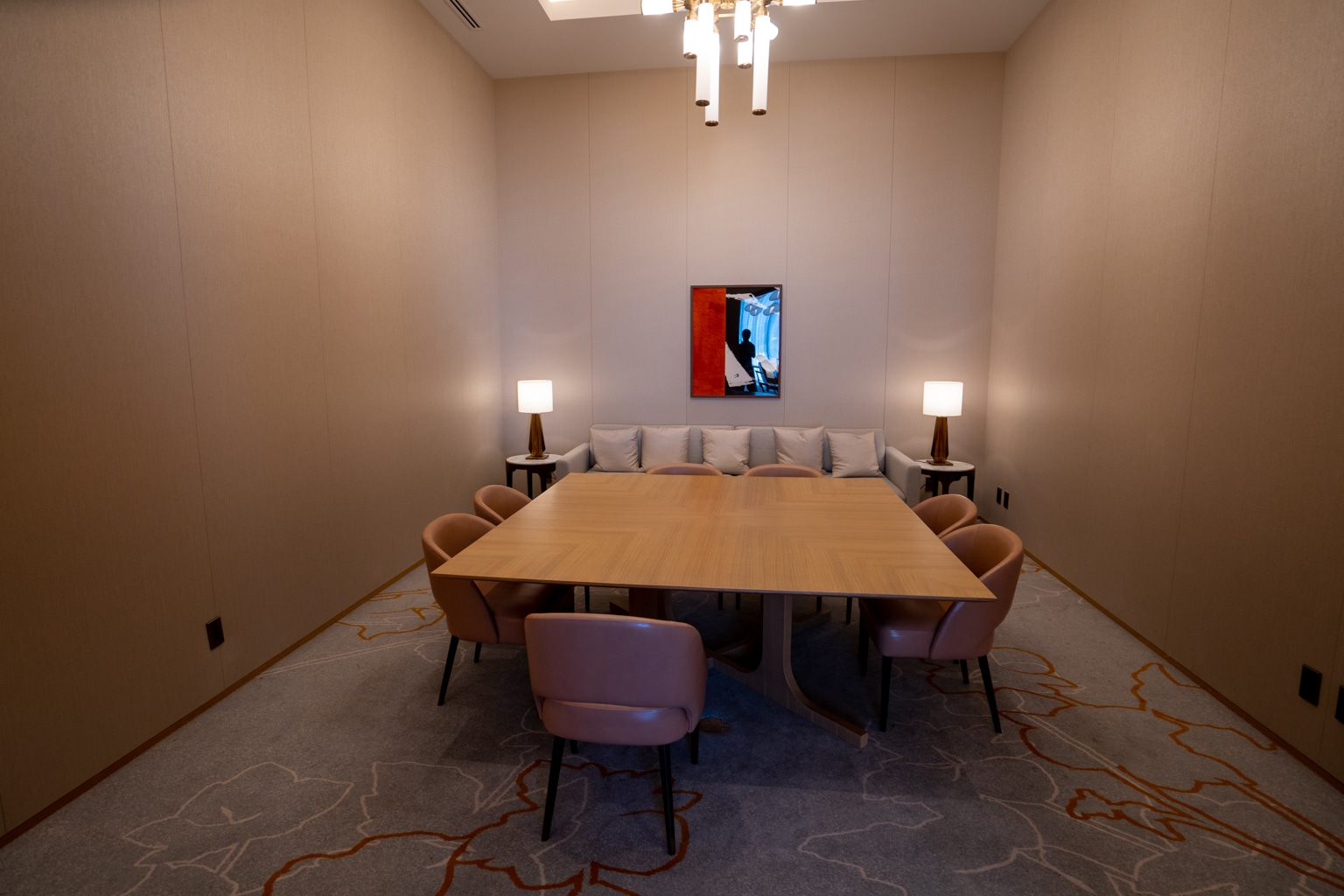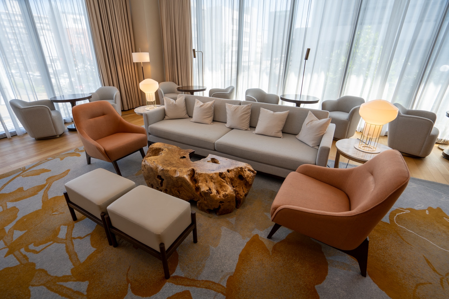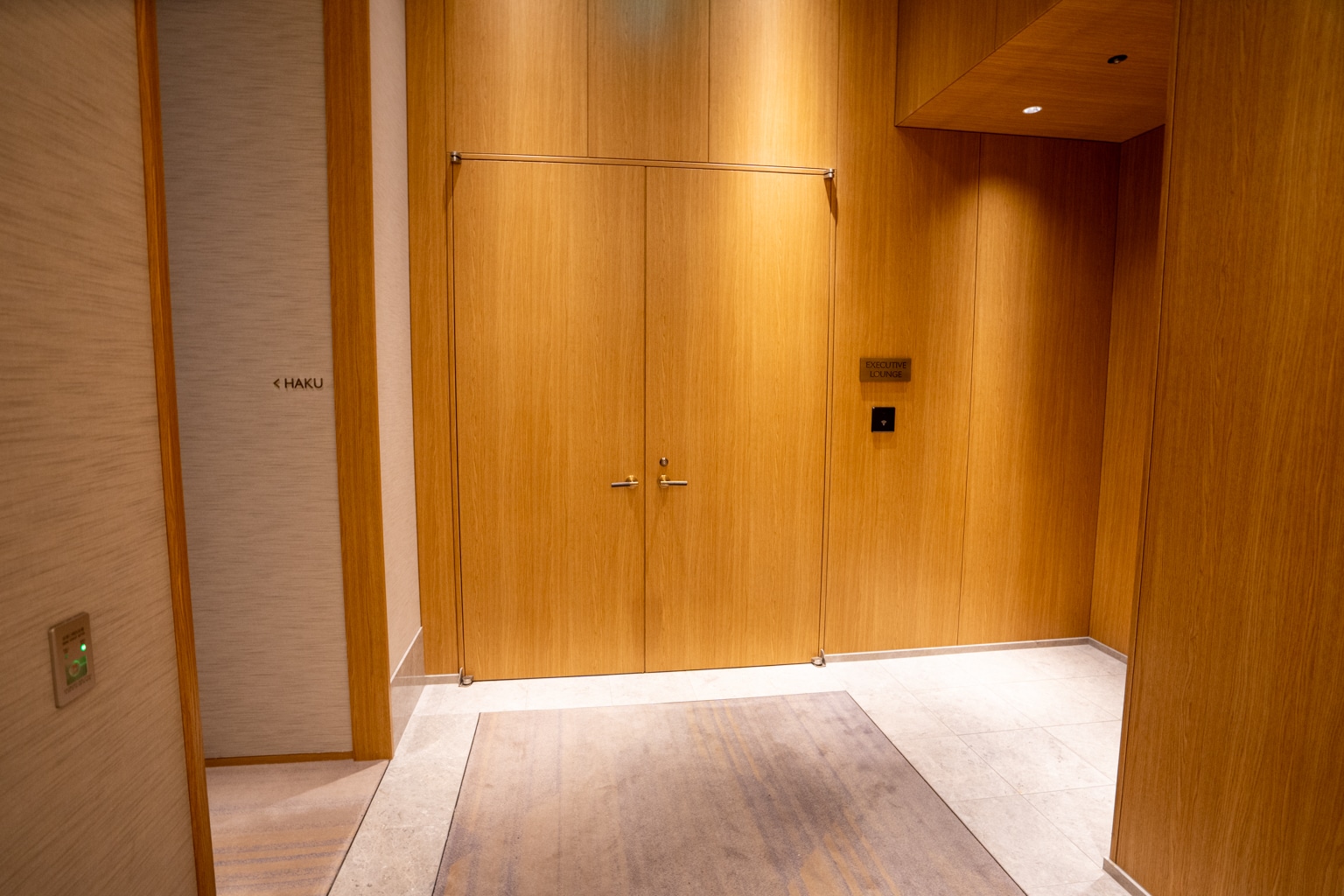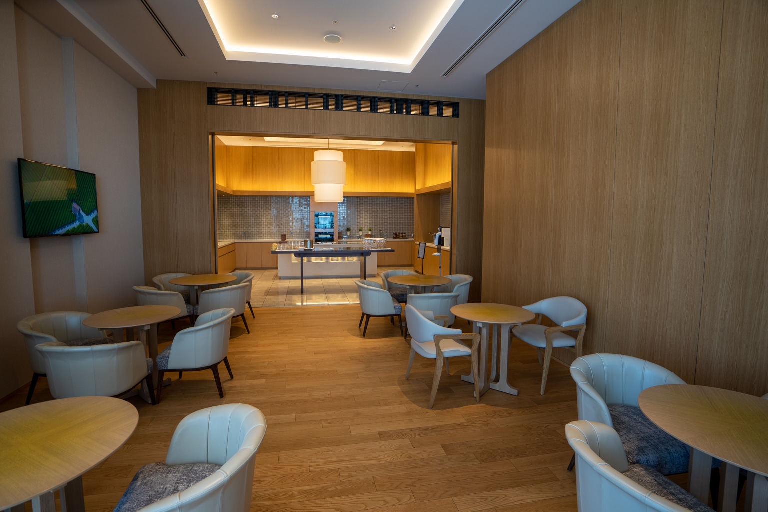 The Executive Lounge was a warm and inviting space with a nice ambiance, situated on the second floor. The design features warm woods with bold gold accents and bespoke lighting fixtures.