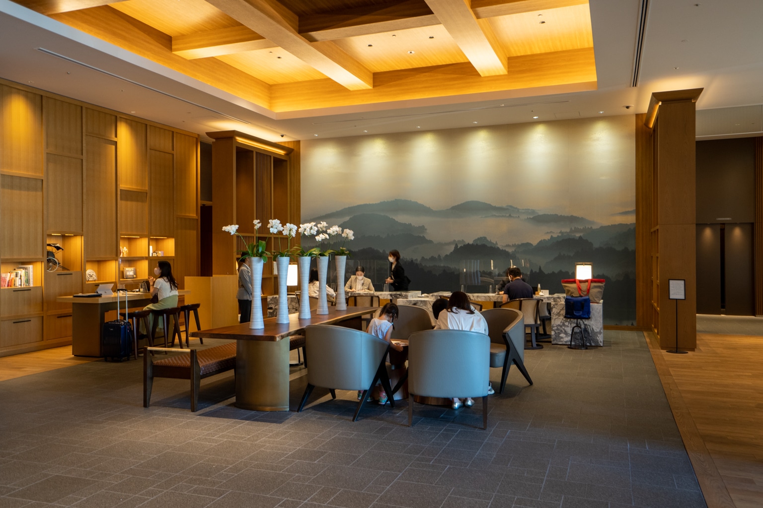 The wood-filled space features a seating area with light furnishings. Then, marble-clad check-in desks are nestled at the back between tall bookshelves and nature-inspired artwork on the wall.