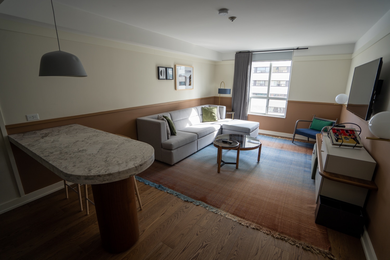 Upon entering the suite, a small kitchenette is to the left, and further in is a spacious living area for a very apartment-like space. The suite was colourful, but also had subdued tones, distinct bespoke furnishings, and quirky artwork dotted around.