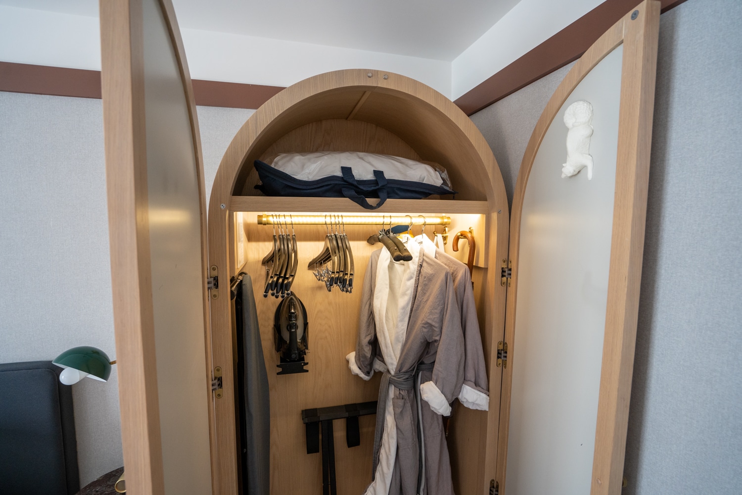 Here in Toronto, a white squirrel sculpture in the armoire plays tribute to the city’s bushy-tailed critters seen in Trinity Bellwoods Park. Also inside the armoire were two plush Frette bathrobes for an added touch of luxury.