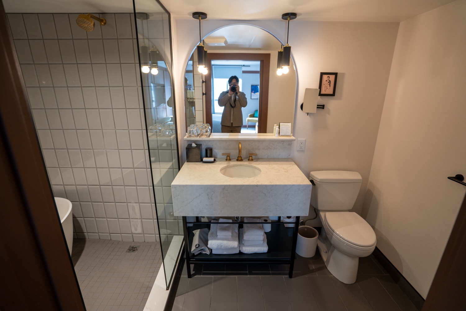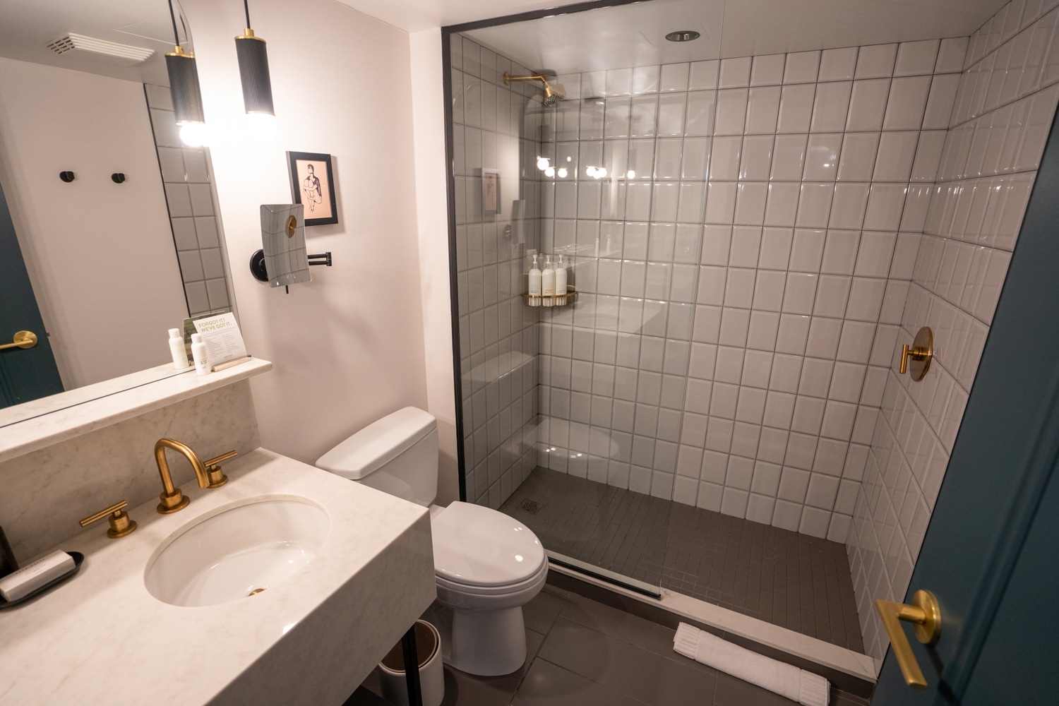The bathroom is also quite spacious, and features the same white marble vanity and rounded mirror. One major difference is that there is no bathtub combined with the shower here, and I found that the sink area felt quite small.