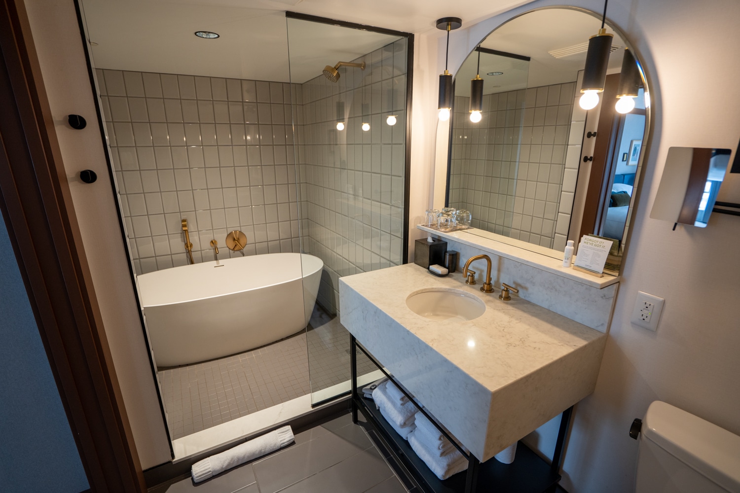 This suite has a combined walk-in shower with a porcelain bathtub directly inside it, all housed within a single glass wet room.