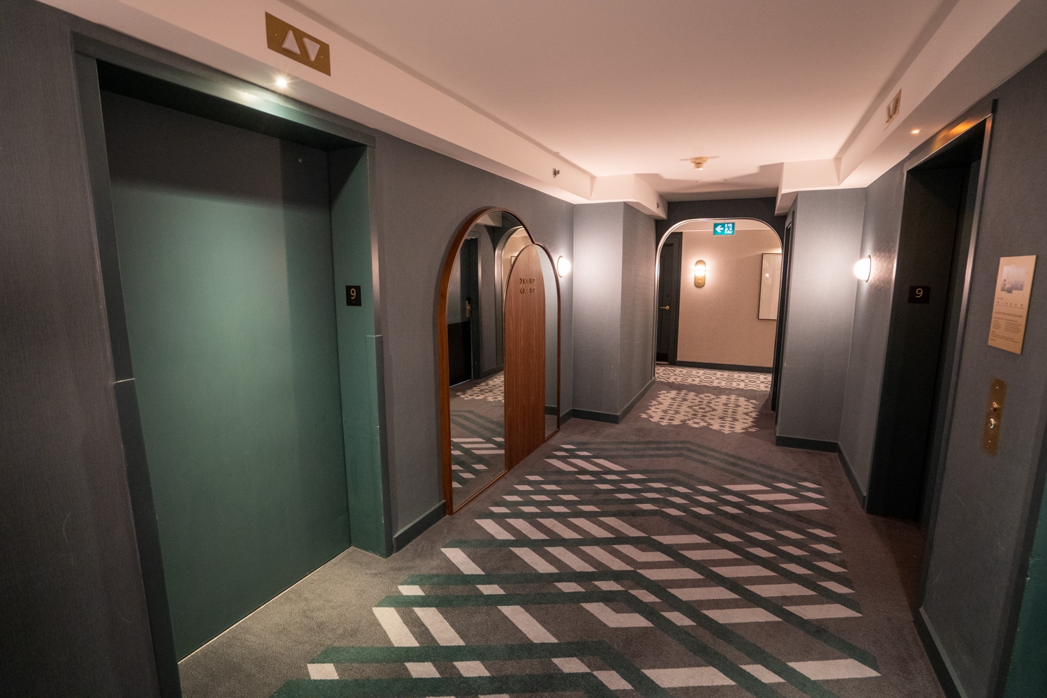 The hallways leading to the guest rooms were simple but stylish, with patterned turquoise floors and wood-layered arched mirrors for décor.