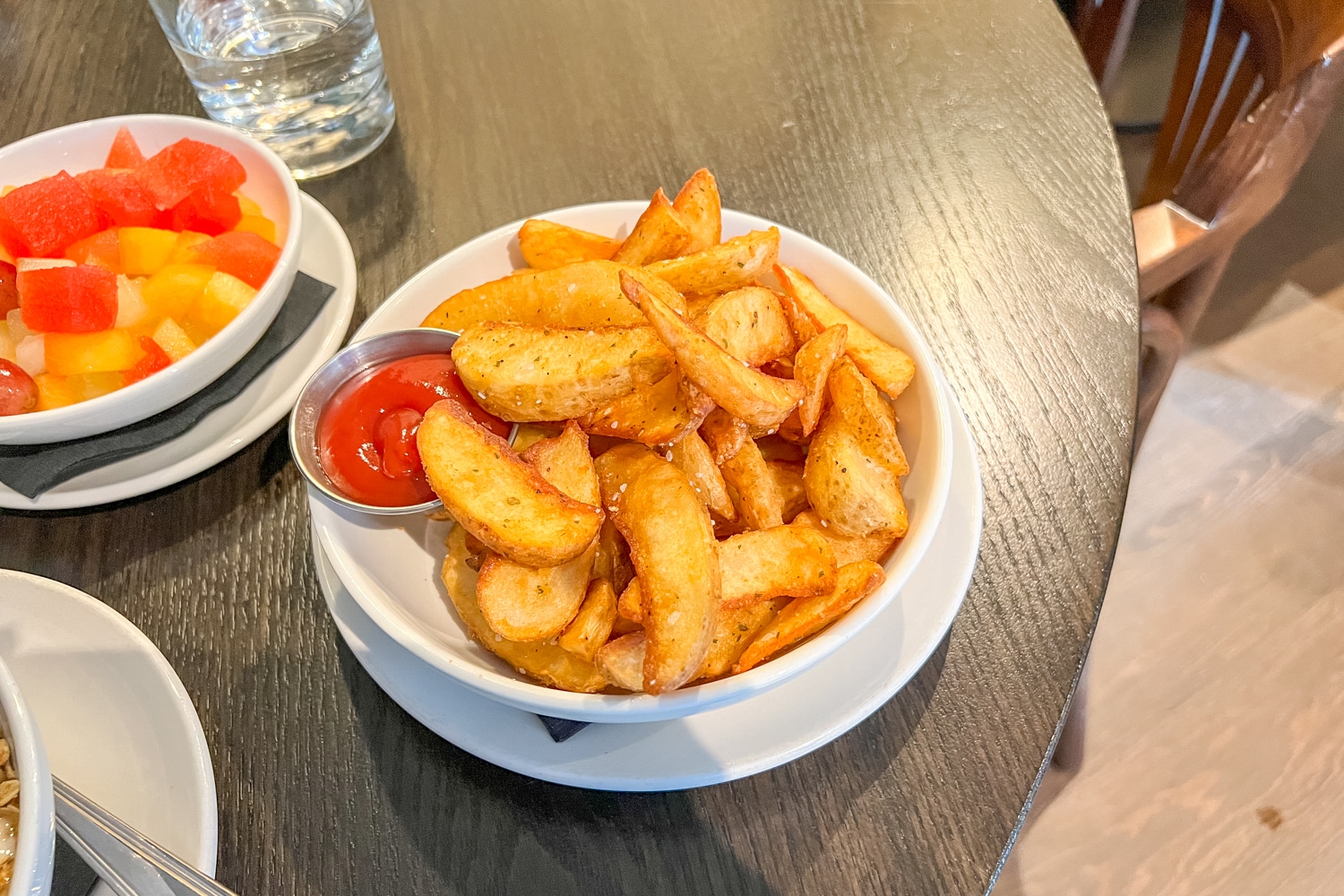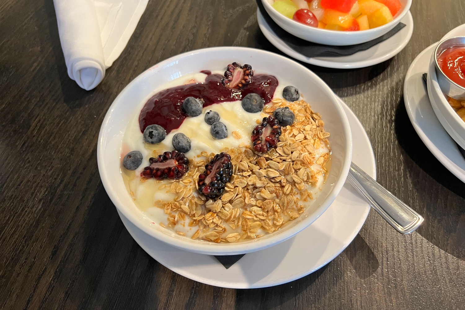Having indulged in a rather large dinner at the all-you-can-eat Gyubee Japanese BBQ across the street the previous night, I opted for a lighter breakfast of yogurt and granola alongside breakfast potatoes and a bowl of fruit.