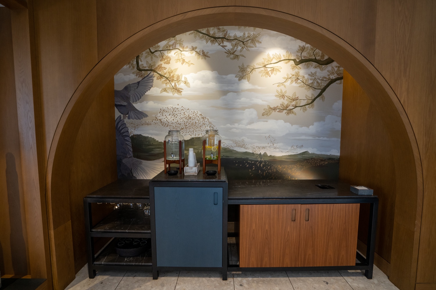The lobby’s welcome area has self-serve coffee and tea in the mornings, lemon water during the daytime, and is also set up for occasional surprise spreads like mulled wine during the holiday season.