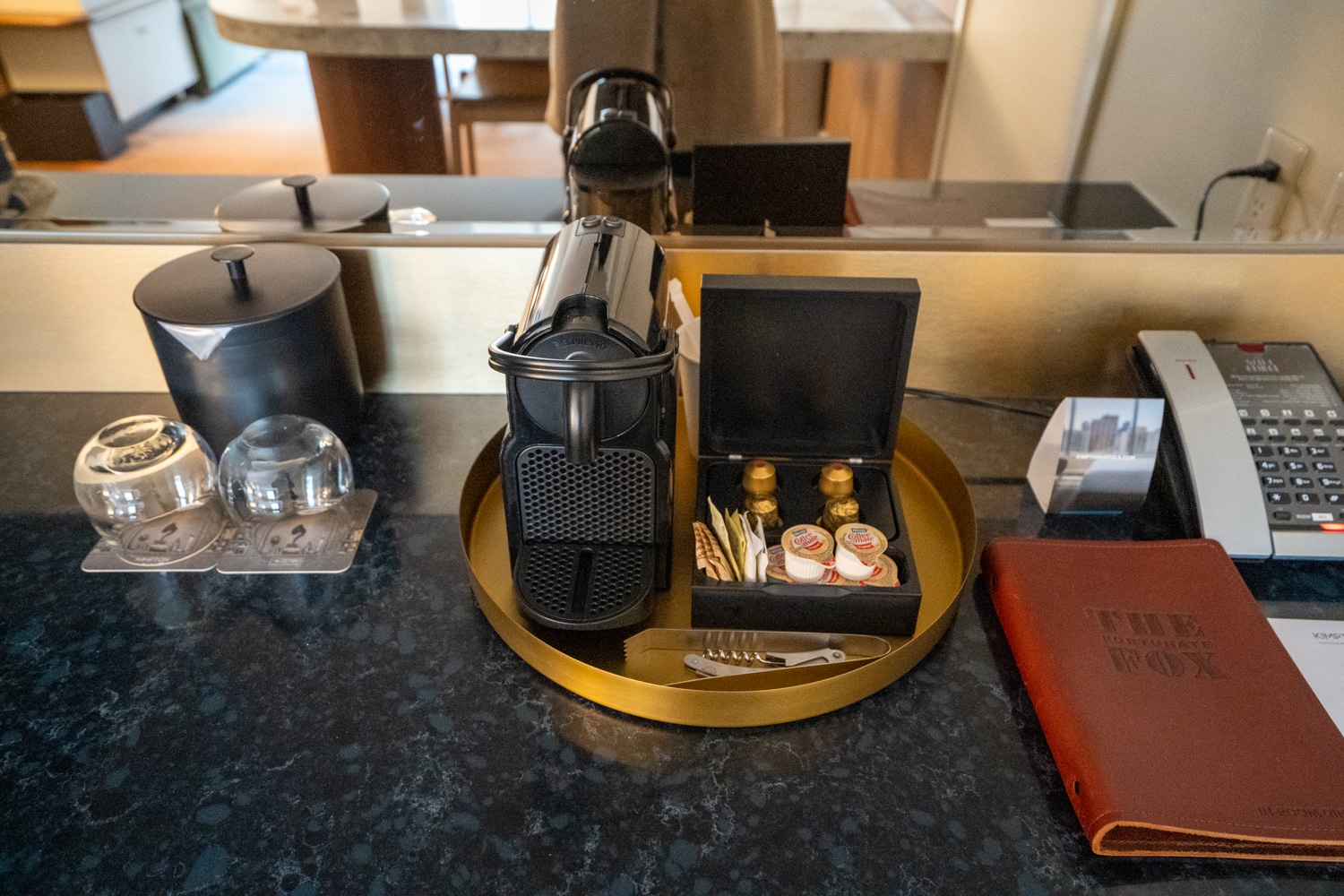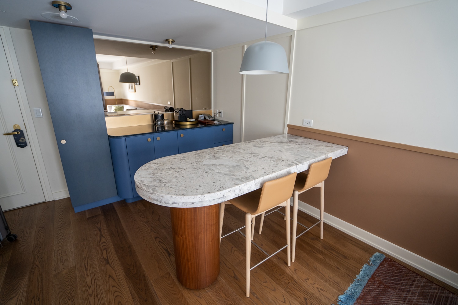 The kitchenette featured a lovely deep blue tone and was home to a Nespresso coffee maker. Fronting the kitchenette is a curved marble island with seating for two.