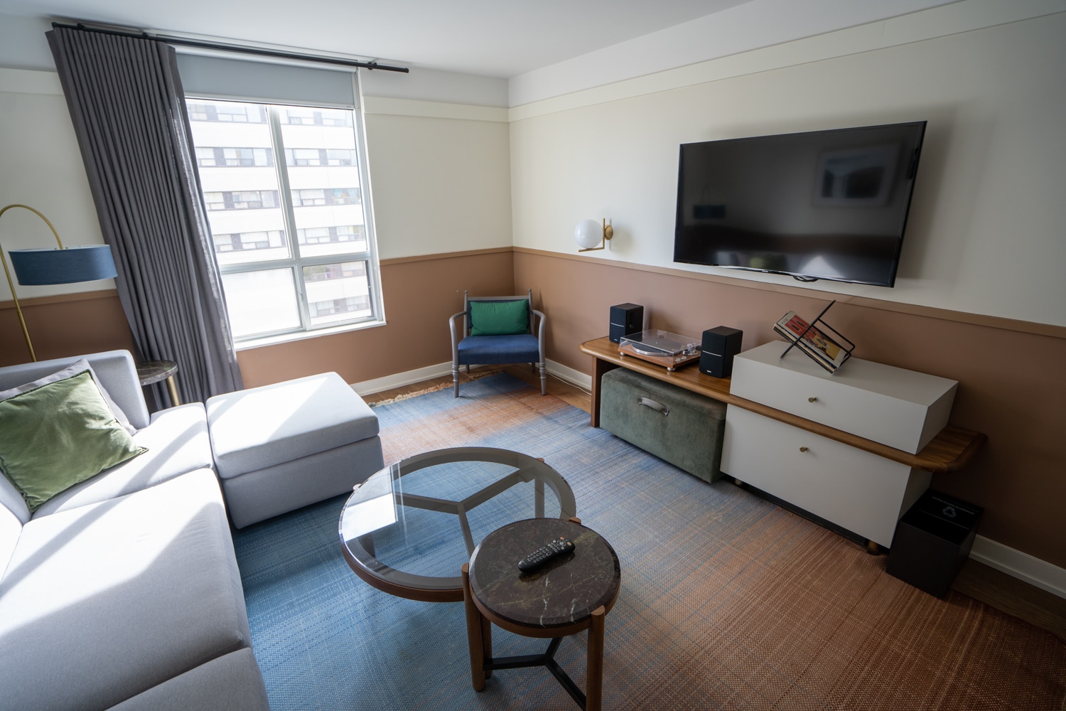 At the far side of the room, the living room featured a soft grey sectional, with a flat-screen TV mounted to the opposite wall. A unique record player is found just below the TV, and a small reading chair is nestled into the corner.