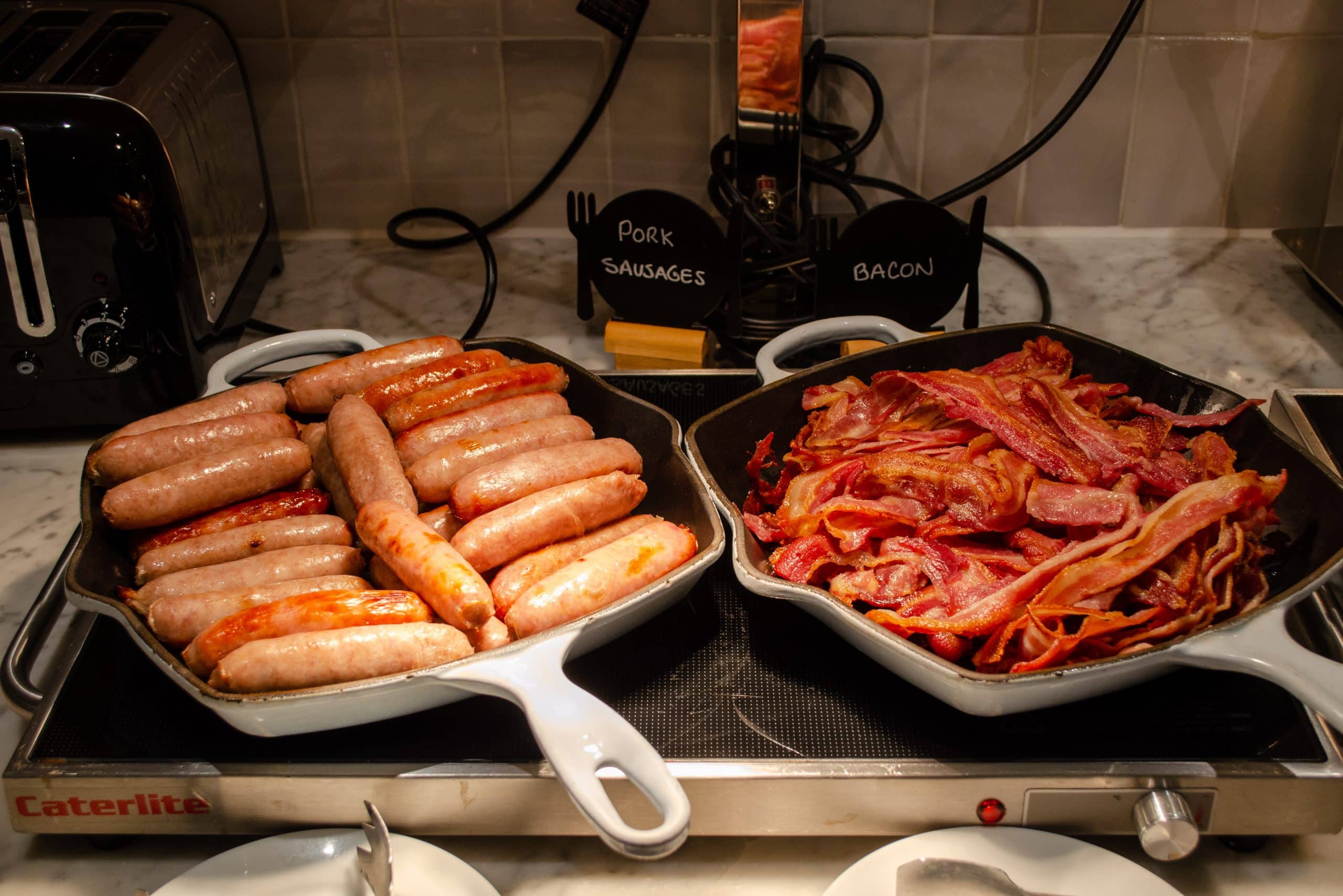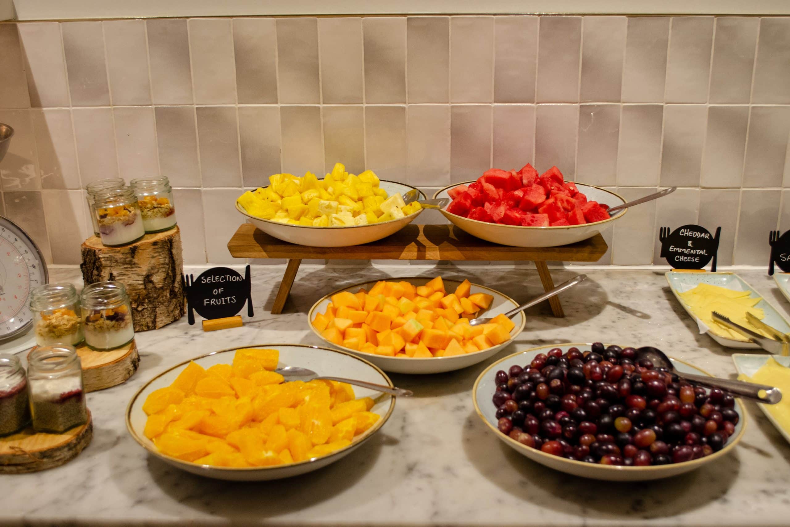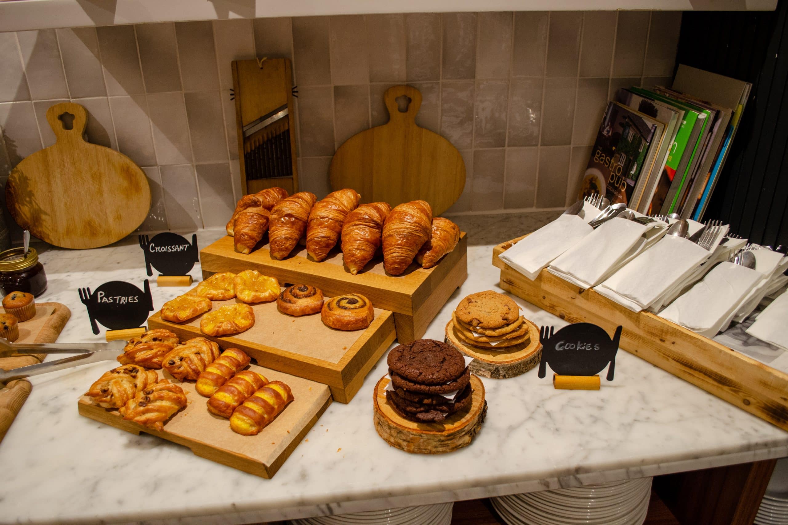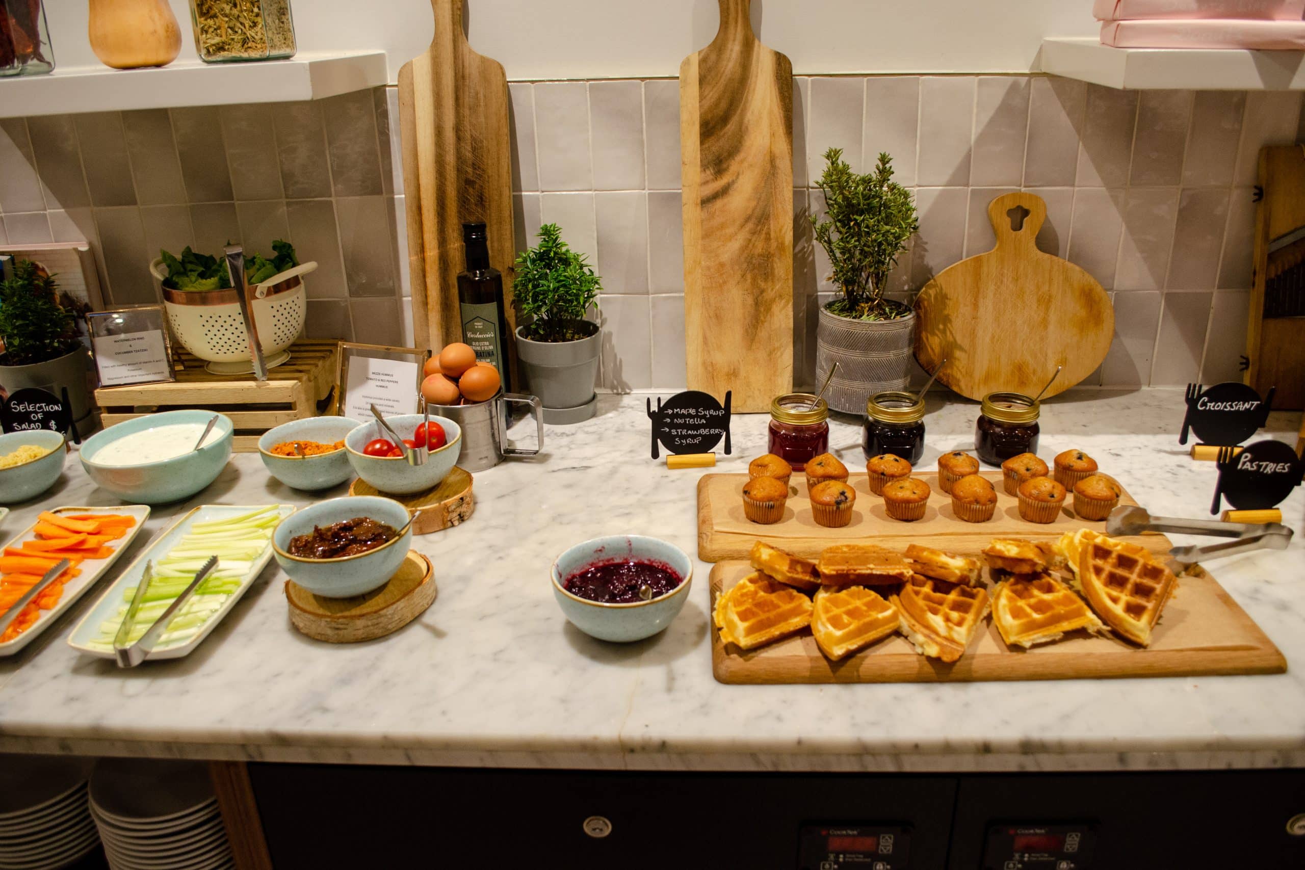 The breakfast buffet included a variety of pastries, waffles, bread, fresh fruit, cold cuts, sausages, bacon, baked beans, and scrambled eggs. For drinks, you can help yourself to some juices, teas, or coffee from an automatic machine.