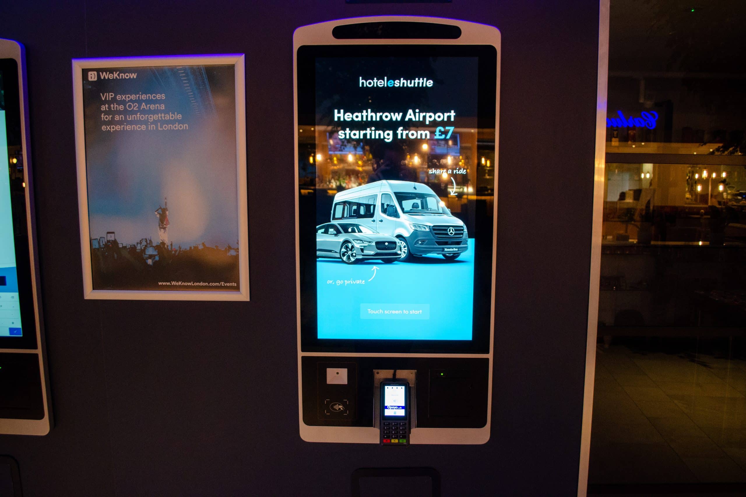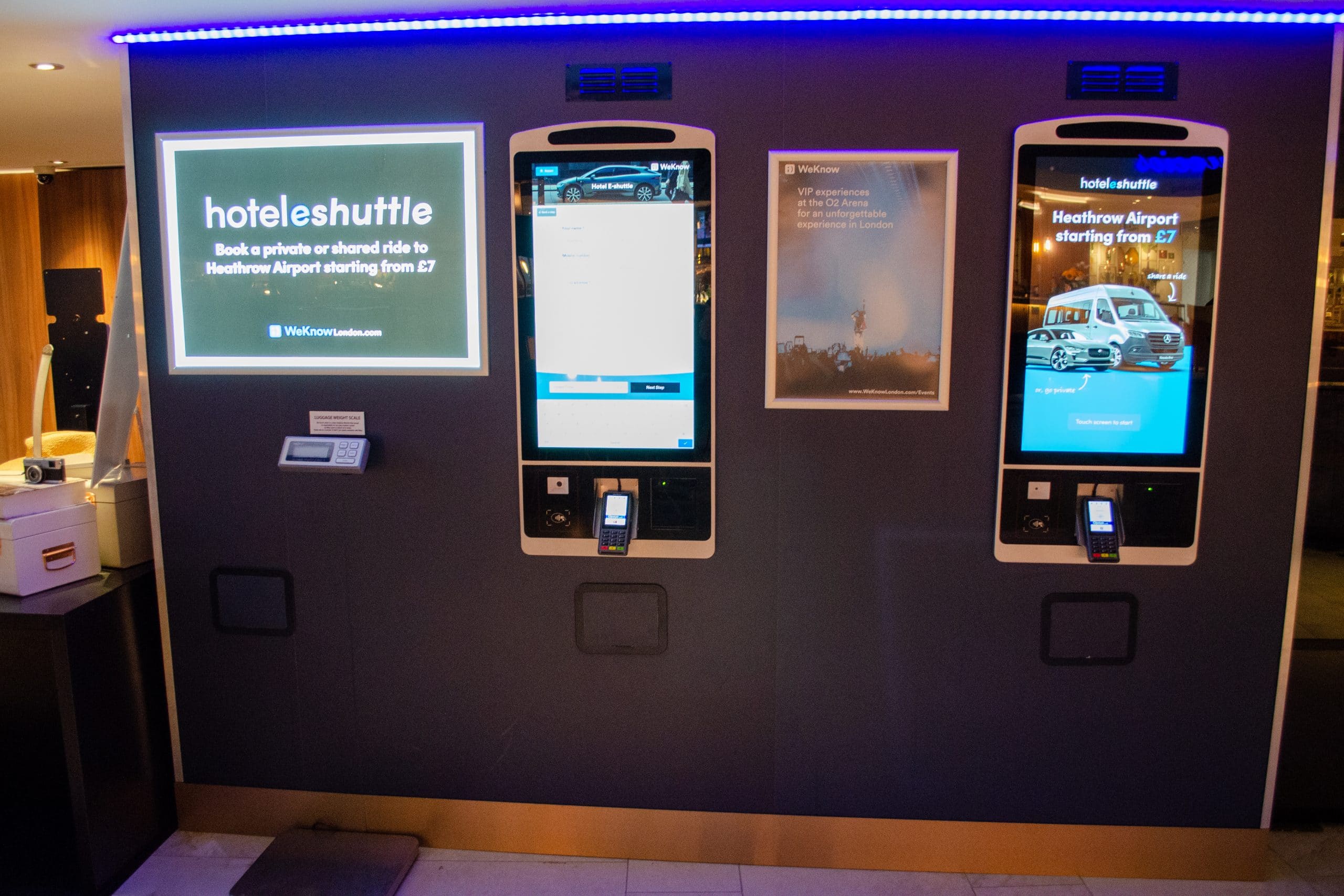 The hotel doesn’t offer a complimentary airport shuttle. Rather, there’s an automated kiosk in the lobby, and you can arrange for either a private or shared shuttle with Hotel E-shuttle using the machine.