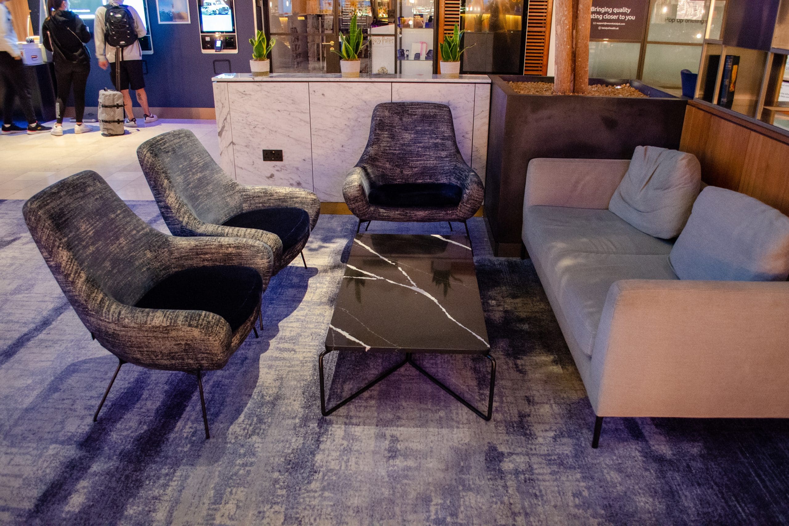 The lobby lounge has a variety of seating available. The space blends into the bar area at the hotel’s restaurant, Carluccio’s.