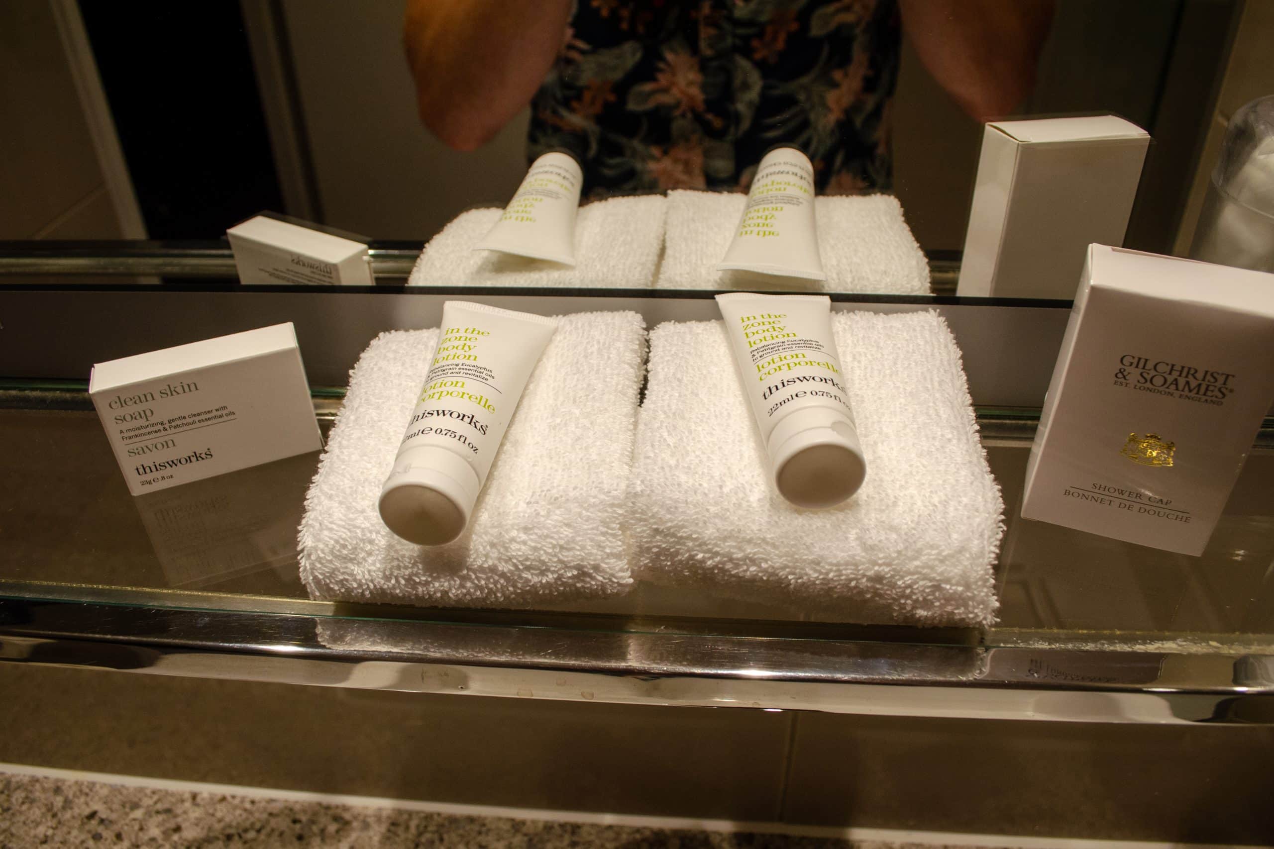 The shower had large, refillable bottles with shampoo, conditioner, and body wash by This Works. You’ll also find some single-use This Works amenity bottles next to the sink, as well as some soap.