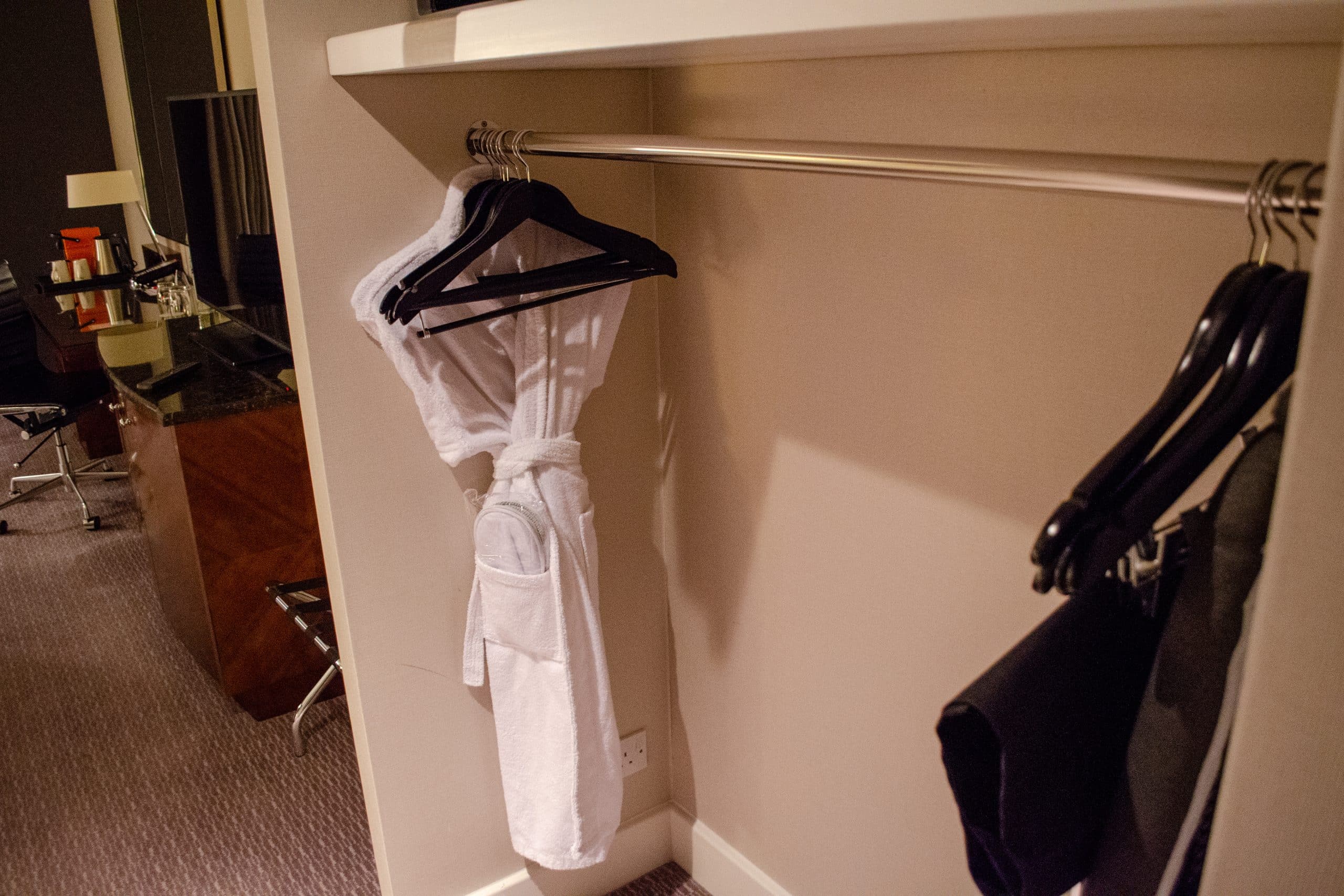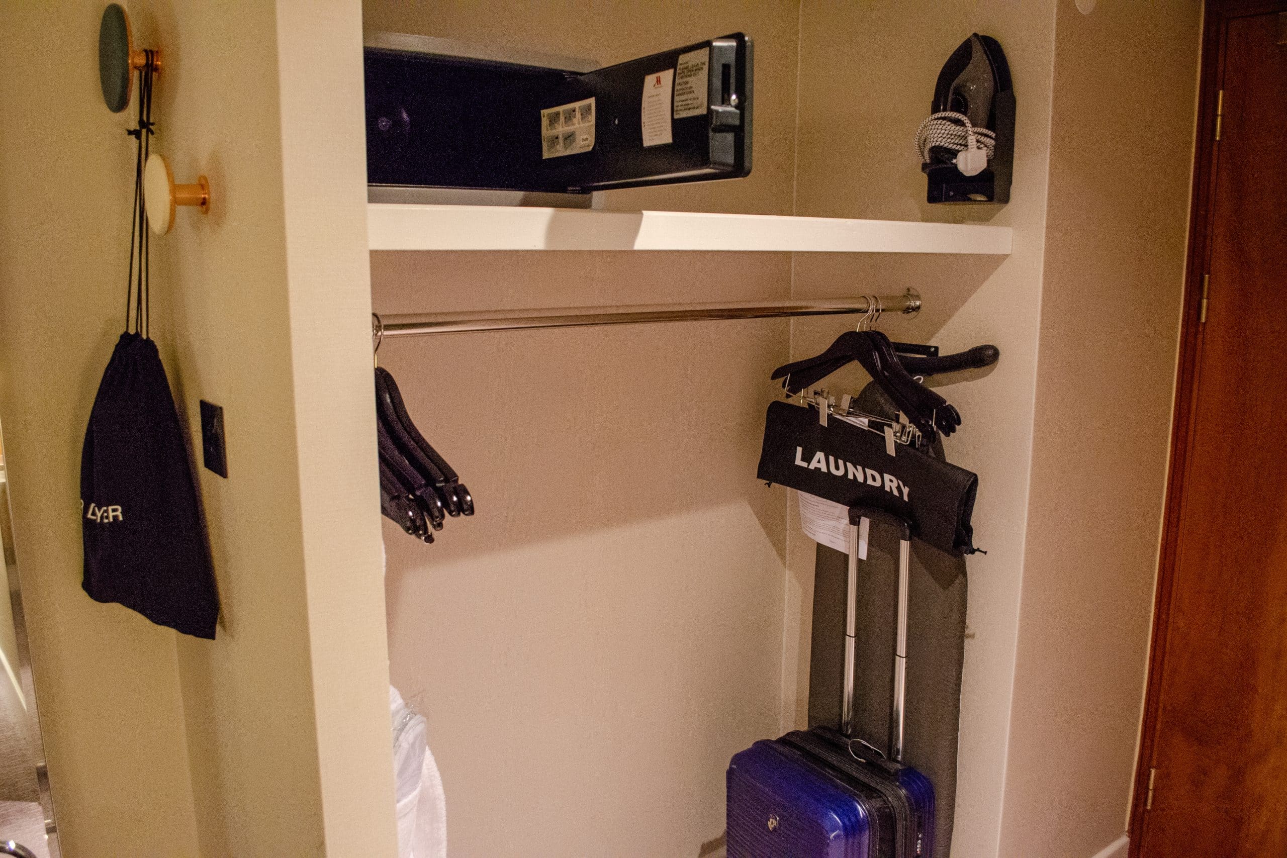 Moving back towards the entrance, there’s an open closet with a luggage rack, a safe, a bathrobe, an ironing board, and an iron.