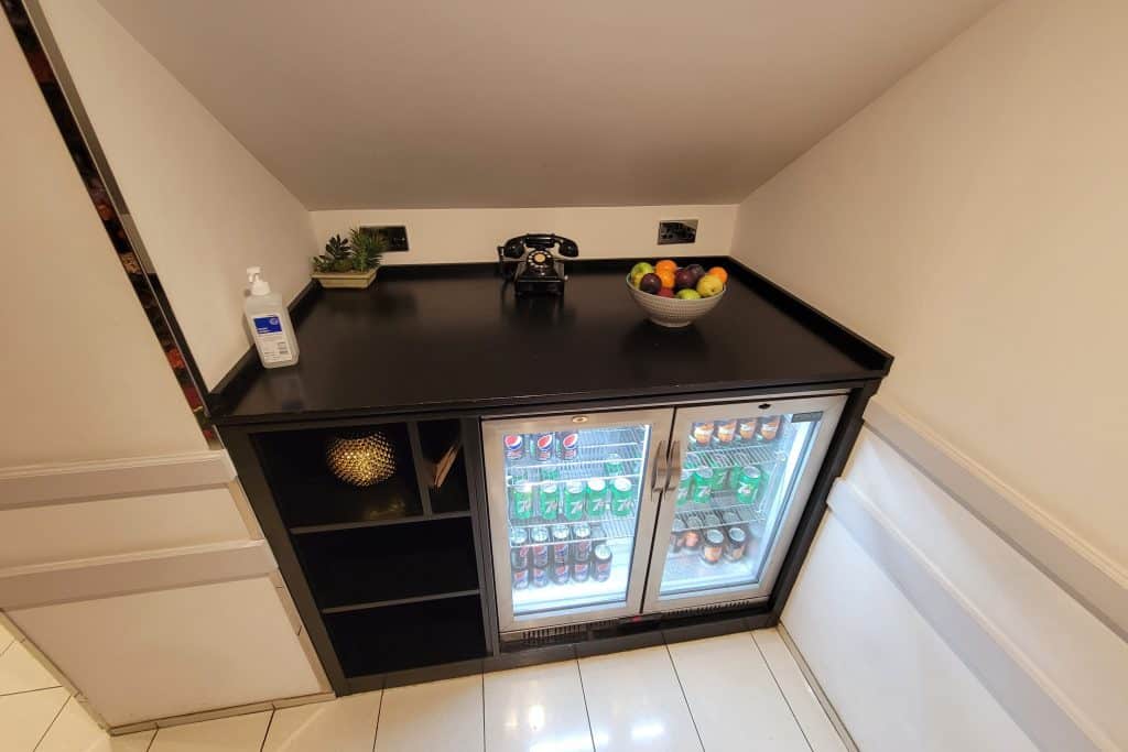 The main living area was enormous by London standards, boasting a desk, a dining table with chairs, a lounging sofa area, a bar top, and a television. I know this sounds normal by North American standards, but it was the largest hotel room I’ve ever been in in Europe!