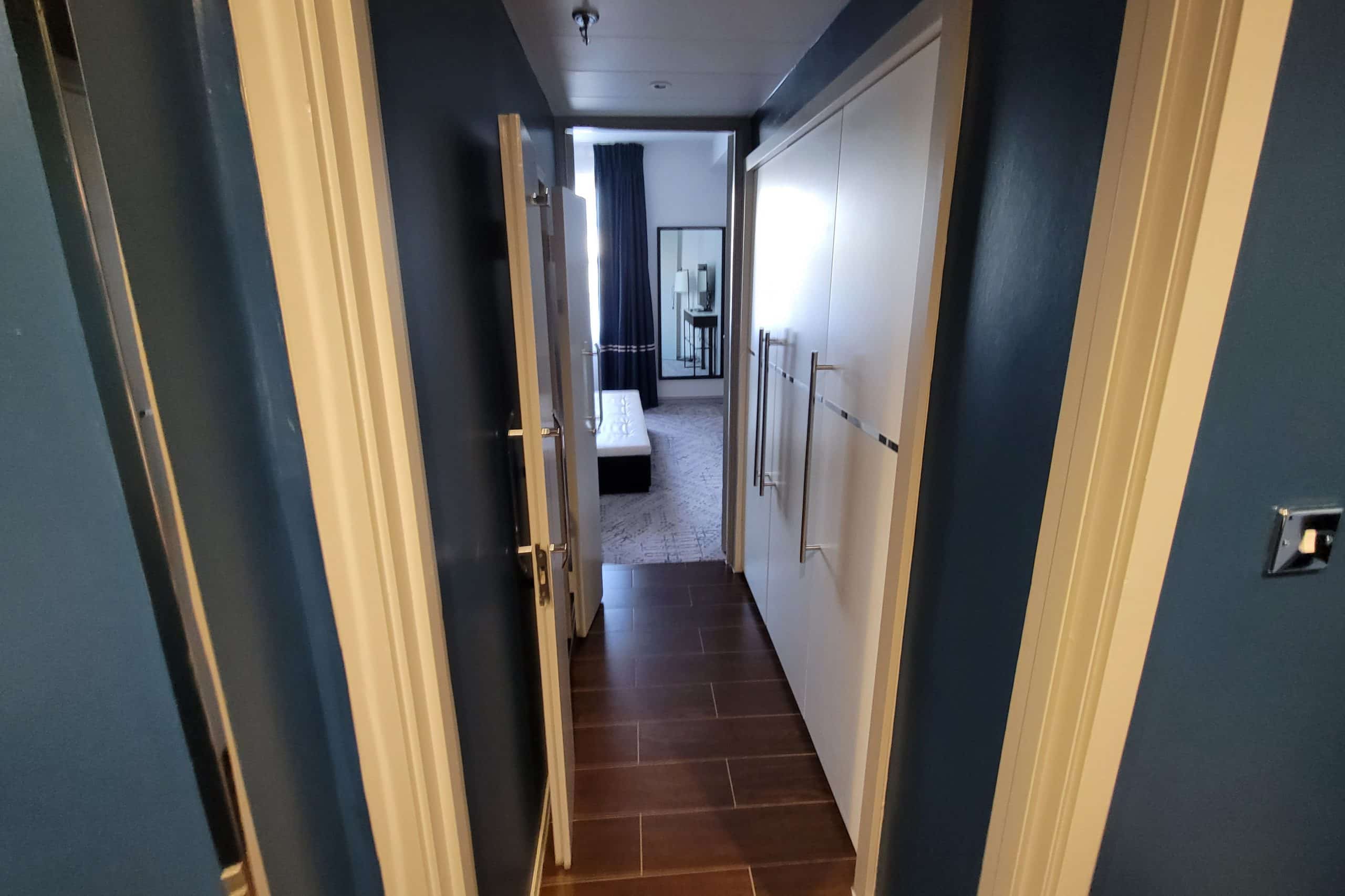 The striking blue and white colour scheme distracted a little from the chipped plaster and worn edges one could see; however, given the age of the hotel and its high usage, this can be forgiven. There was also a spacious closet in the entry hall with some bathrobes, as well as a buffet and minibar with complimentary bottled water and chocolates.