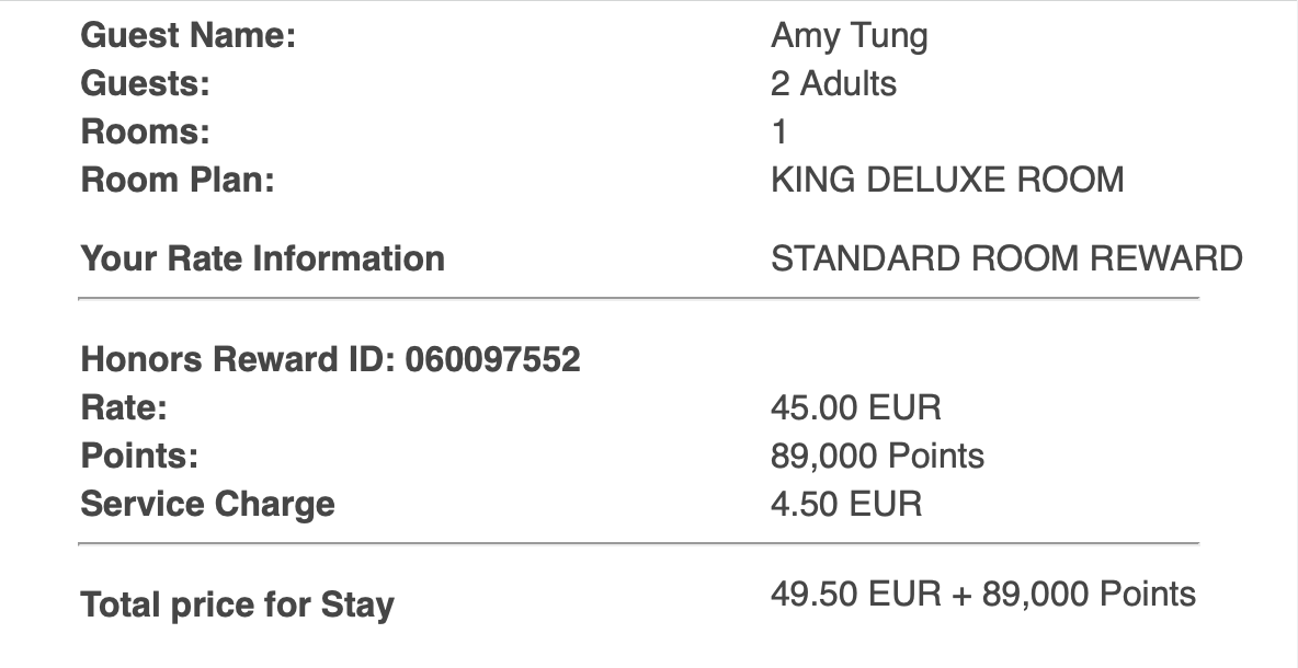 My points balance at the time was only at 89,000 points, but thankfully Hilton has a flexible Points & Money option, so for €49.50 more, I was able to secure my booking.