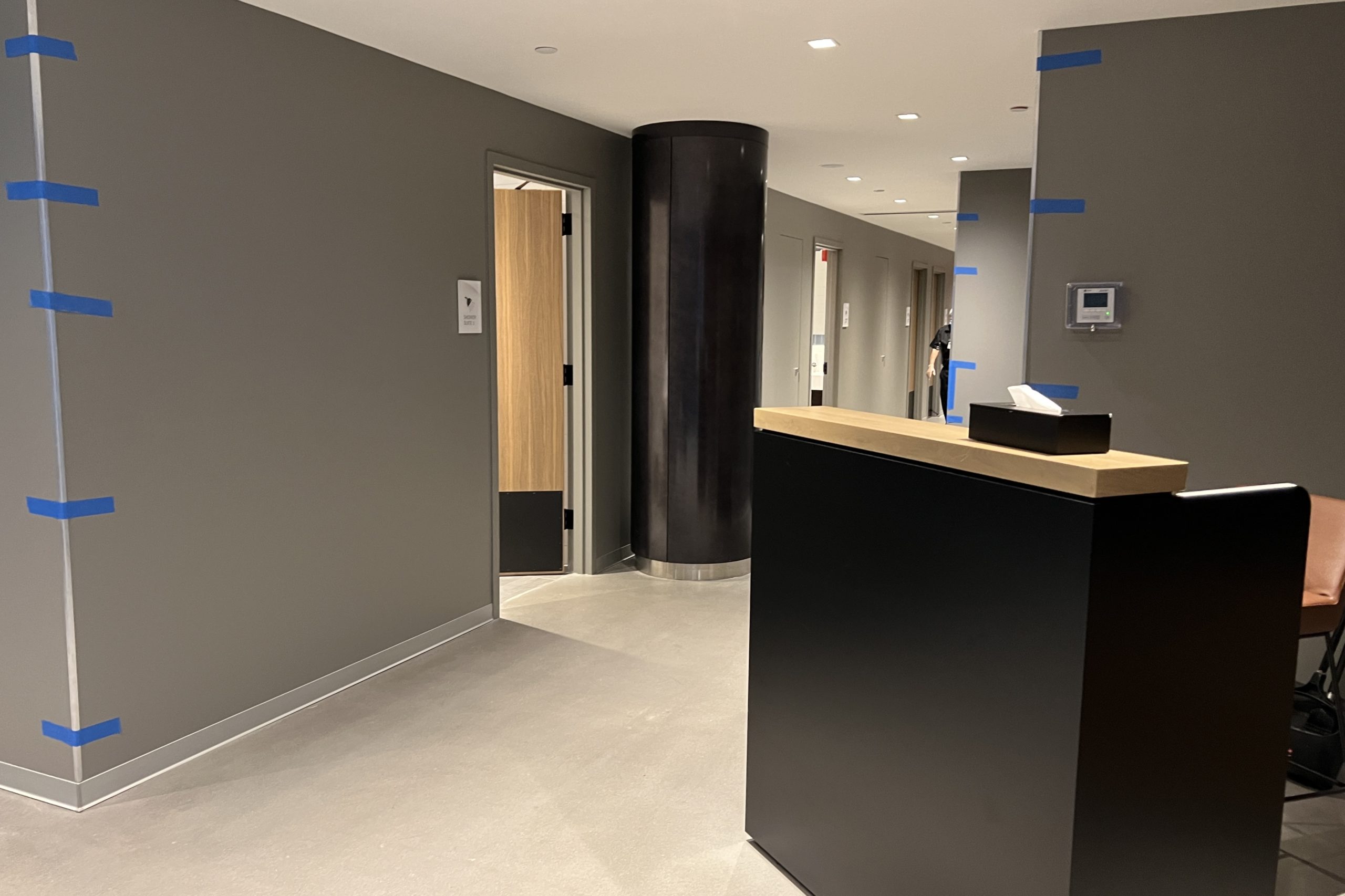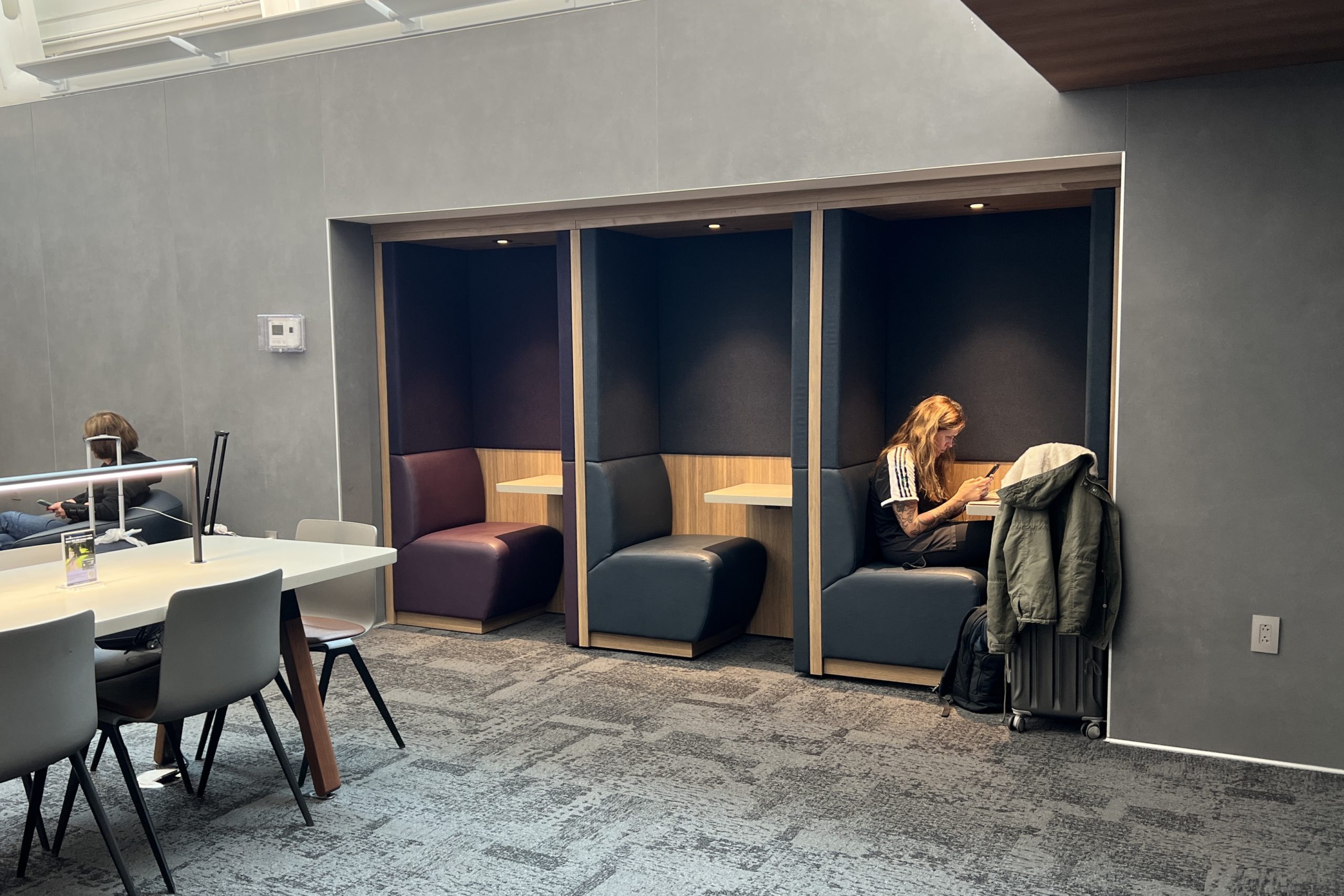 When you first enter the lounge, you’ll notice that it’s well-lit, large, spread-out and, clean. It has a modern look to it, with grey walls and floors, as well as black and wooden accents for furnishings.