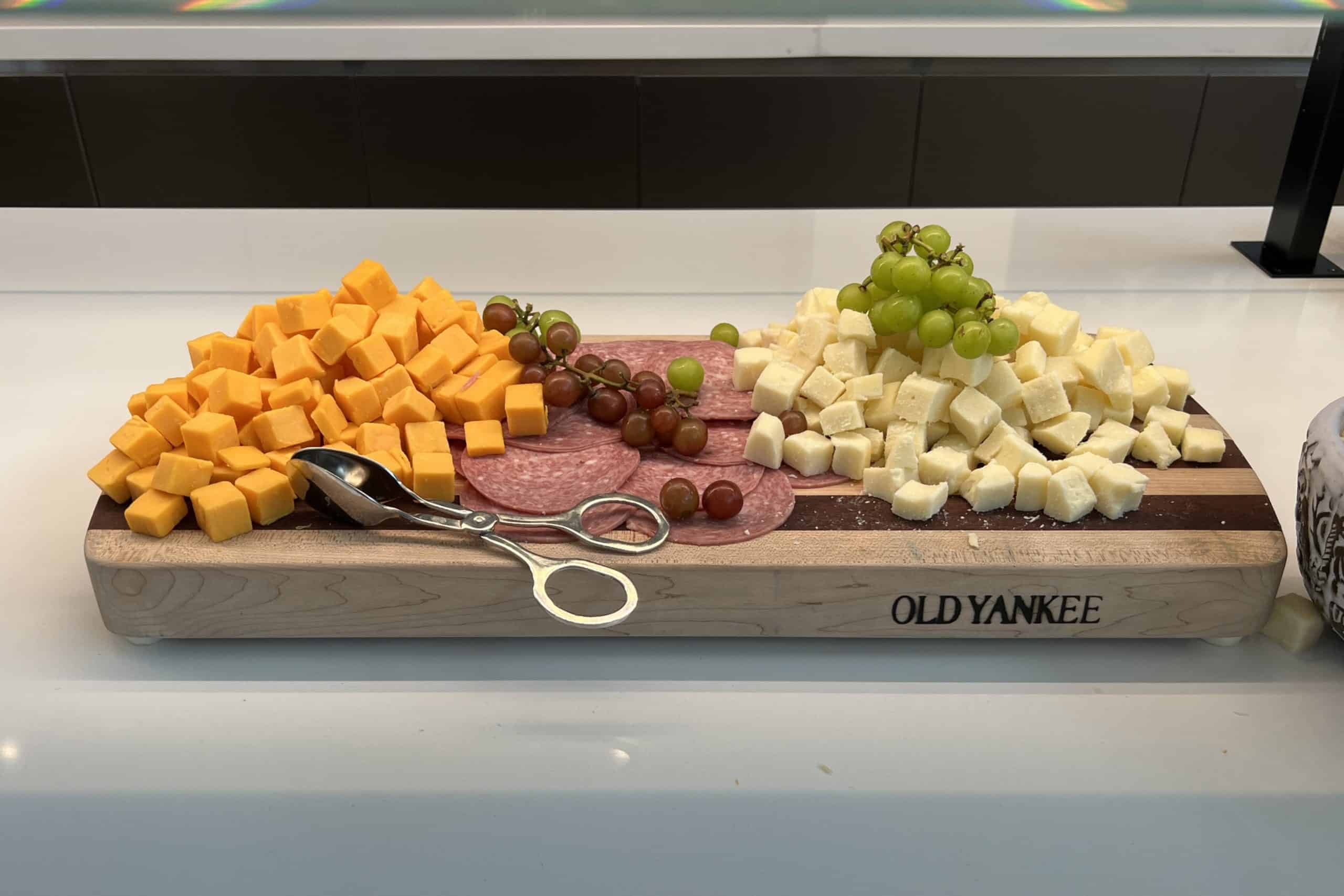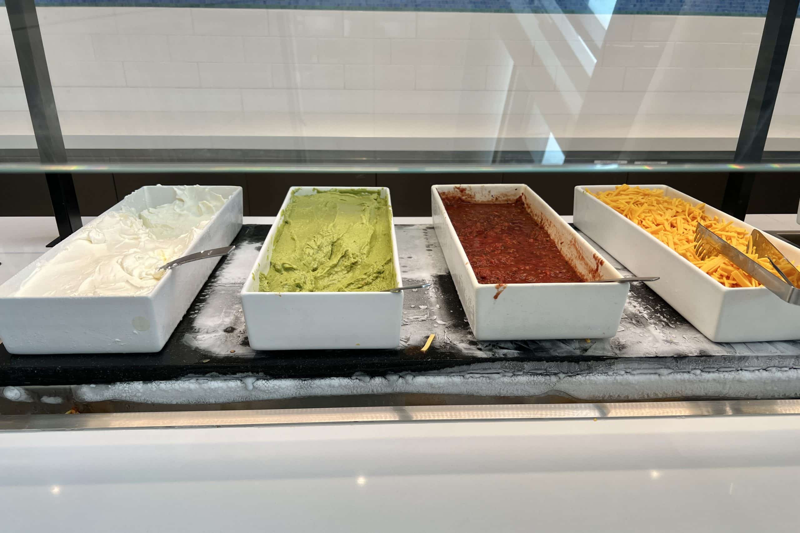On the other side, there’s a soup station and charcuterie board, a salad bar, and the main hot meal stations. During our visit, this consisted of a taco station with a choice of chicken or pork and a variety of toppings.