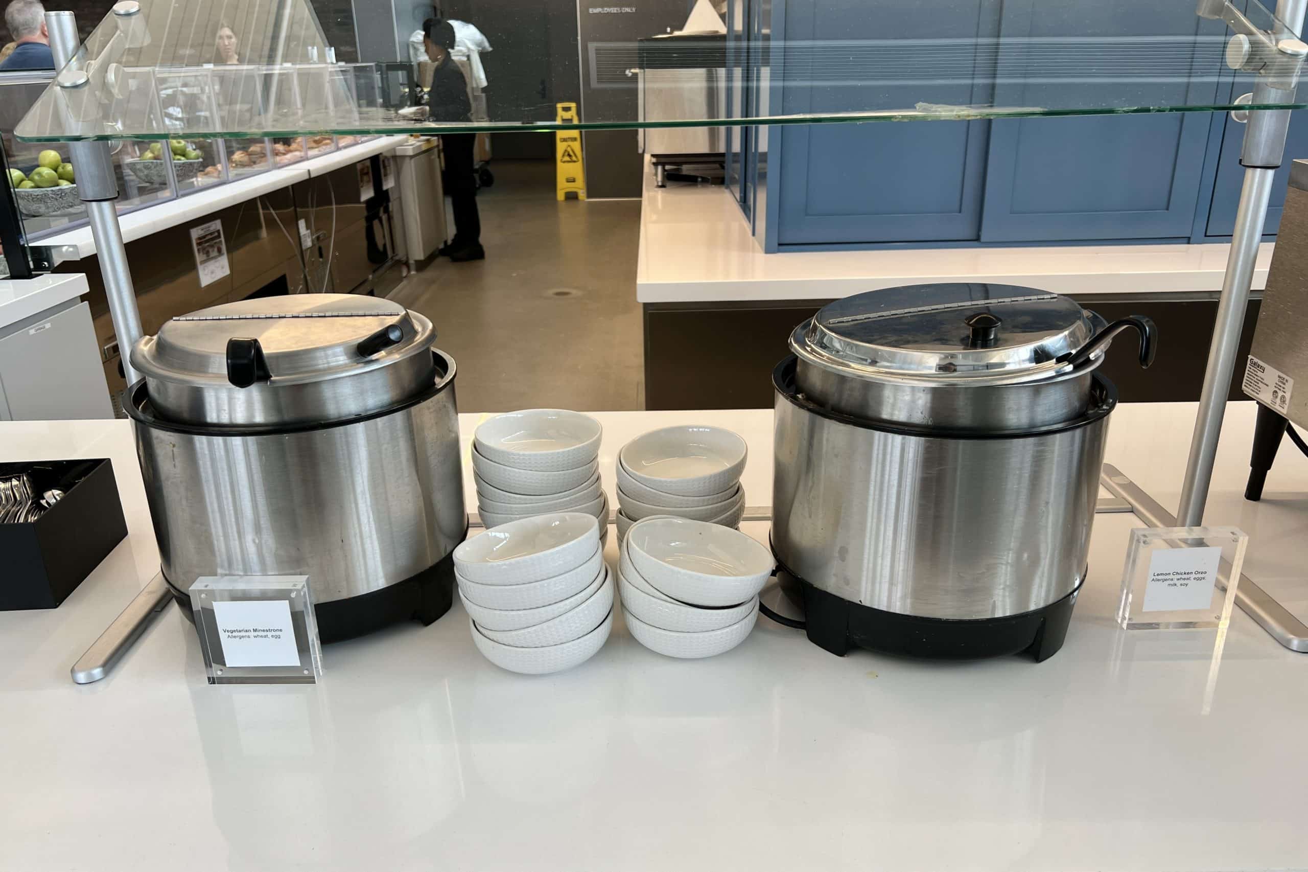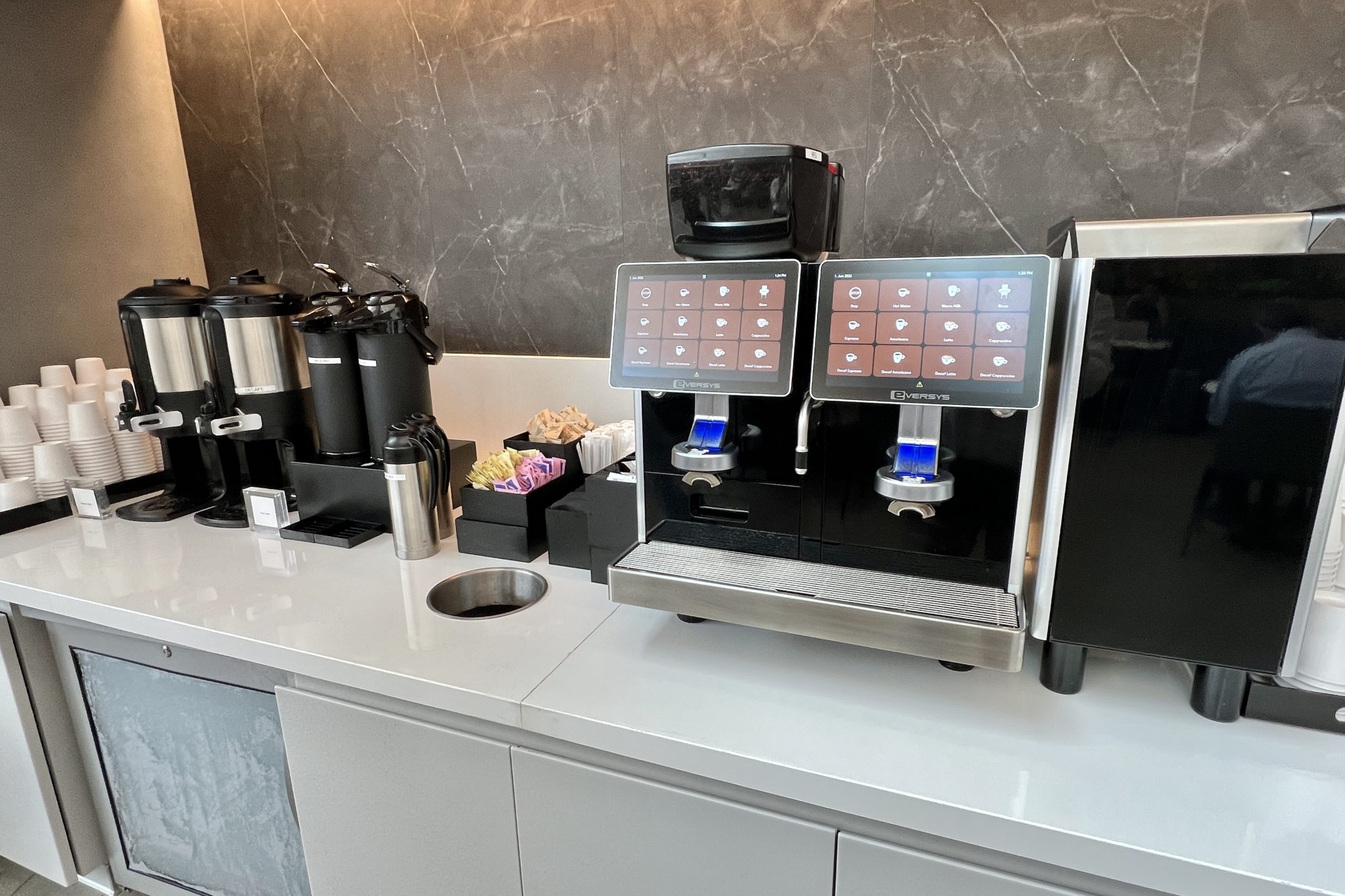 There is also a hot beverage station, snack mix dispensary, and a few cold drink dispensers containing water with fresh lemon and lime slices or grapefruit juice.