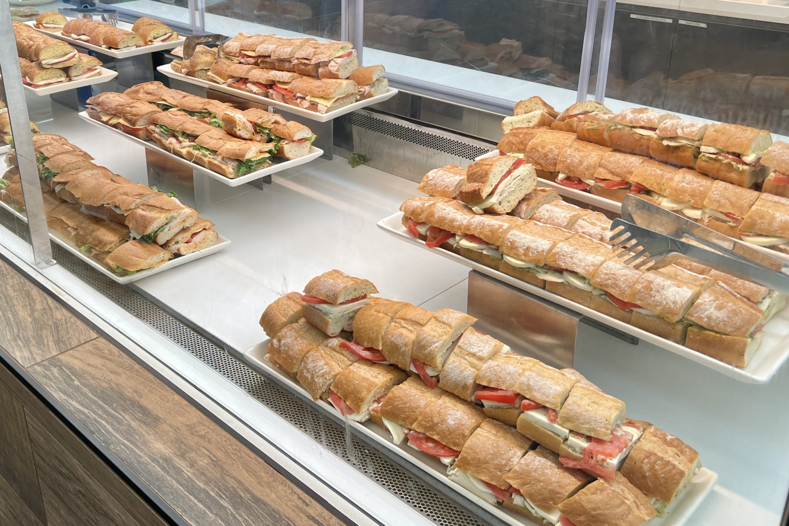 There is a long buffet station with different food options spread along it. On one end, there are sandwiches and dessert.