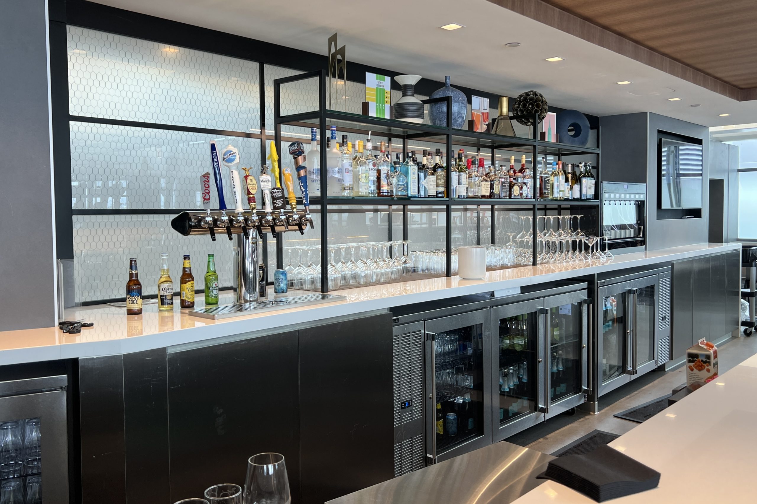 The coffee bar is at the end of the station and staffed by a couple of baristas. Around the corner is the alcohol bar, which offers a great selection of complimentary drinks, including draught beer, wines, and spirits.