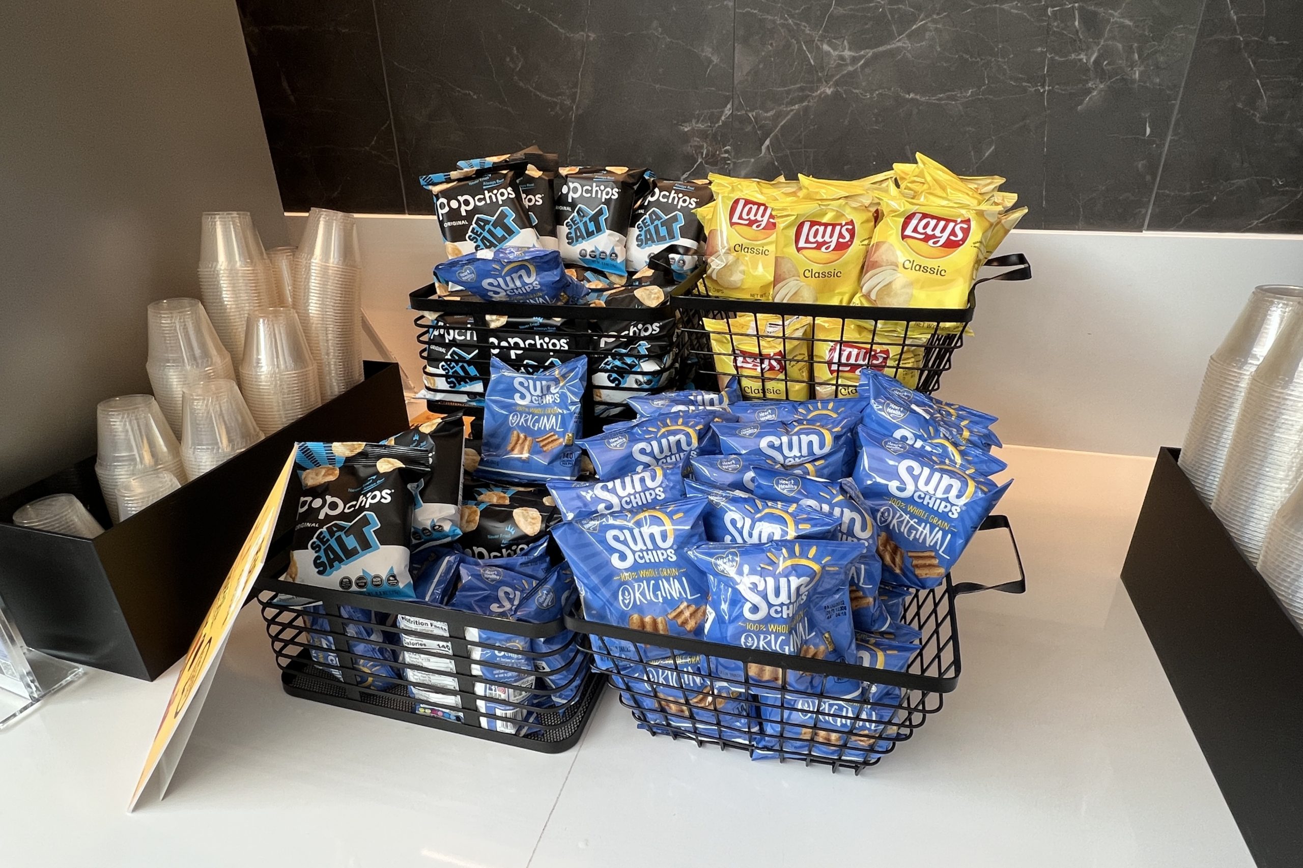 The station has a variety of salty snack options, including Doritos, Sun Chips, Lays, pretzels, and popcorn chips.