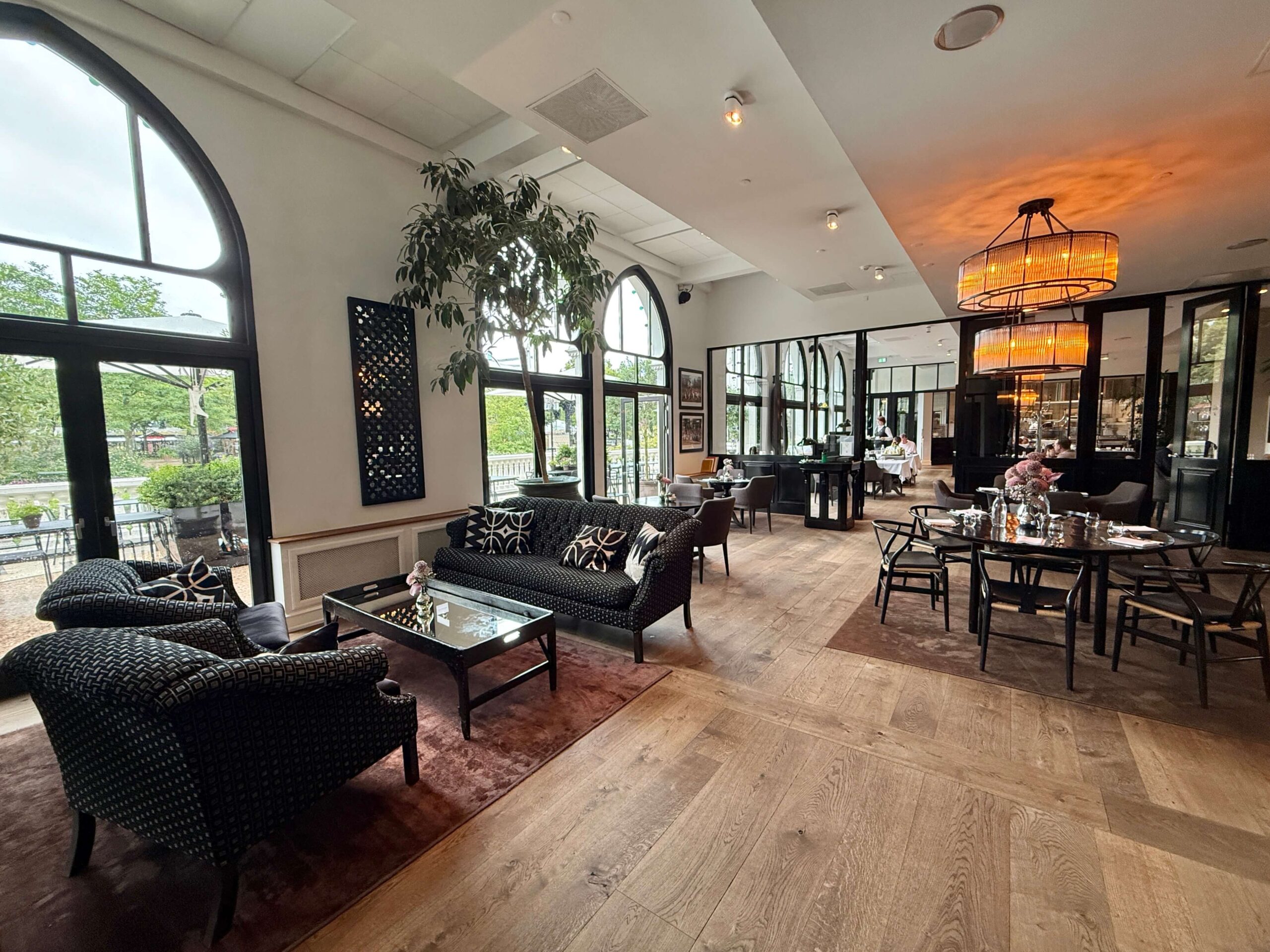 The floor-to-ceiling windows flood the space with natural light and provide a view over Tivoli Gardens, giving the room a bright and airy feel.