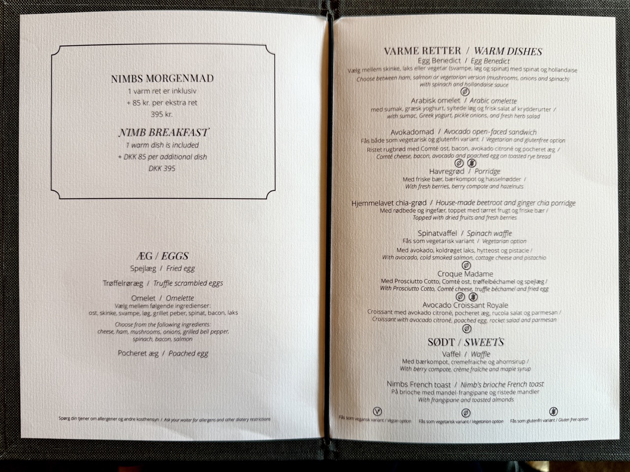 Breakfast is also served at Nimb Brasserie and sets the tone for the day with a smaller but refined buffet of continental and hot selections, including cereals, yogurt, salads, pancakes, pastries, bacon, and more. Guests can enjoy freshly pressed vitality juices, as well as order eggs or a main dish from the à la carte menu, creating a balanced mix of quality and choice.