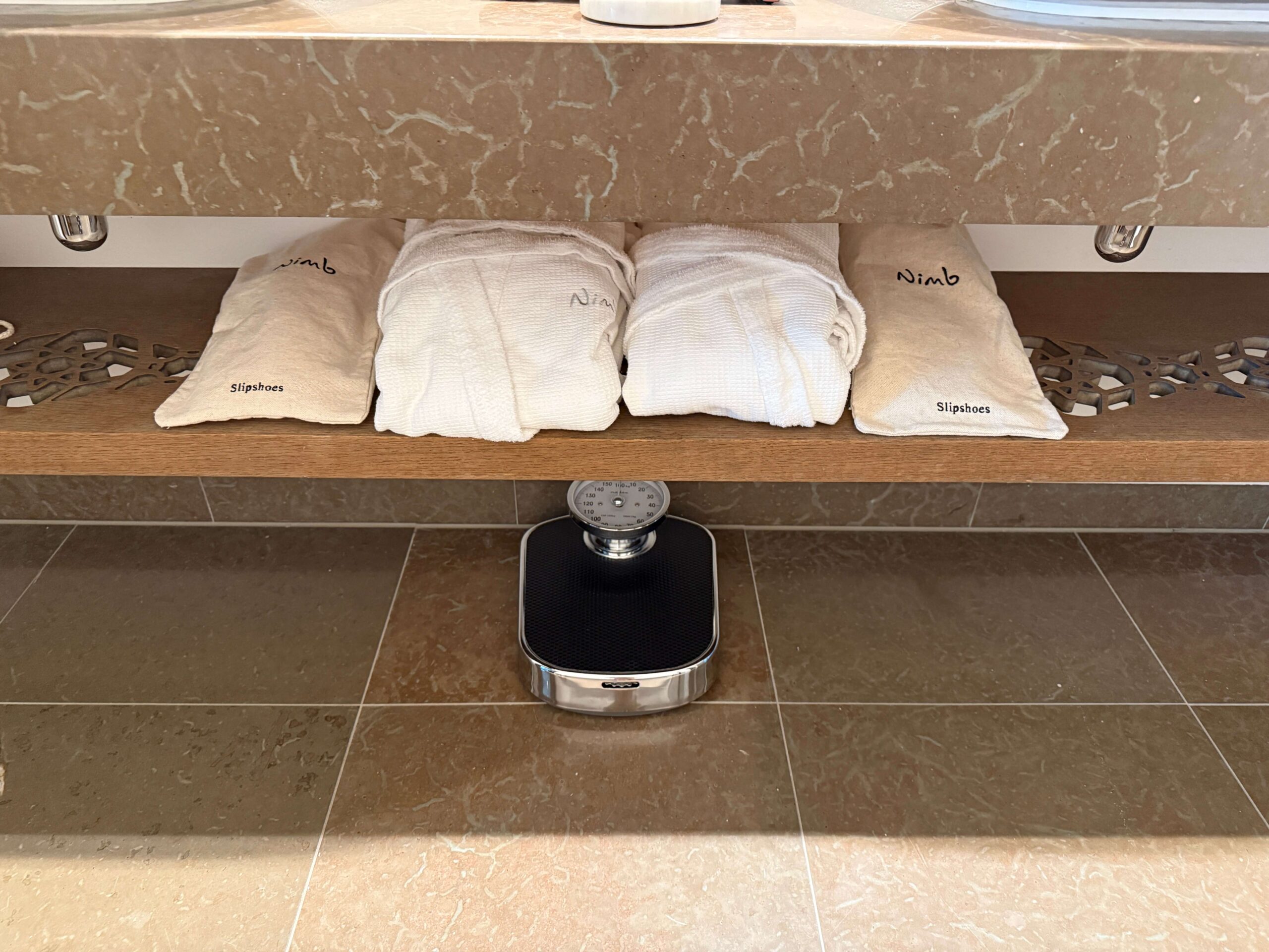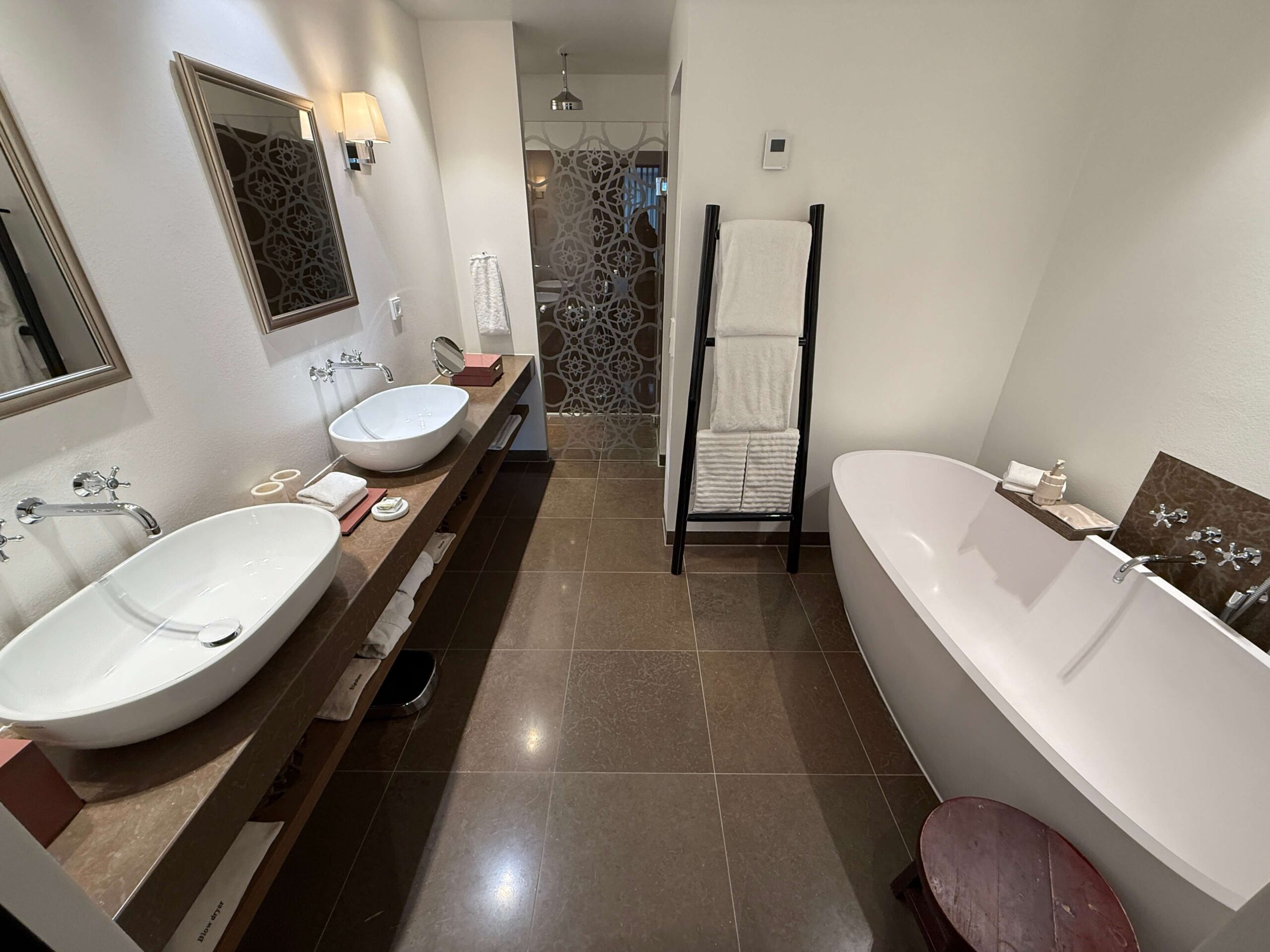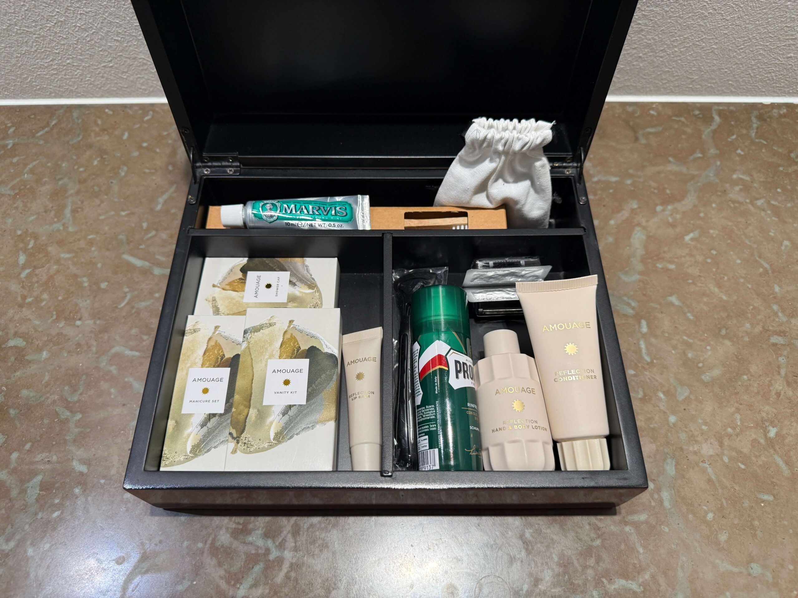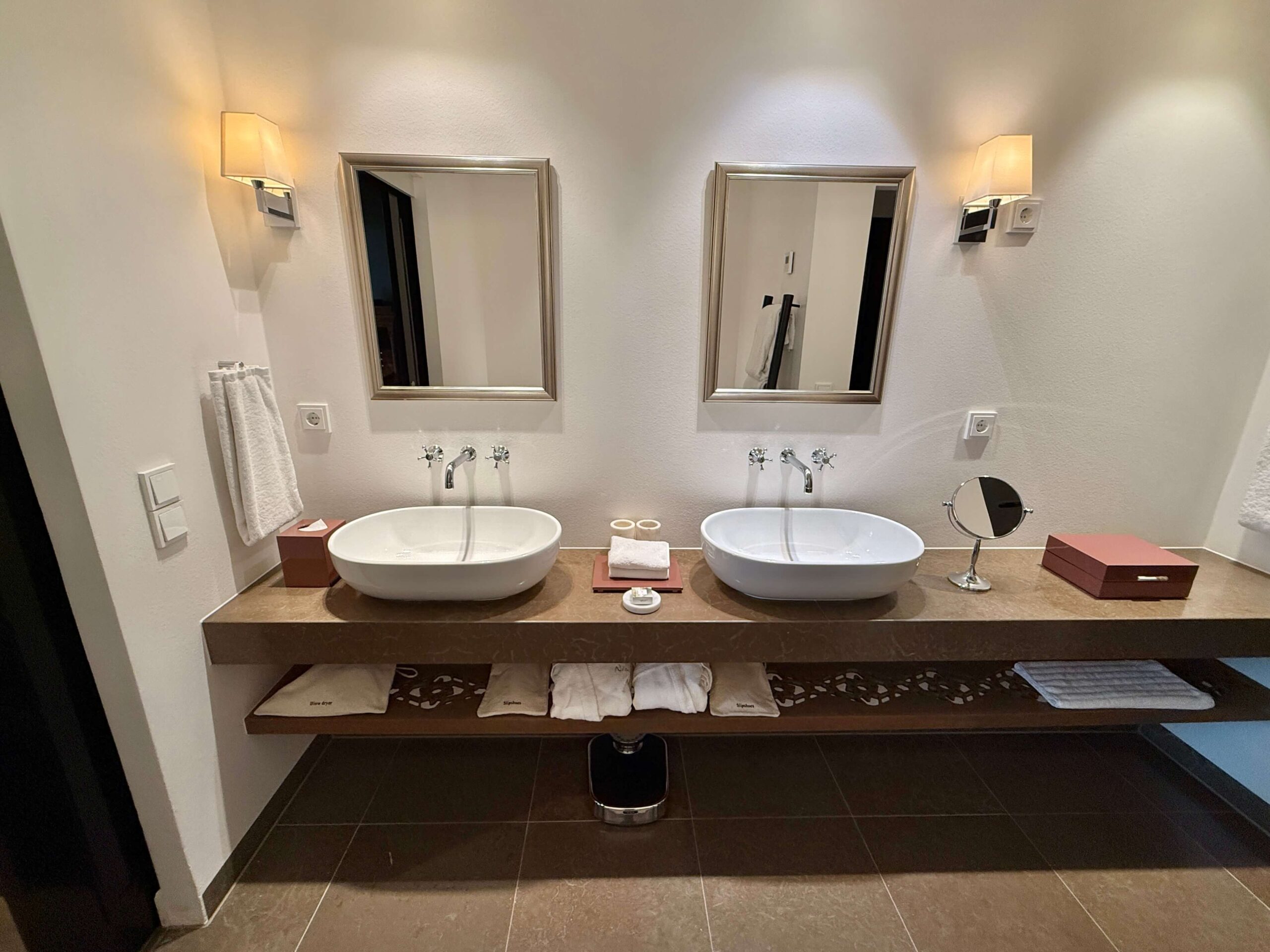 The vanity area offers dual sinks and is stocked with Amouage bath amenities, as well as elevated touches such as hair ties, feminine kits, bath salts, an exfoliating glove, lavender-scented disinfection spray, and even a Dyson hair dryer. Robes and slippers were nicely folded under the vanity.