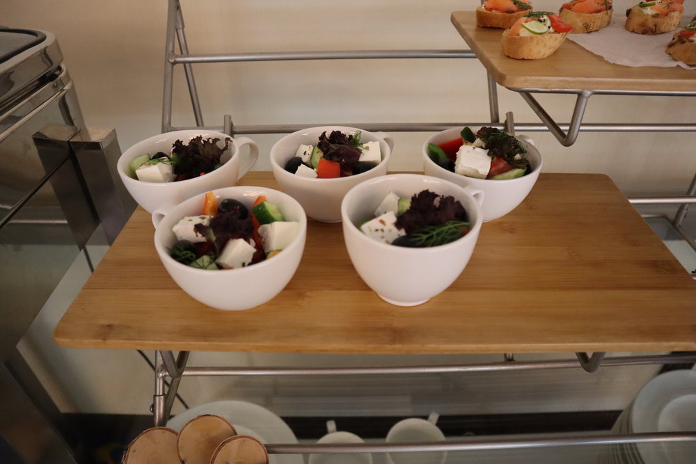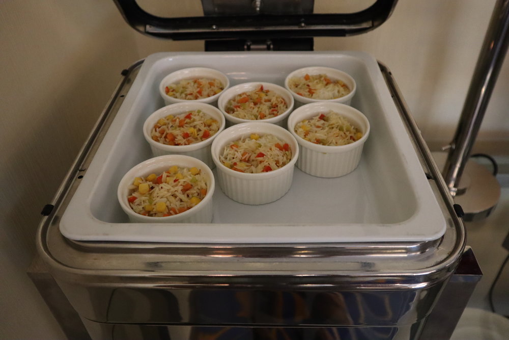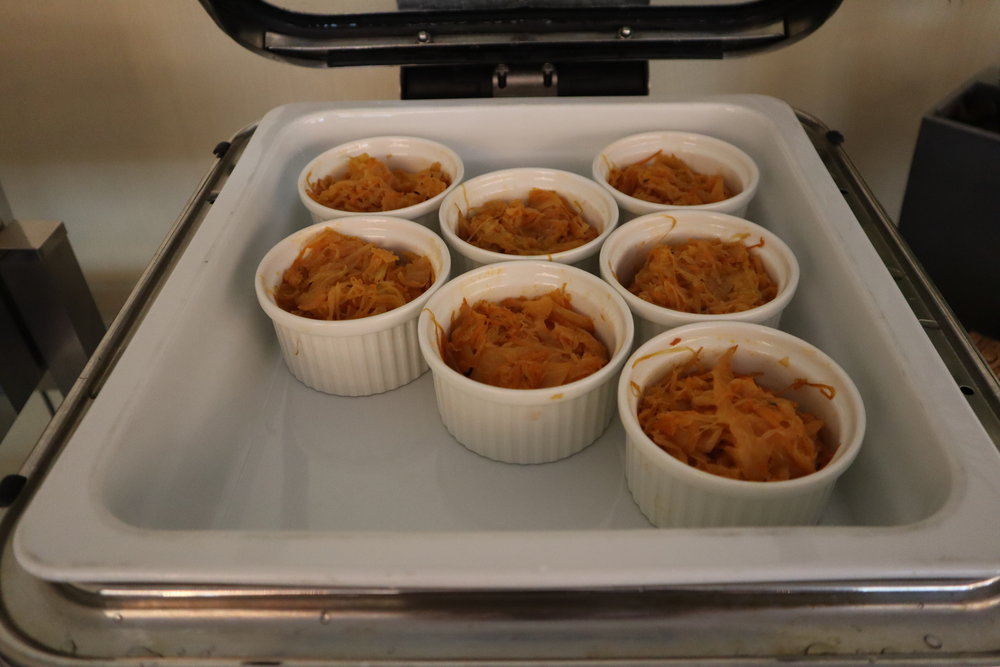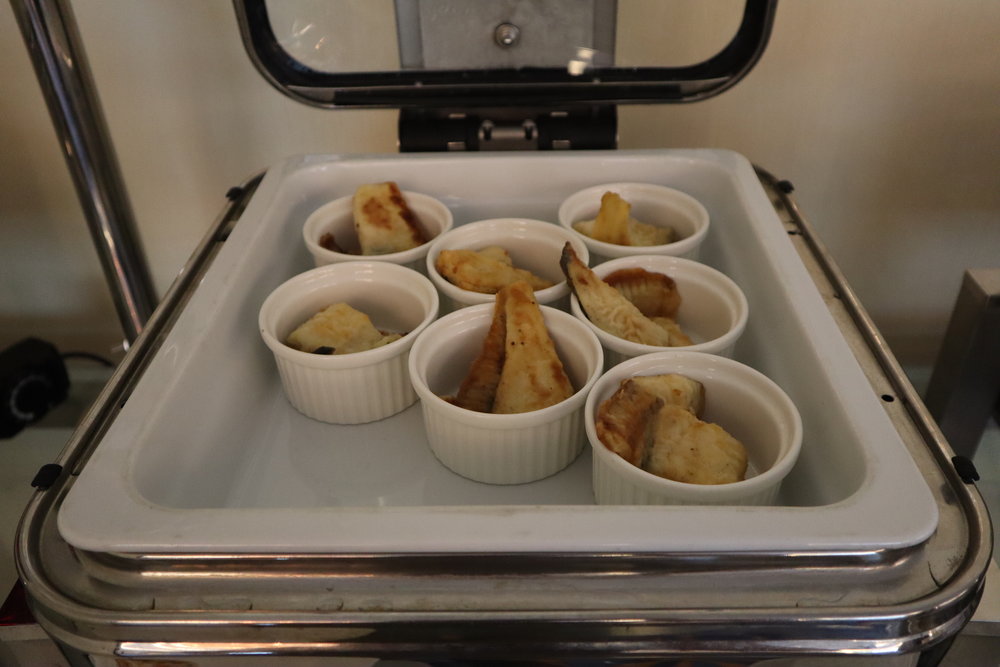 The main dishes rotate every night, but there’s usually a good mix of meat, seafood, vegetarian, and carb options. On this night, we enjoyed chicken cutlets, fish fillets, sweet potatoes, and fried rice. Then you have a wide selection of side dishes as well – typically some light canapés, a salad bowl, a few seafood cocktails, and a cheese plate.