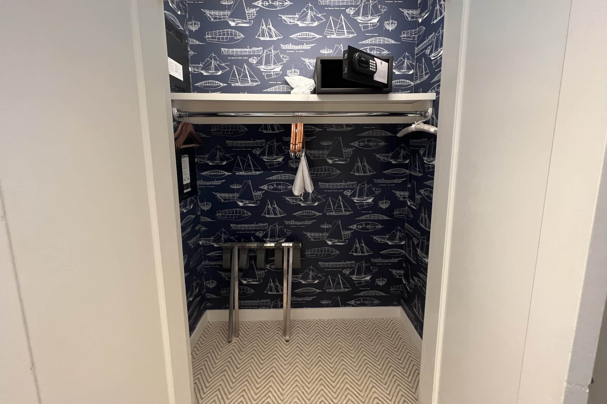 On the other side of the room is the closet, which has a safe inside, and then the bathroom.
